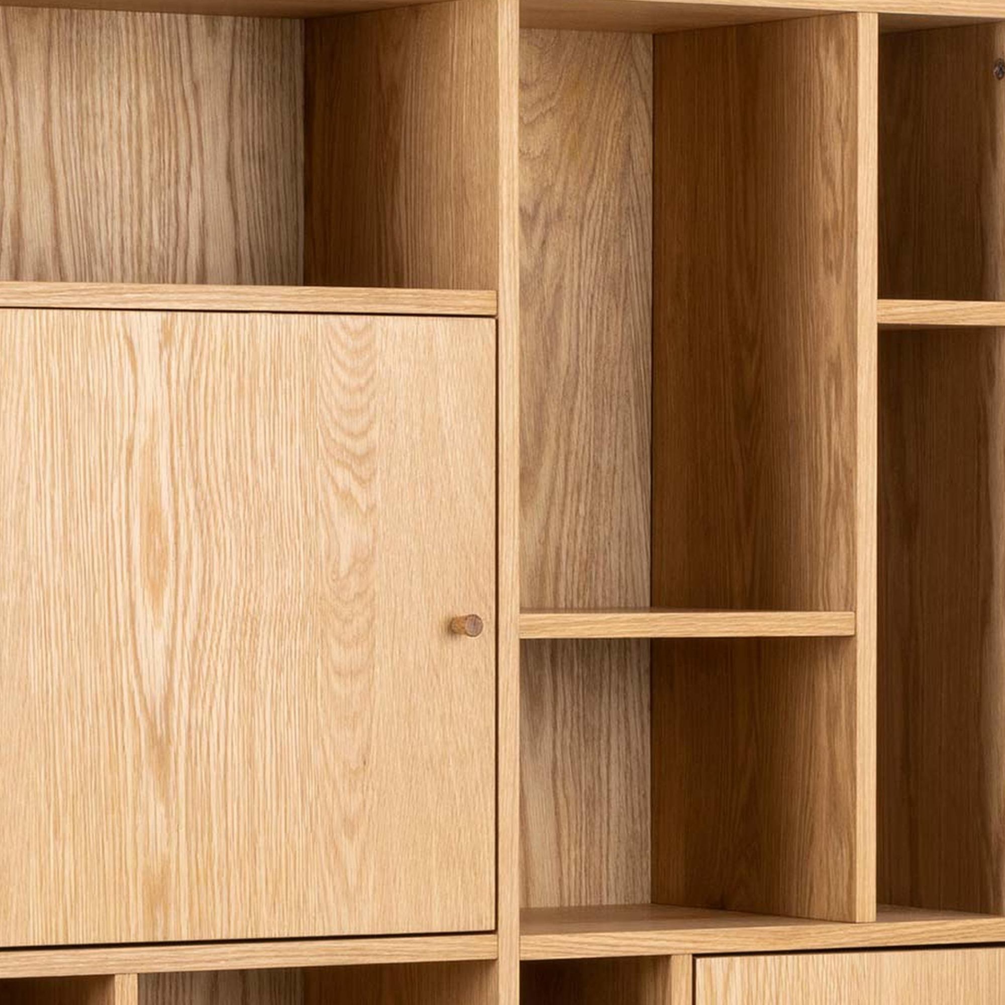 Táto knižnica kombinuje prírodný materiál a vizuálnu zaujímavosť. Vďaka otvorenému a uzavretému úložnému priestoru usporiadanému v asymetrickom štýle poskytuje táto knižnica dostatok úložného priestoru a taktiež upúta pozornosť. Je vyrobená z dyhovaných drevotrieskových dosiek, ktoré sú ošetrené olejom a sú ozdobené kresbou dreva, ktorá je umocnená olejovanou povrchovou úpravou, čo prispieva k príjemnej atmosfére vo vašom obývacom priestore.