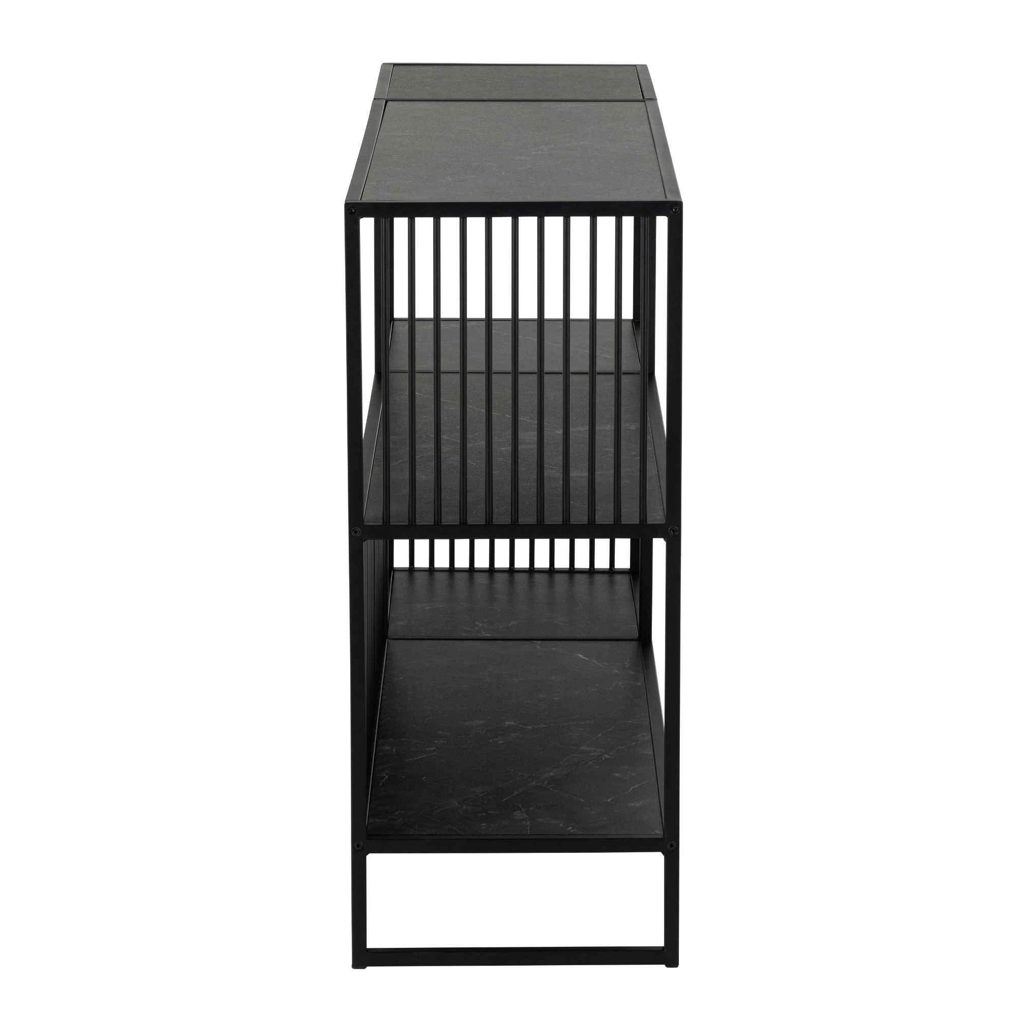 Konštrukcia knižnice je vyrobená z práškovo lakovaného kovu a disponuje dostatočným úložným priestorom v podobe dvoch políc. Police sú vyrobené z kvalitnej laminovanej drevovláknitej dosky, ktorá zaisťuje ľahkú údržbu, a sú ladené do dekora čierneho mramoru. Originálny dizajn s vertikálnymi motívmi na zadnej strane knižnice dodáva tomuto kúsku jedinečný a estetický vzhľad, zároveň však zaisťuje stabilitu uložených predmetov.