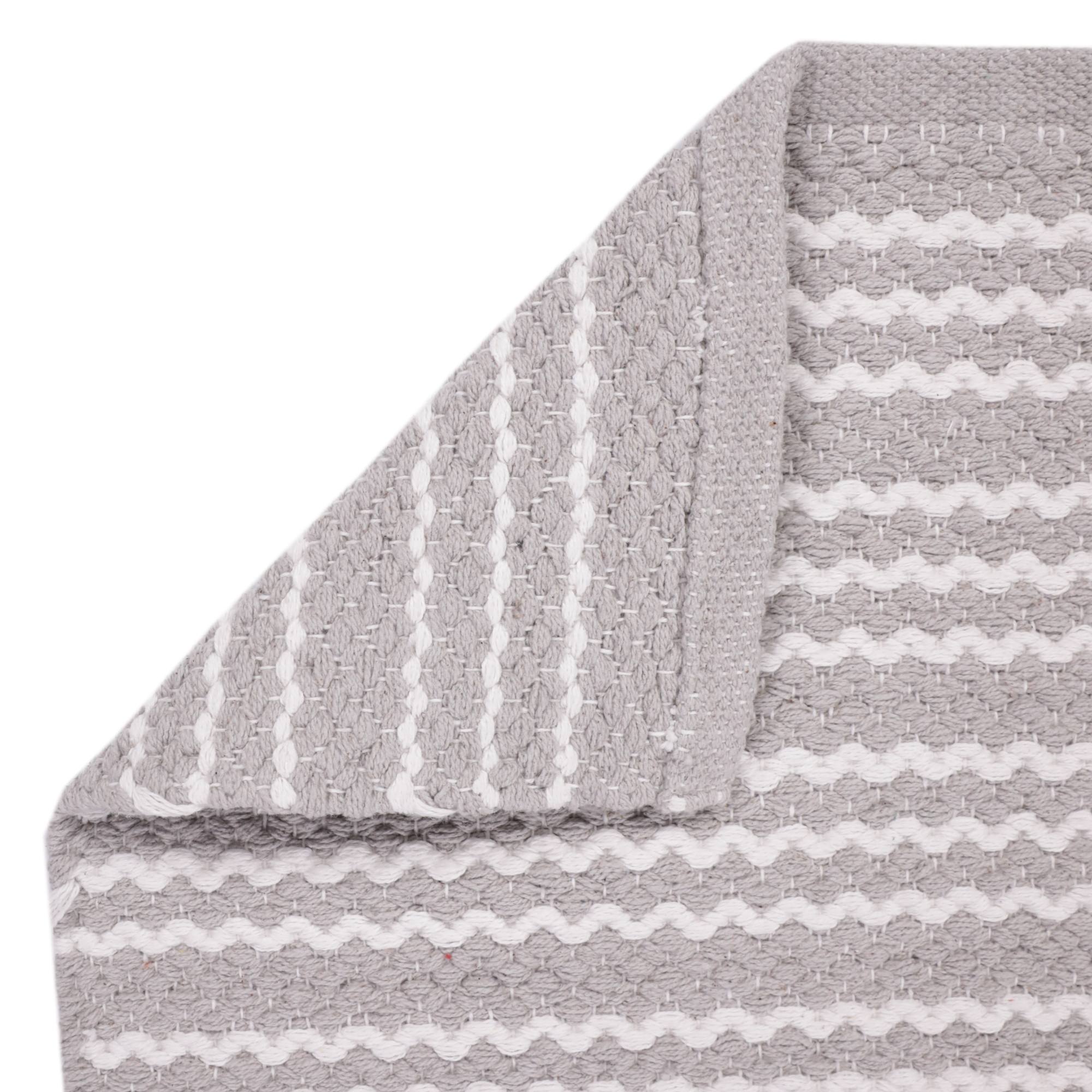 Koberec je strojovo tkaný a vyrobený zo zmesi 90% bavlny a 10% polyesteru. Bavlna sa vyznačuje priedušnosťou a mäkkosťou. Polyester zvyšuje pevnosť a farebnú stálosť. Odporúčame jemné ručné čistenie a nebieliť. Jeho jednoduchý pletený vzor v striebornej farbe so svojím neutrálnym tónom sa bude ľahko kombinovať s ďalšími farbami v interiéri. Koberec možno využiť v obývačke, spálni, predsieni či jedálni.