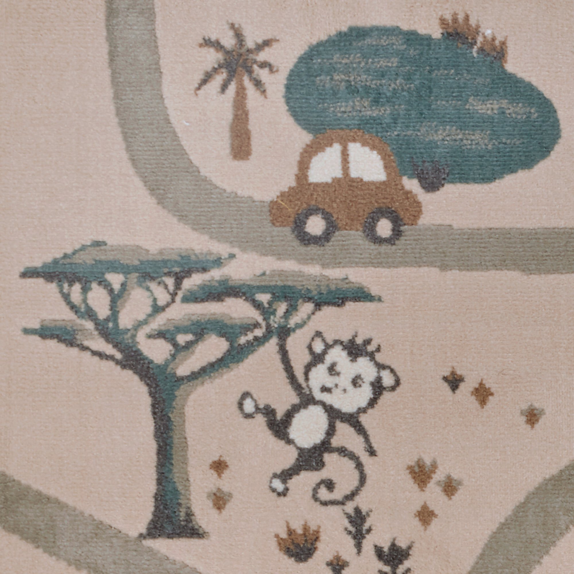 Koberec je strojovo všívaný a vyrobený vo vysoko kvalitnom spracovaní. Strihaný vlas s výškou 5 mm je vyrobený zo 100% polypropylénu. Ponúka mäkký a pohodlný povrch, ktorý poslúži ako podložka na hranie aj ako pekný doplnok detskej izby. Svojím motívom cesty po safari je praktickým doplnkom a zábavnou hrou v jednom.