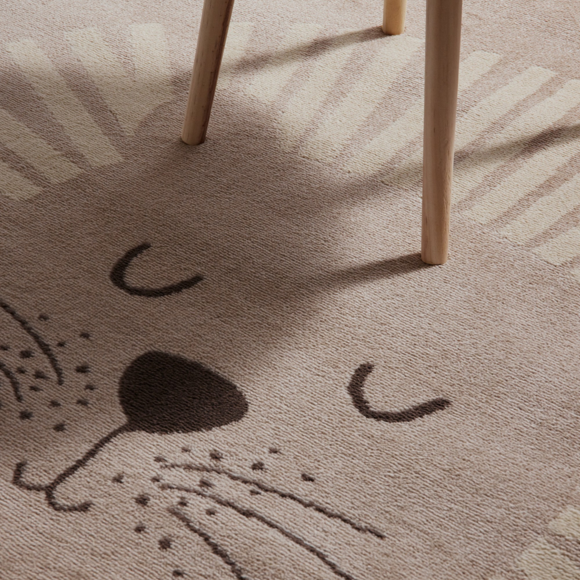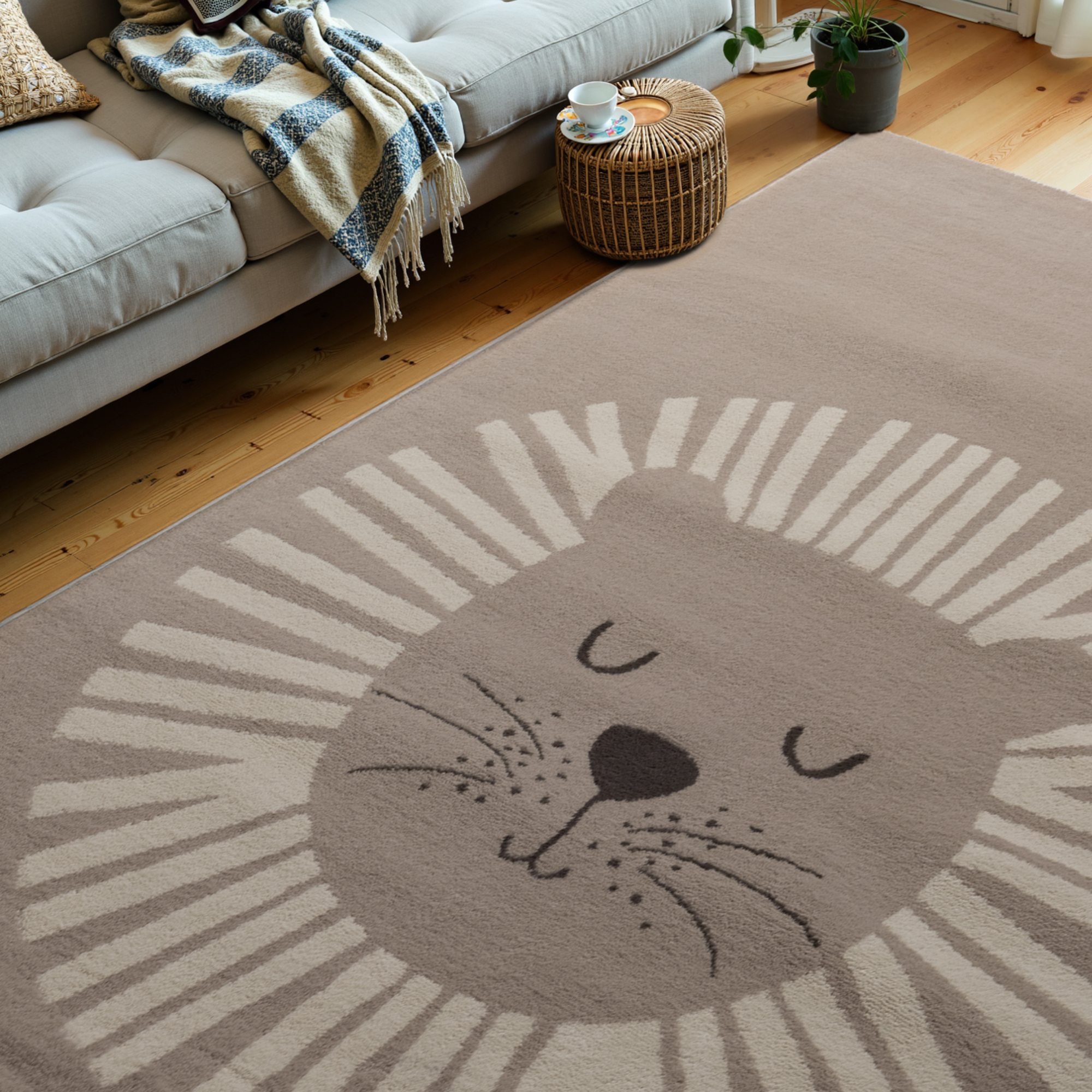 Koberec je strojovo všívaný a vyrobený vo vysoko kvalitnom spracovaní. Strihaný vlas s výškou 6 mm je vyrobený zo 100% polypropylénu. Ponúka mäkký a pohodlný povrch, ktorý poslúži ako podložka na hranie aj pekný doplnok detskej izby. Svojím motívom leva zútulní každú detskú izbu. Zadná strana koberca je z kombinácie juty, polyesteru a doplnená latexom, ktorý funguje ako protišmyková vrstva a lepšie udržiava koberec na mieste.