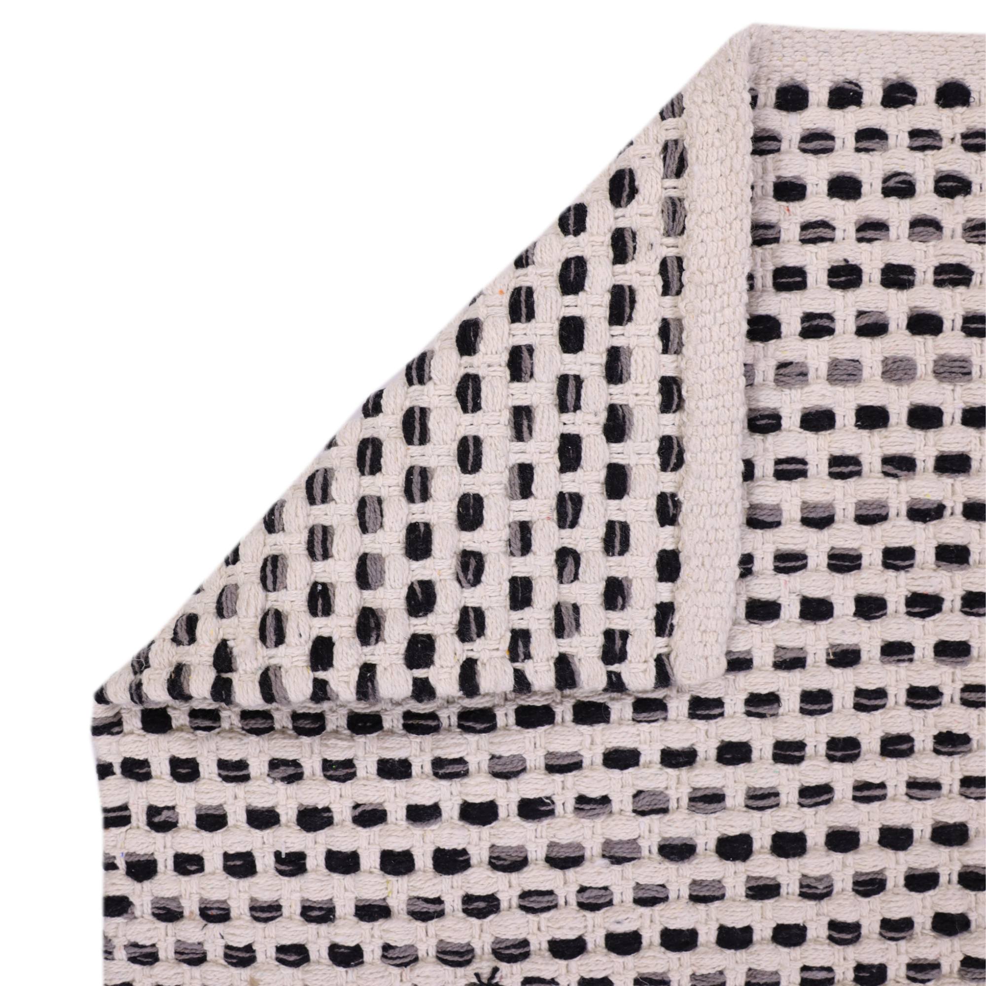 Koberec je strojovo tkaný a vyrobený zo 100 % bavlny, ktorá sa vyznačuje priedušnosťou, mäkkosťou a je vhodná pre alergikov. Bavlna je tiež biologicky rozložiteľná, teda šetrná k prírode. Odporúčame jemné ručné čistenie a nebieliť. Jeho jednoduchý pletený vzor kombinuje kontrastnú čiernu a bielu farbu, ktorá oživí každý interiér a bude sa ľahko kombinovať s ďalšími farbami.