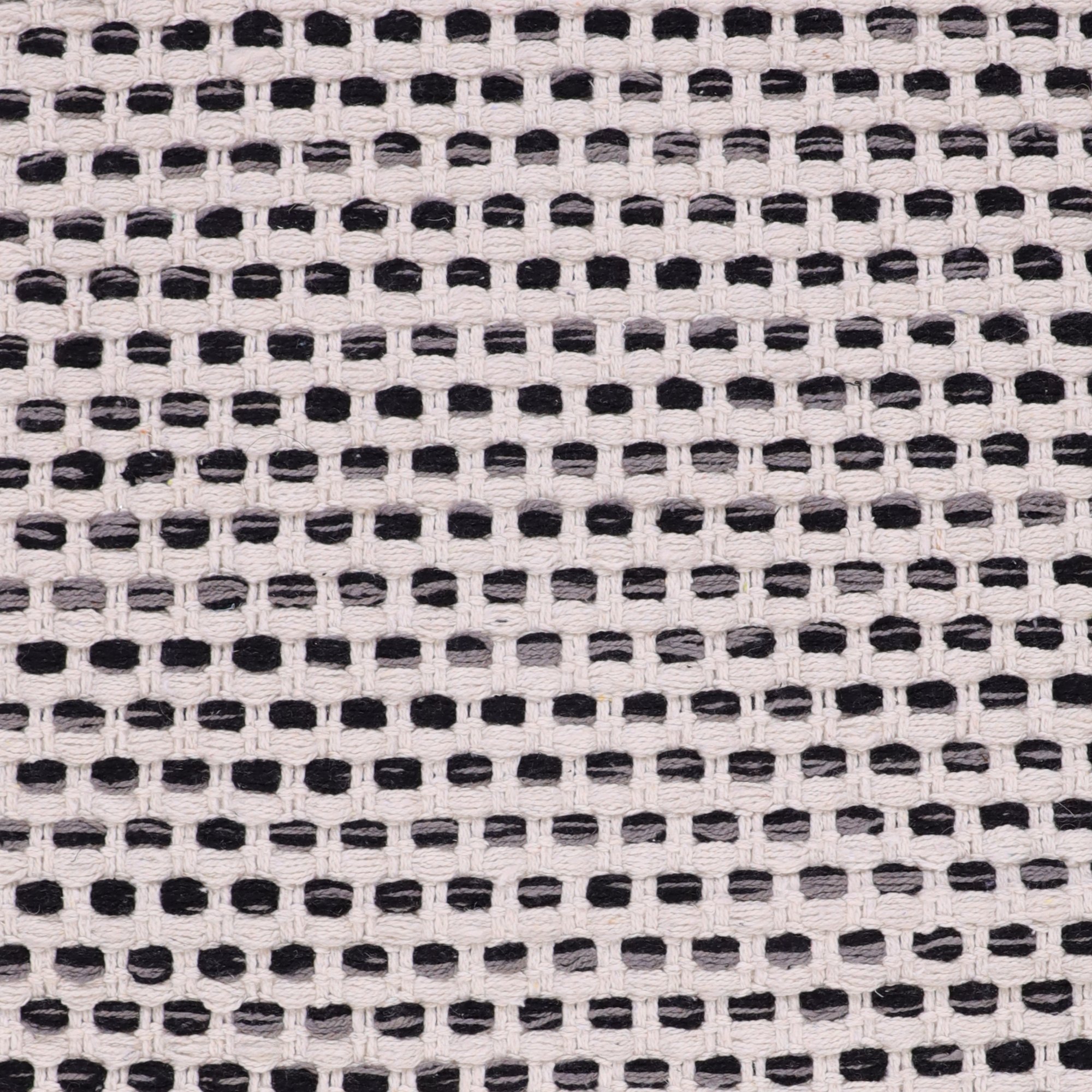 Koberec je strojovo tkaný a vyrobený zo 100 % bavlny, ktorá sa vyznačuje priedušnosťou, mäkkosťou a je vhodná pre alergikov. Bavlna je tiež biologicky rozložiteľná, teda šetrná k prírode. Odporúčame jemné ručné čistenie a nebieliť. Jeho jednoduchý pletený vzor kombinuje kontrastnú čiernu a bielu farbu, ktorá oživí každý interiér a bude sa ľahko kombinovať s ďalšími farbami.
