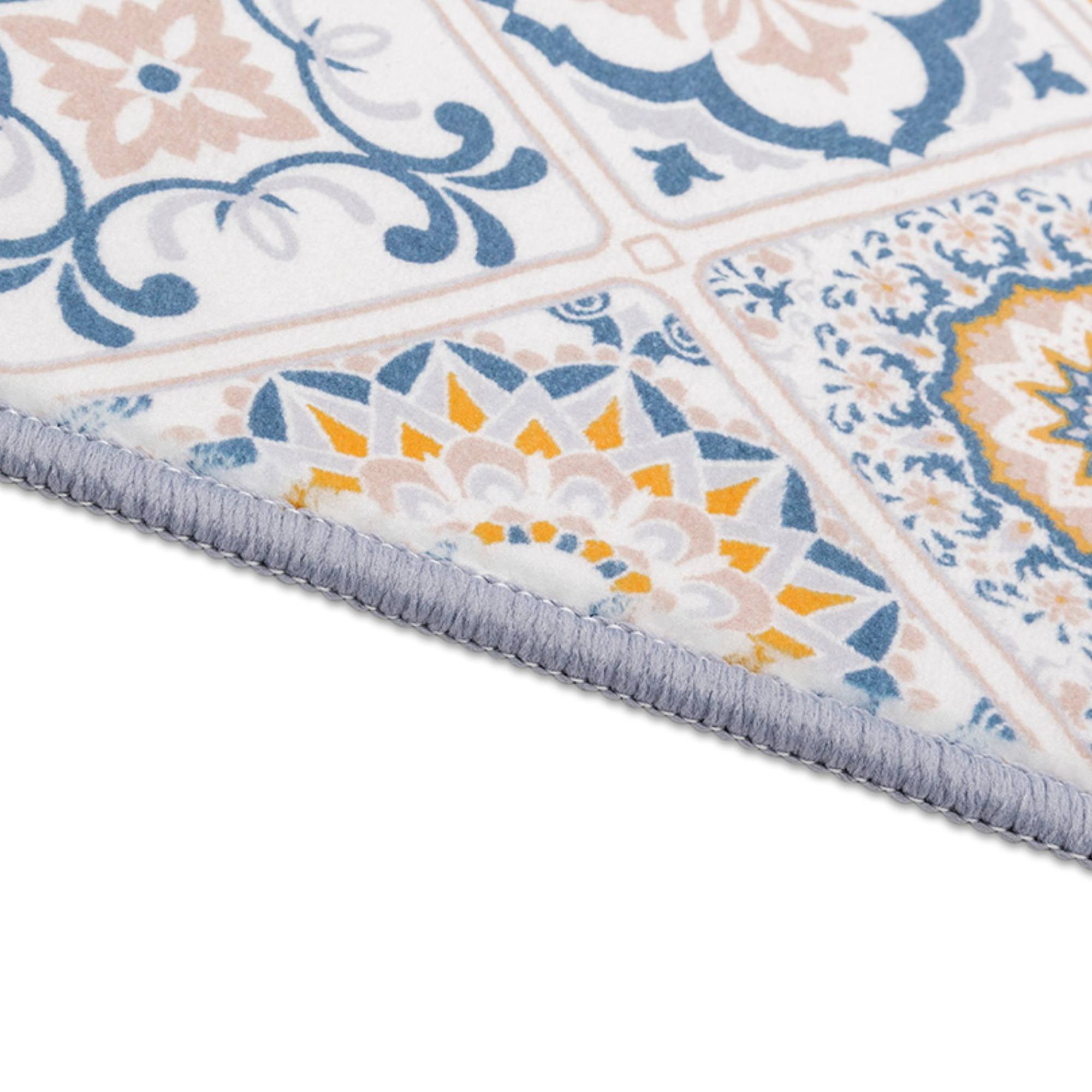 Koberec OBKLADAČKY je vyrobený zo 100 % polyesteru a veľmi hladký na dotyk. Vlas koberca je strihaný na veľmi nízky, čím zaisťuje jeho ľahkú údržbu. Je možné ho aj ručne vyprať. Potlač koberca má dizajn orientálnych vzorov, pripomínajúci obkladačky. Disponuje svojou protišmykovou spodnou stranou, nemusíte sa teda báť o svoju bezpečnosť.