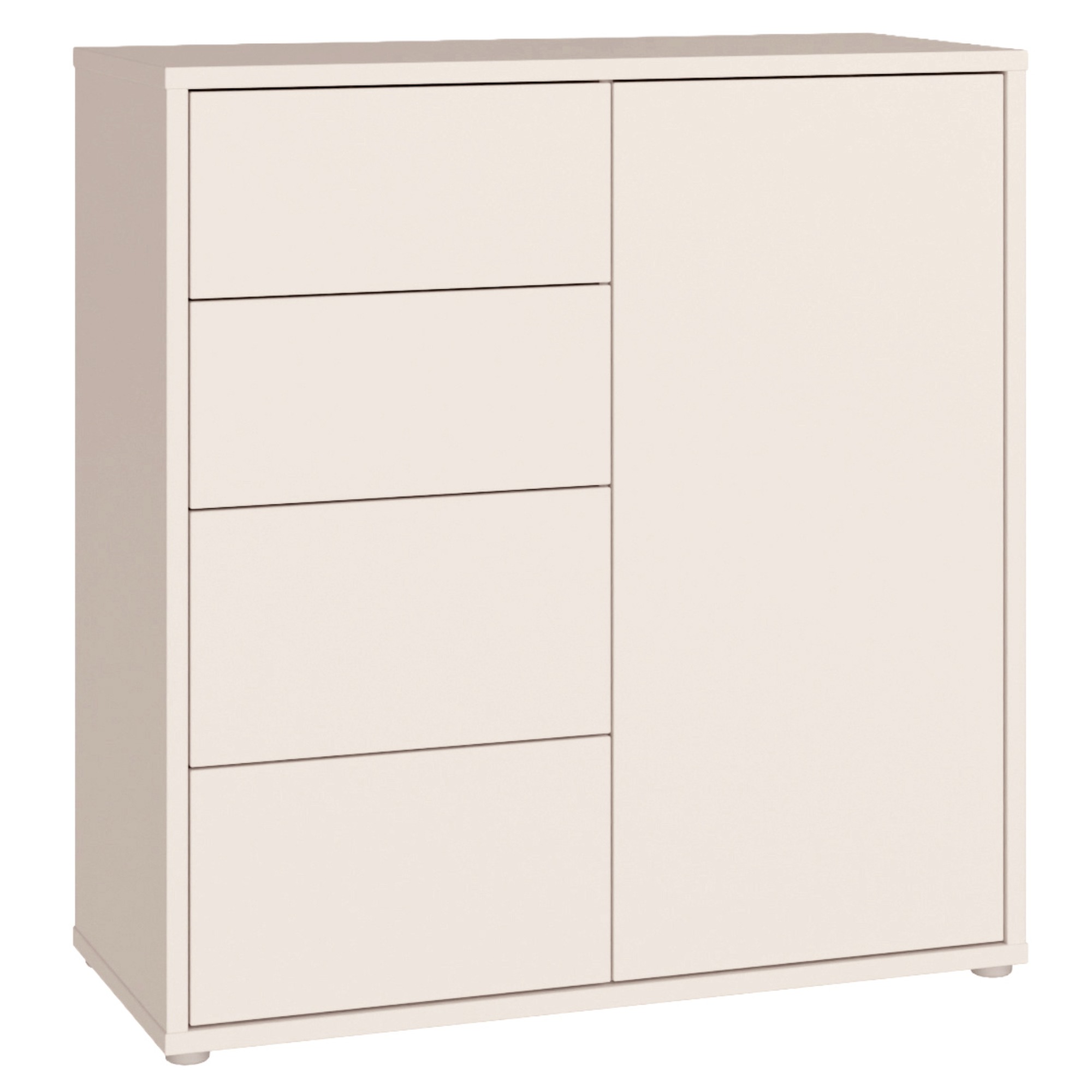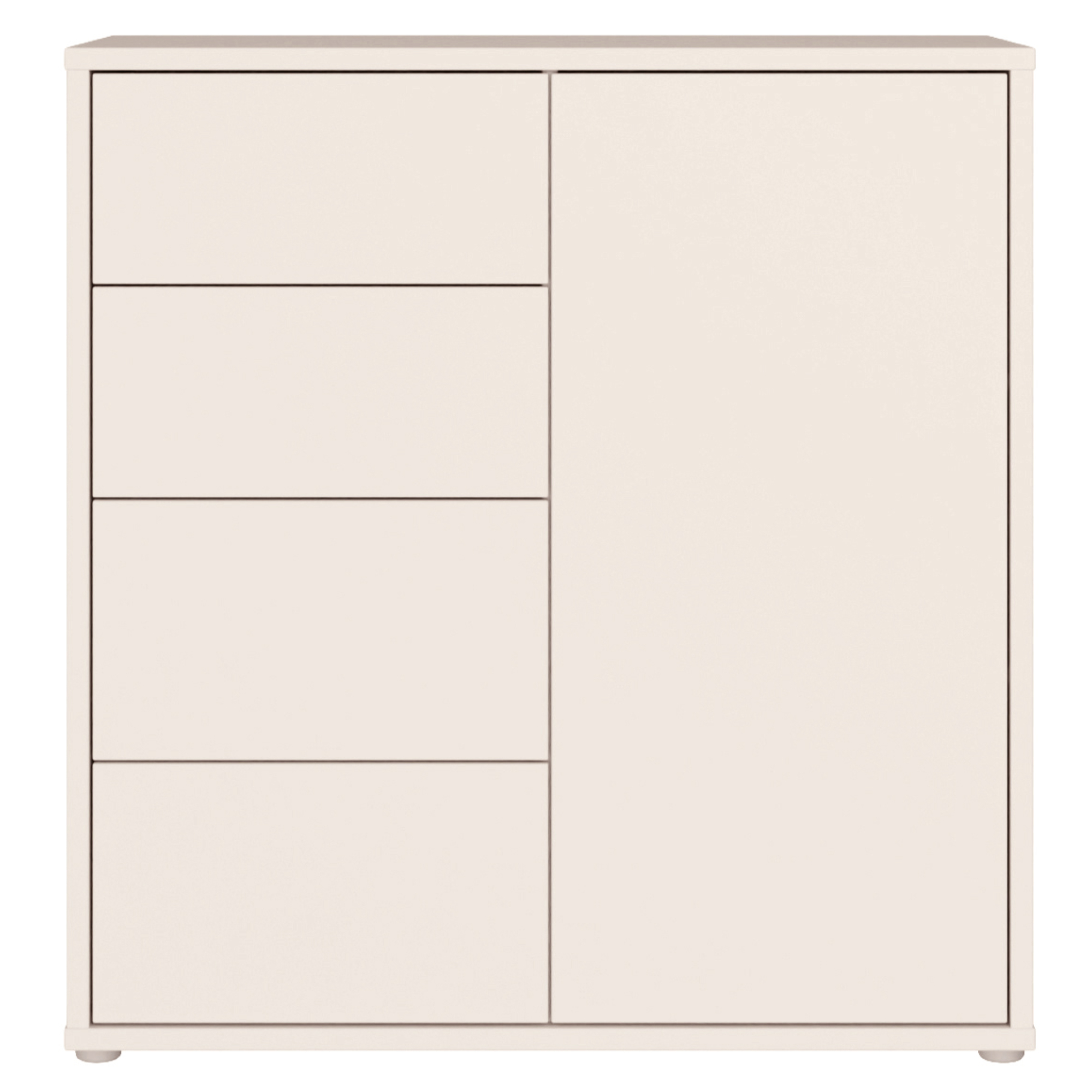 Poskytuje dostatok priestoru na uloženie oblečenia, dokumentov aj ďalších drobností, ktoré chcete mať prehľadne usporiadané. Je vybavená 4 zásuvkami a 2 policami, ktoré sa ukrývajú za otočnými dvierkami. Disponuje systémom push-to-open, vďaka ktorému ľahko otvoríte zásuvky aj dvierka jednoduchým stlačením. Vyhotovenie bez úchytiek podčiarkuje jej čistý vzhľad, ktorý elegantne doplní obývaciu izbu aj spálňu. Je vyrobená z laminovaného dreveného materiálu, ktorý sa vyznačuje jednoduchou údržbou.