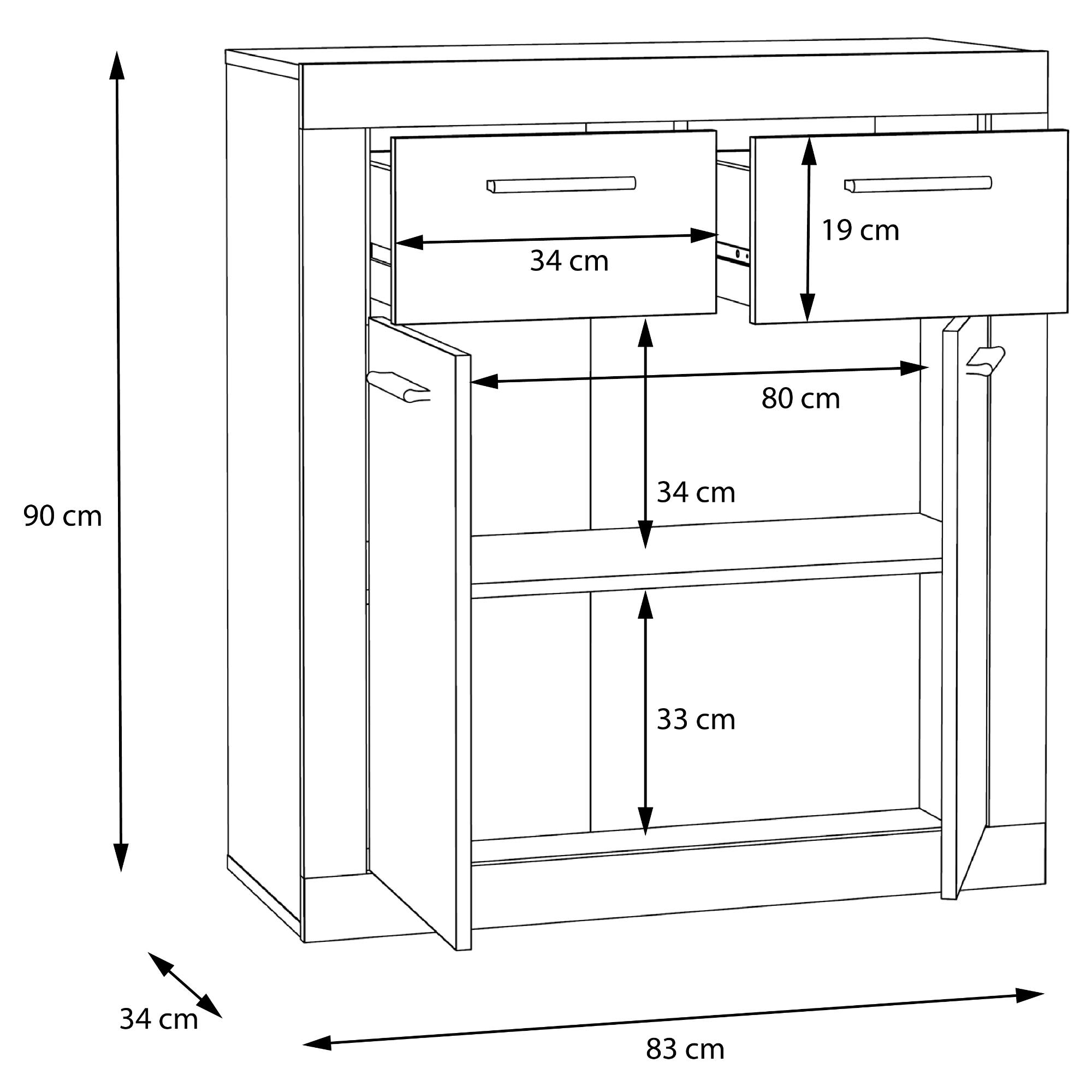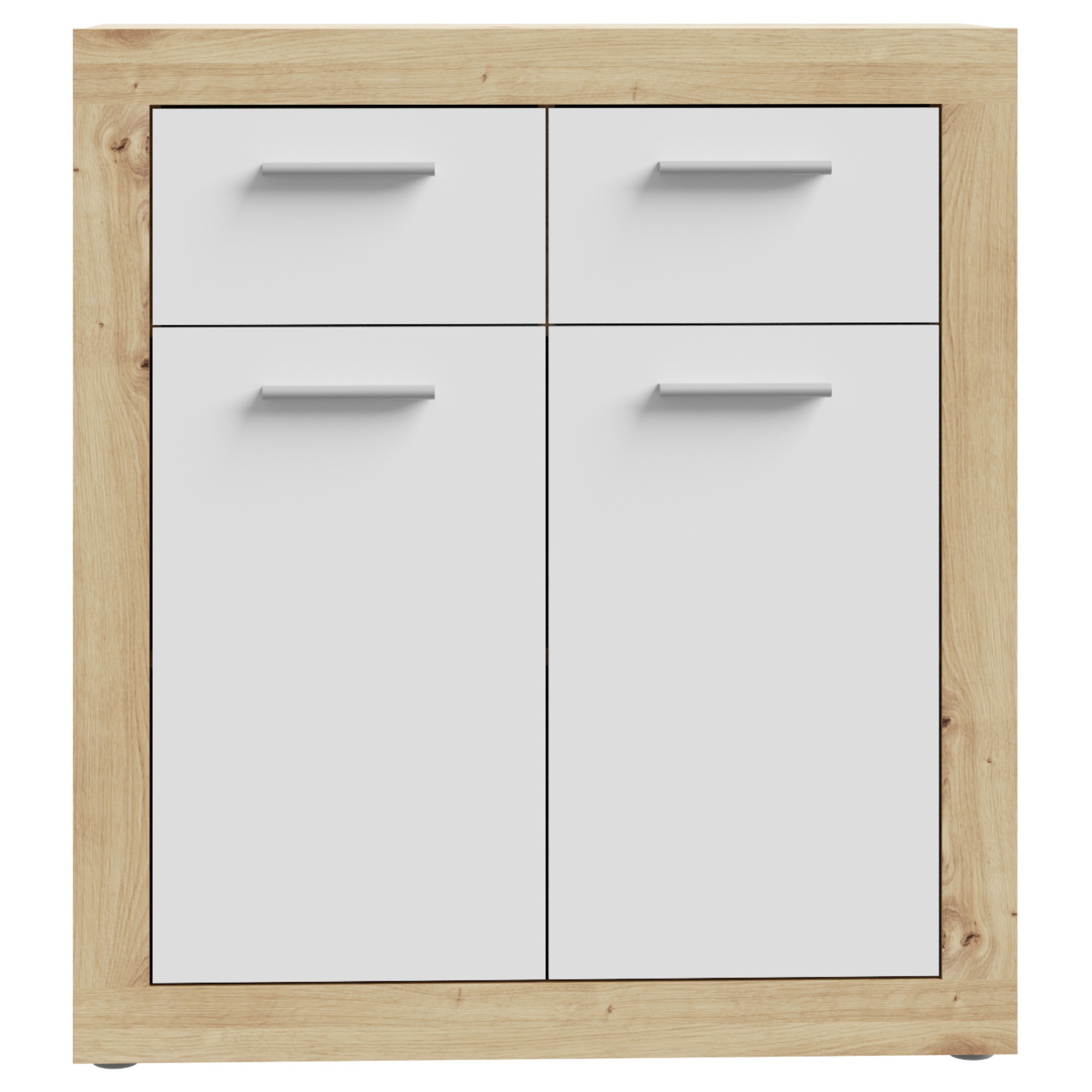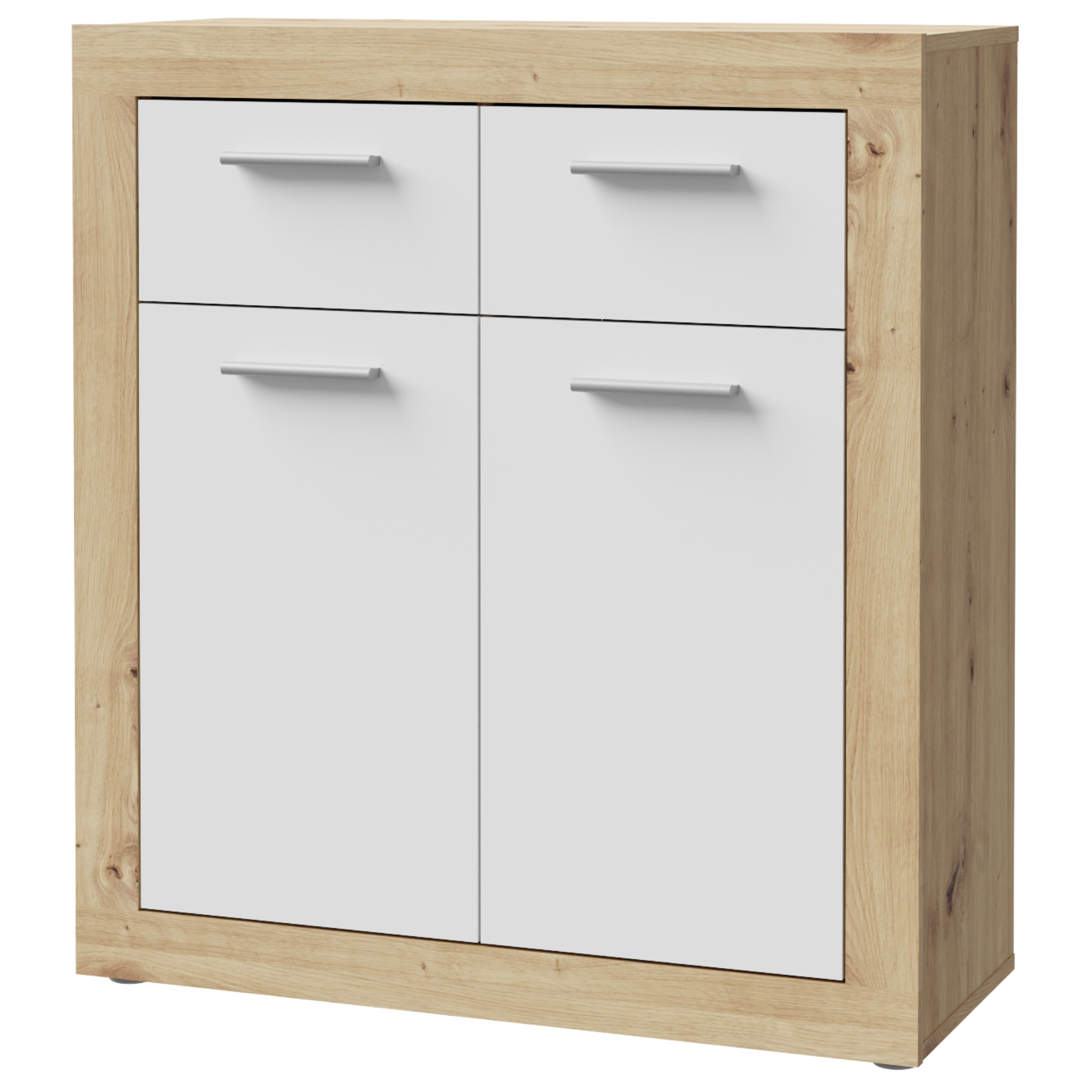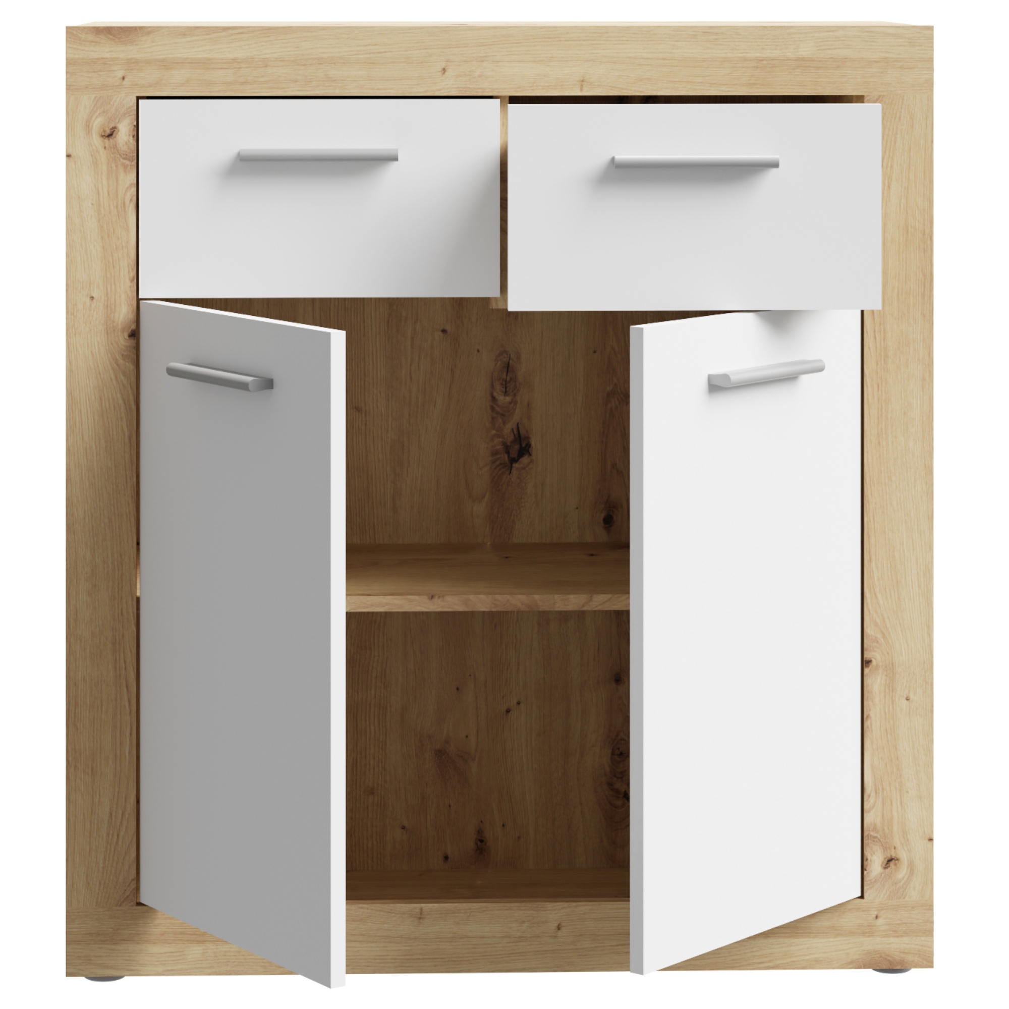 Komoda BACCIO sa stane praktickou súčasťou vášho interiéru, môžete ju tak využiť v akejkoľvek časti miestnosti. Kombinácia dekora dreva a bielej farby dodáva komode moderný vzhľad. K dispozícii budete mať úložný priestor, ktorý je rozdelený na jednu dvojdverovú skrinku s policami a dve samostatné zásuvky s dobrou využiteľnosťou. Povrch komody sa vyznačuje jednoduchou údržbou.