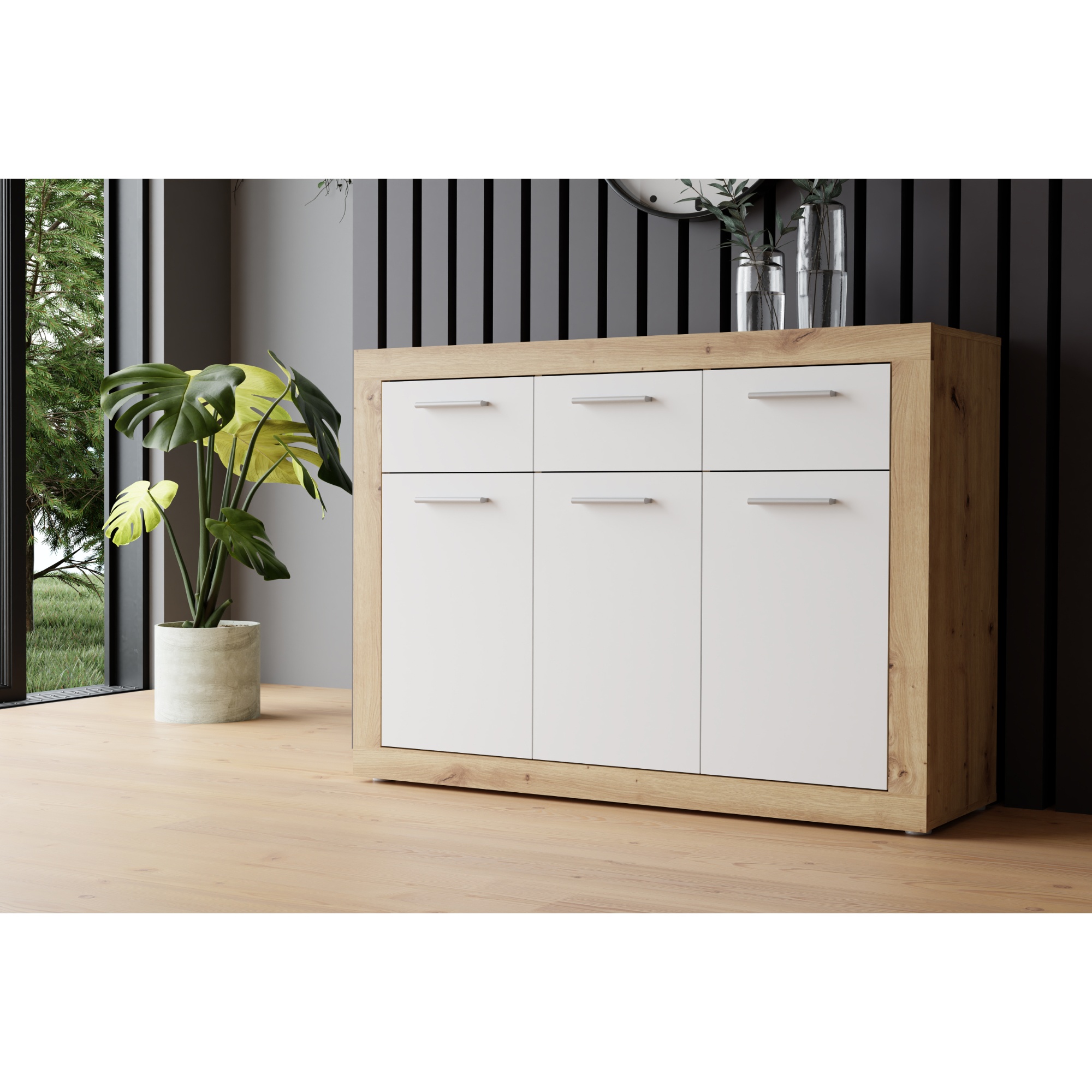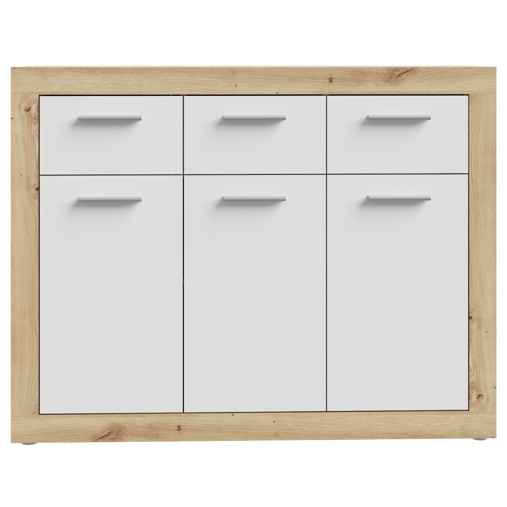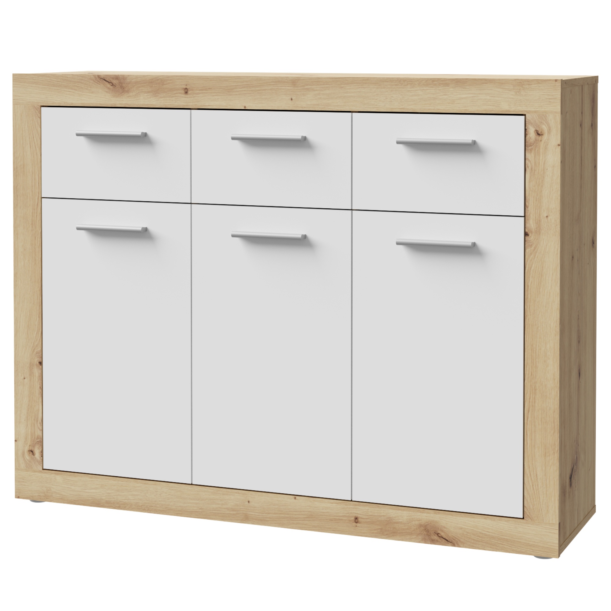 Komoda BACCIO sa stane praktickou súčasťou vášho interiéru, môžete ju tak využiť v akejkoľvek časti miestnosti. Kombinácia dekora dreva a bielej farby dodáva komode moderný vzhľad. K dispozícii budete mať úložný priestor, ktorý je rozdelený na tri uzatvárateľné skrinky s policami a tri samostatné zásuvky s dobrou využiteľnosťou. Povrch komody sa vyznačuje jednoduchou údržbou.