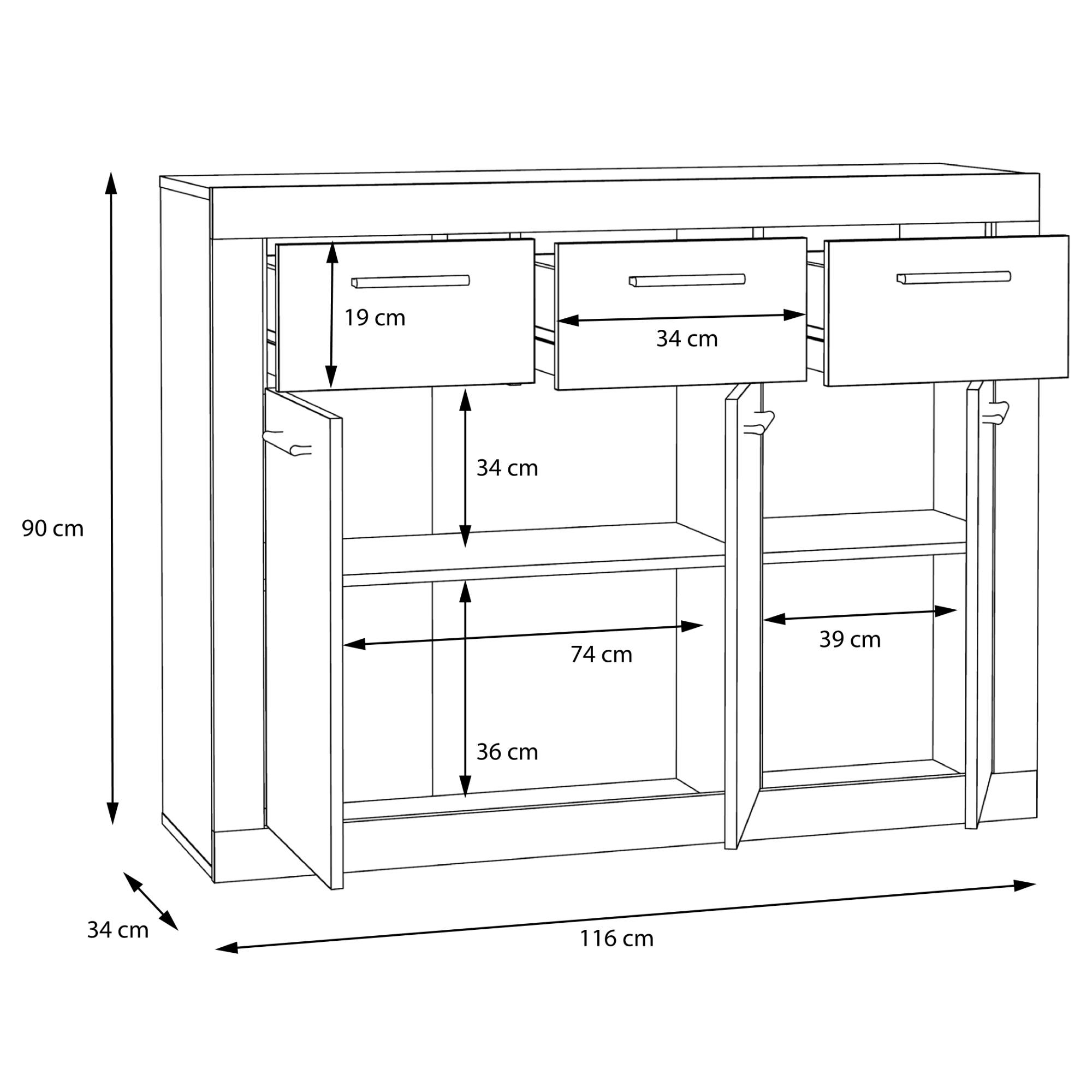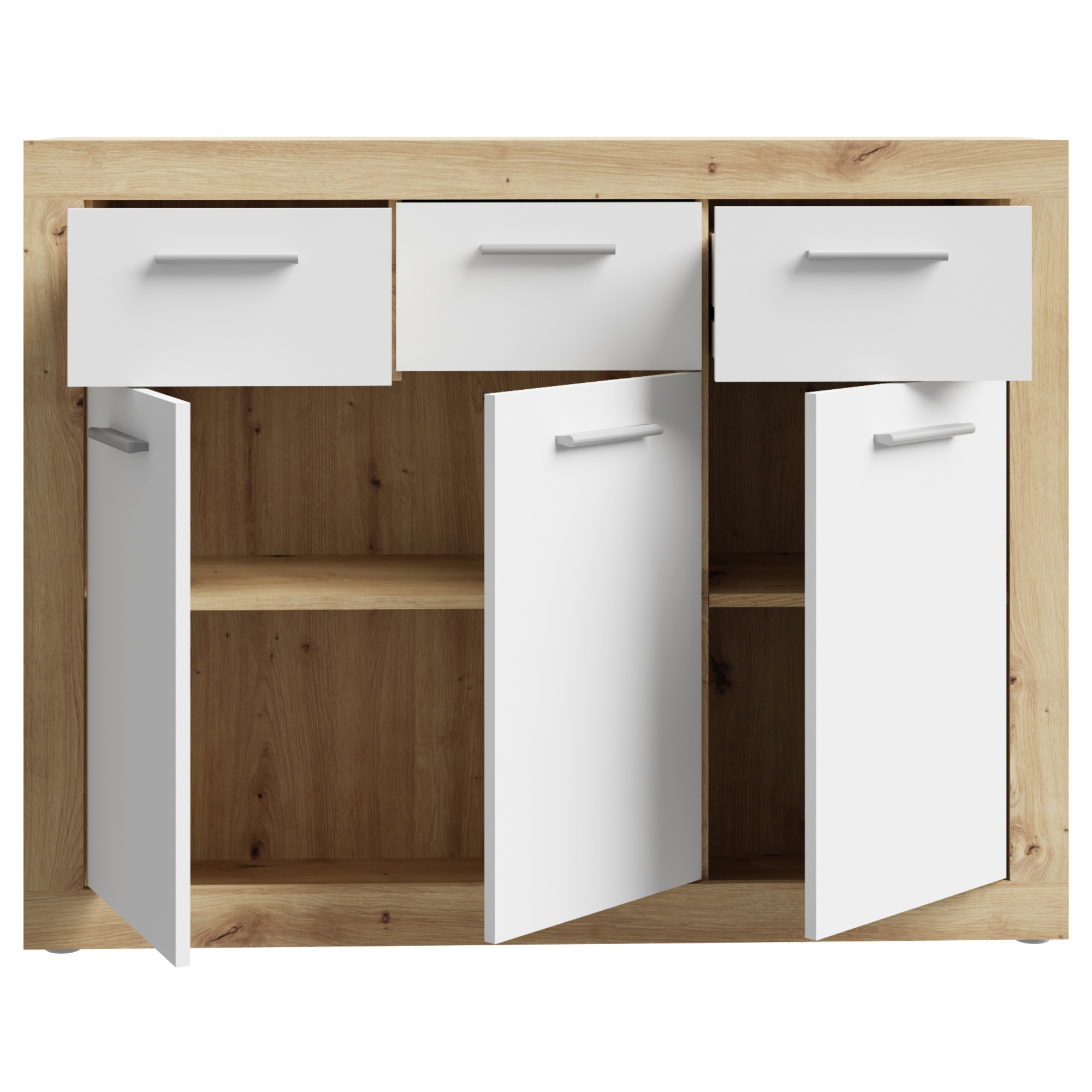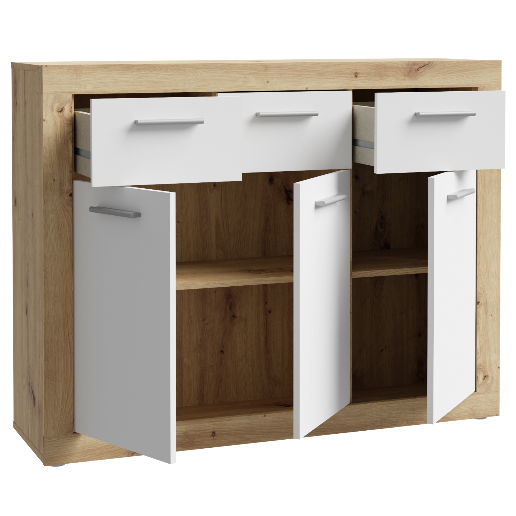Komoda BACCIO sa stane praktickou súčasťou vášho interiéru, môžete ju tak využiť v akejkoľvek časti miestnosti. Kombinácia dekora dreva a bielej farby dodáva komode moderný vzhľad. K dispozícii budete mať úložný priestor, ktorý je rozdelený na tri uzatvárateľné skrinky s policami a tri samostatné zásuvky s dobrou využiteľnosťou. Povrch komody sa vyznačuje jednoduchou údržbou.