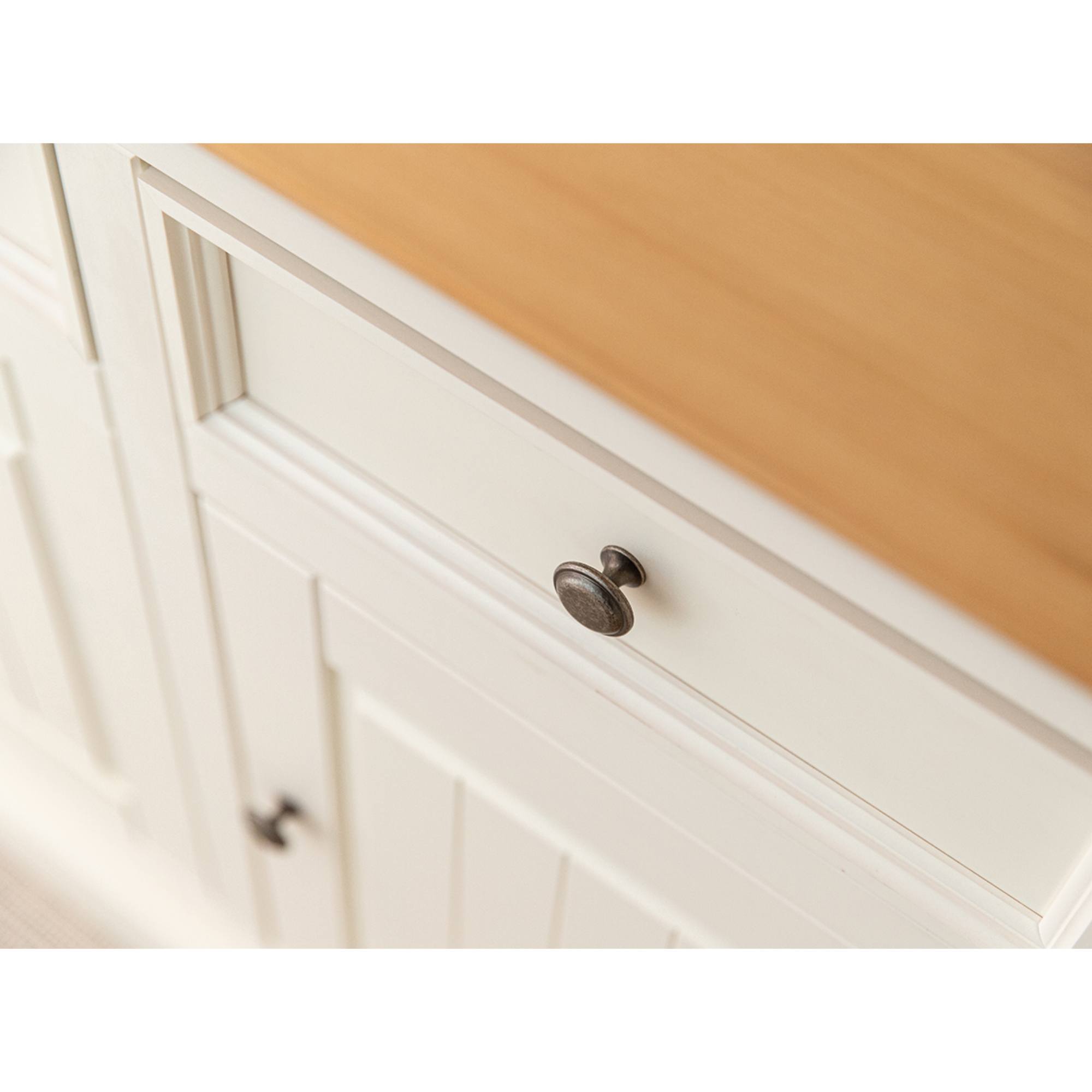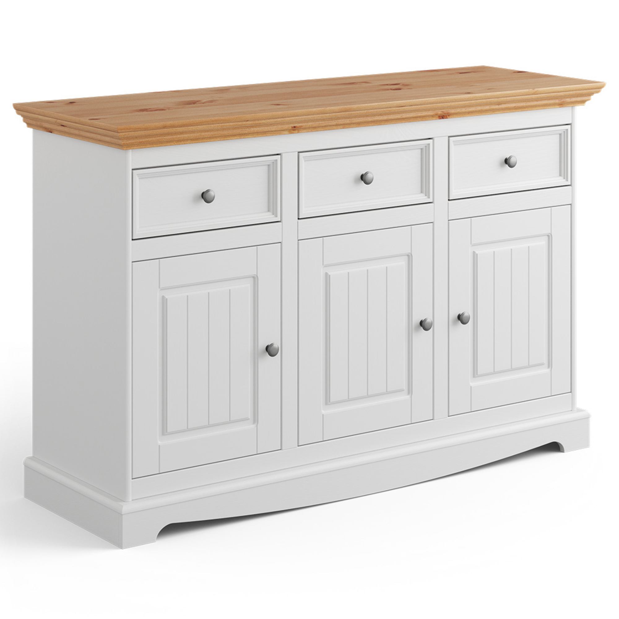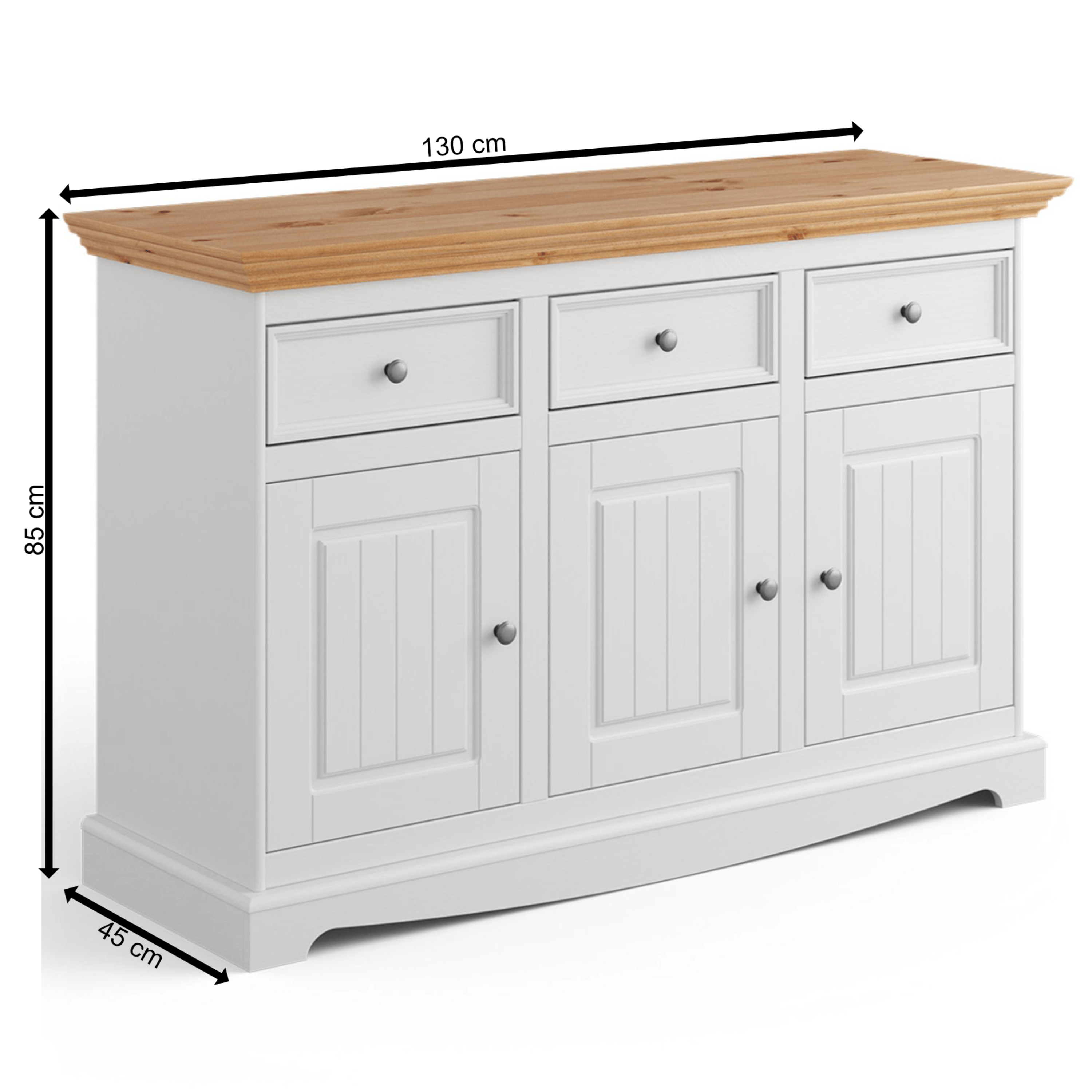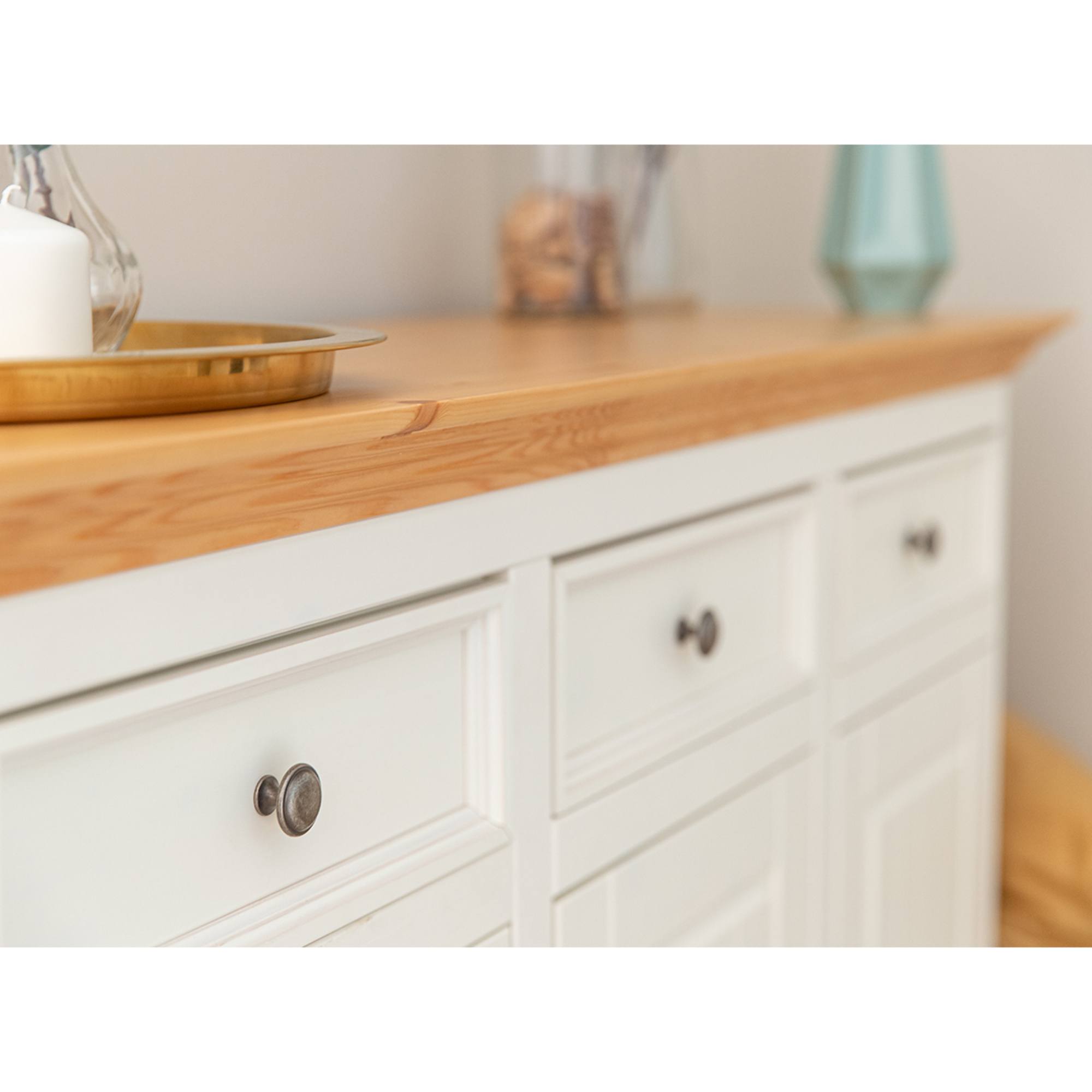 Dostanete priestor na uloženie drobností a rozmernejších predmetov. Do troch praktických zásuviek ideálne odložíte príbory, doklady alebo iné predmety každodennej potreby. Zásuvky disponujú systémom dovierania SOFT CLOSE, čo zvyšuje komfort používania nábytku. Tri priestranné skrine zase poslúžia na uloženie príležitostných dekorácií, riadu, ale aj oblečenia. Využiť môžete aj širokú dosku, na ktorú sa zmestí váza s kvetinami, sviečky a rodinné fotografie. Nadčasový a originálny dizajn zdôrazňujú pevné gombíkové rúčky.