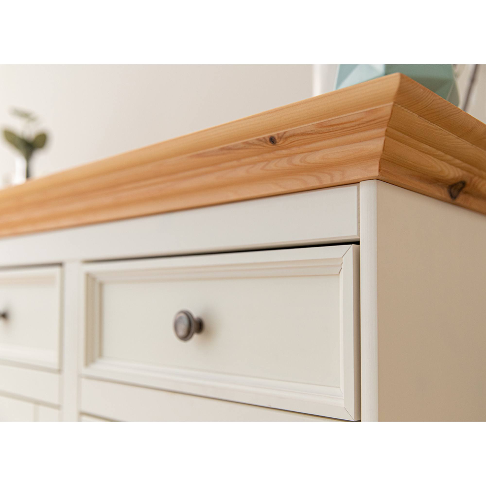 Komoda BELLU 3.3 sa vyznačuje ozdobnými prvkami zdôrazňujúcini charakter provensálskeho štýlu. Použité drevo fínskej borovice sa vyznačuje vysokou plasticitou a mäkkosťou. Ekologické drevo borovice je ľahko spracovateľné, a pritom odolné.