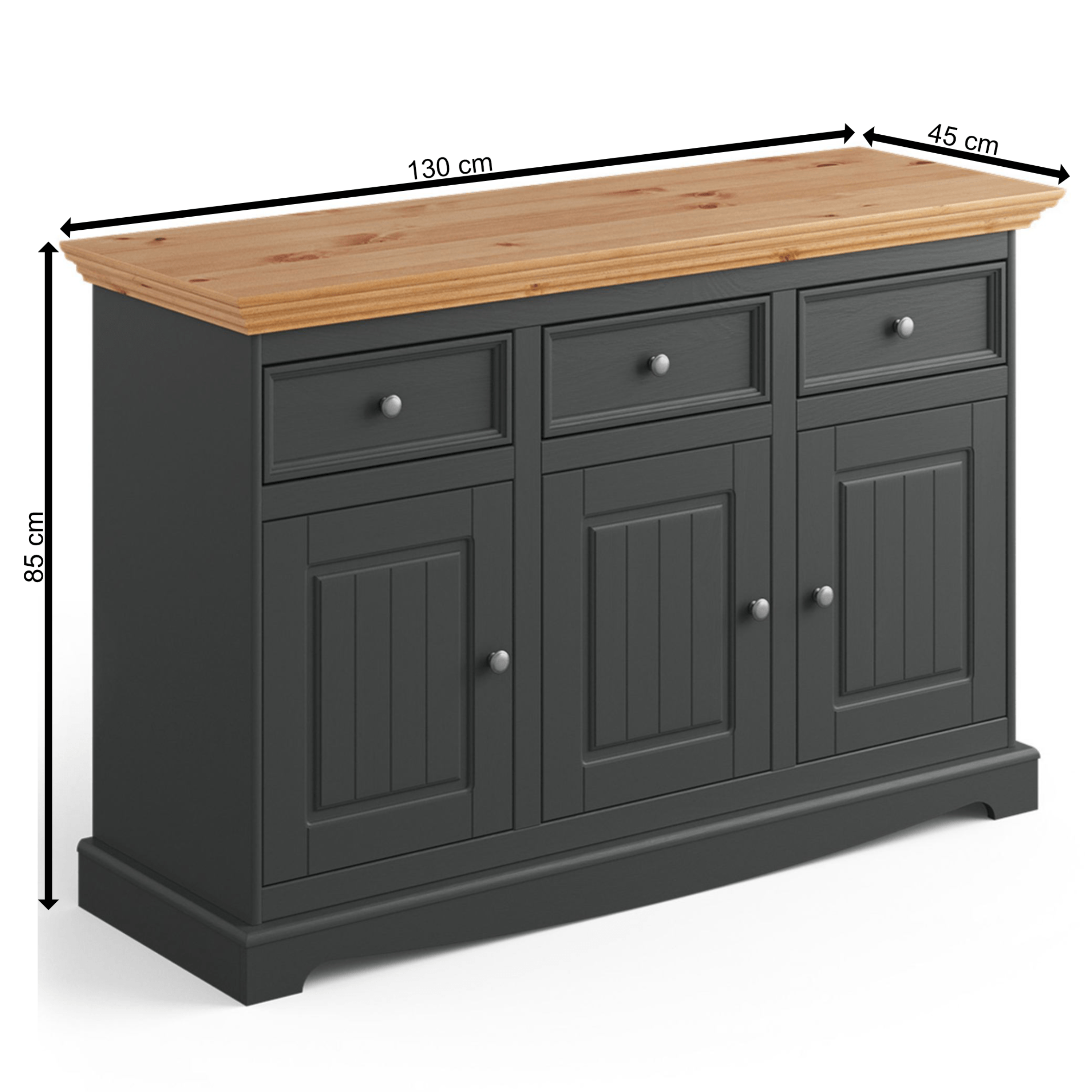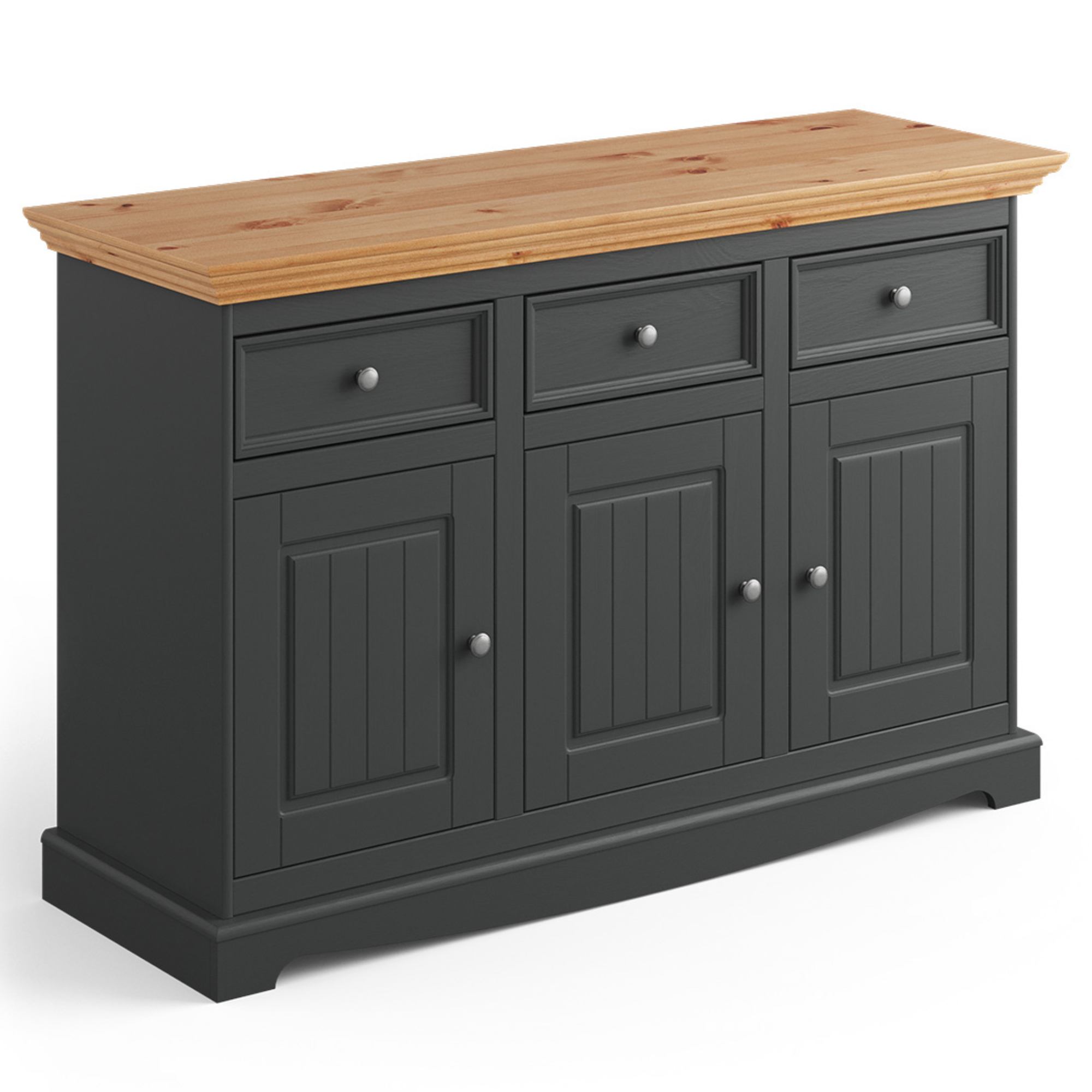 Dostanete priestor na uloženie drobností a rozmernejších predmetov. Do troch praktických zásuviek ideálne odložíte príbory, doklady alebo iné predmety každodennej potreby. Zásuvky disponujú systémom dovierania SOFT CLOSE, čo zvyšuje komfort používania nábytku. Tri priestranné skrine zase poslúžia na uloženie príležitostných dekorácií, riadu, ale aj oblečenia. Využiť môžete aj širokú dosku, na ktorú sa zmestí váza s kvetinami, sviečky a rodinné fotografie. Nadčasový a originálny dizajn zdôrazňujú pevné gombíkové rúčky.