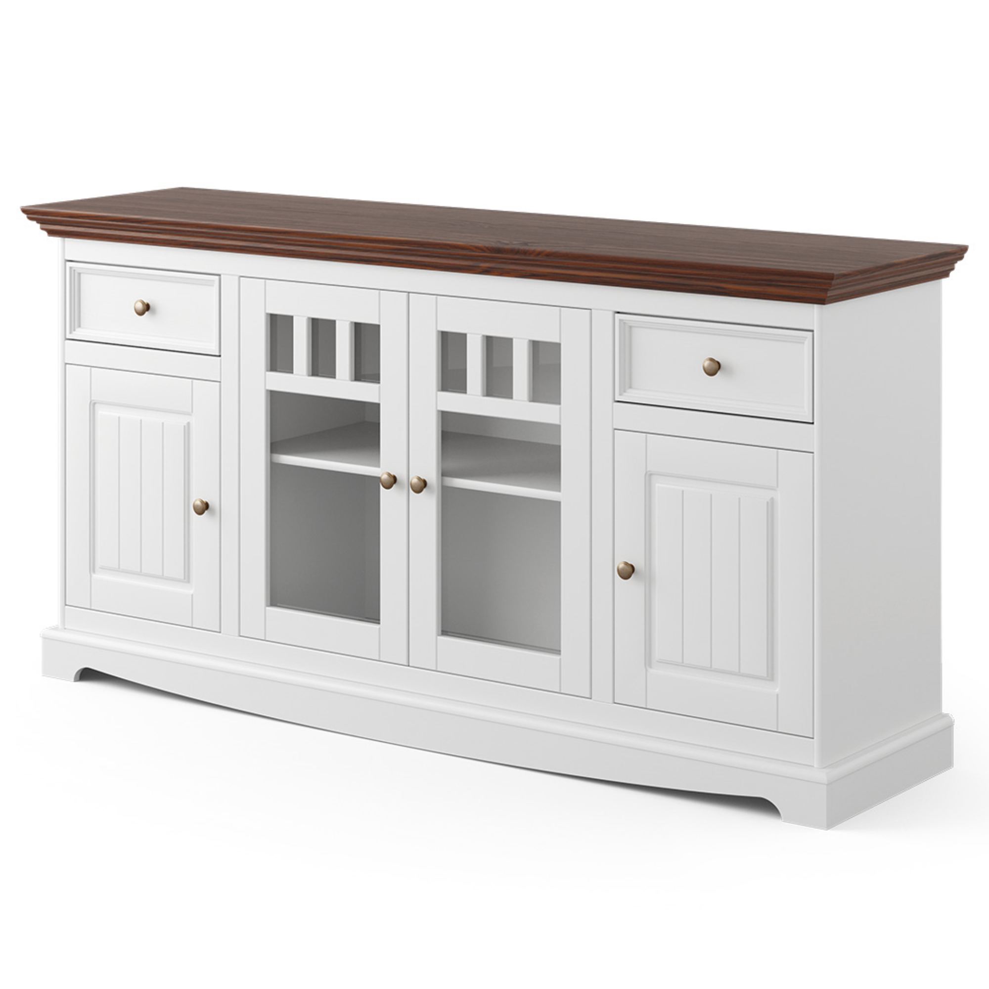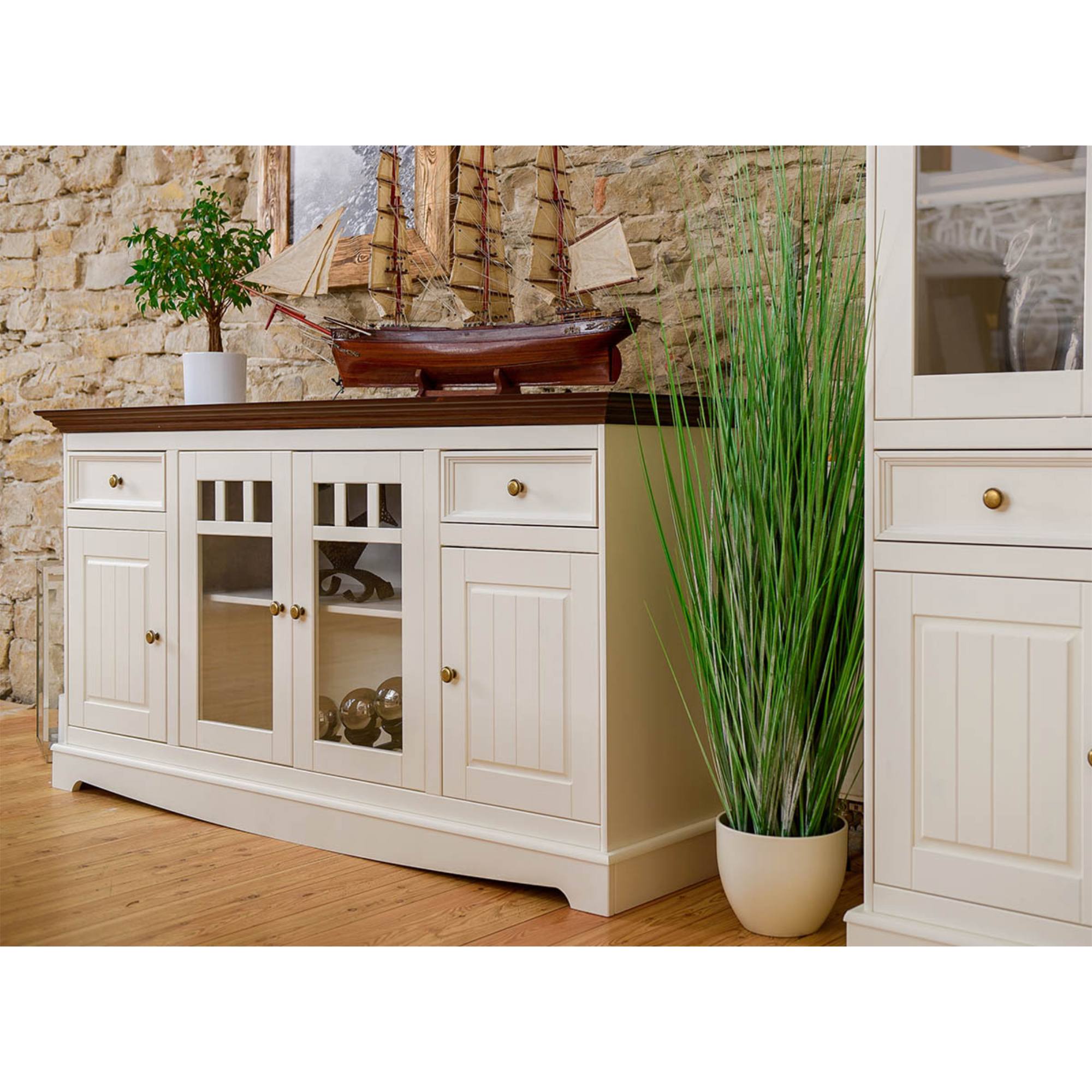 Dostanete priestor na uloženie drobností a rozmernejších predmetov. Do dvoch praktických zásuviek ideálne odložíte príbory, doklady alebo iné predmety každodennej potreby. Zásuvky disponujú systémom dovierania SOFT CLOSE, čo zvyšuje komfort používania nábytku. Tri priestranné skrine, z toho jedna presklená zase poslúži na uloženie príležitostných dekorácií, riadu, ale aj oblečenia. Využiť môžete aj širokú dosku, na ktorú sa zmestí váza s kvetinami, sviečky a rodinné fotografie. Nadčasový a originálny dizajn zvýrazňujú pevné gombíkové rúčky.