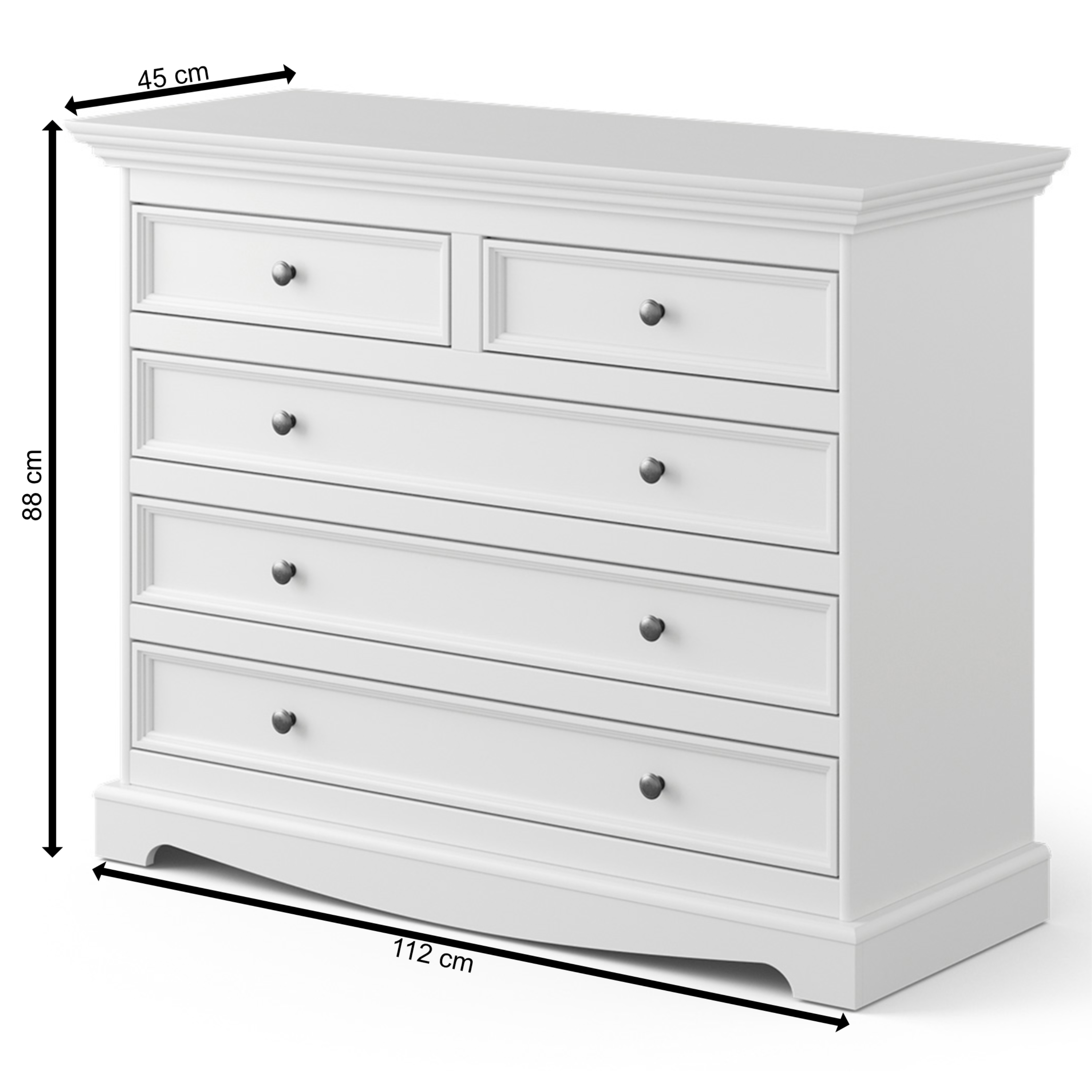 Dostanete priestor na uloženie drobností a rozmernejších predmetov. Do piatich praktických zásuviek rôznych veľkostí ideálne odložíte príbory, doklady alebo iné predmety každodennej potreby. Zásuvky disponujú systémom dovierania SOFT CLOSE, čo zvyšuje komfort používania nábytku. Využiť môžete aj širokú dosku, na ktorú sa zmestí váza s kvetinami, sviečky a rodinné fotografie. Nadčasový a originálny dizajn zdôrazňujú pevné gombíkové rúčky.