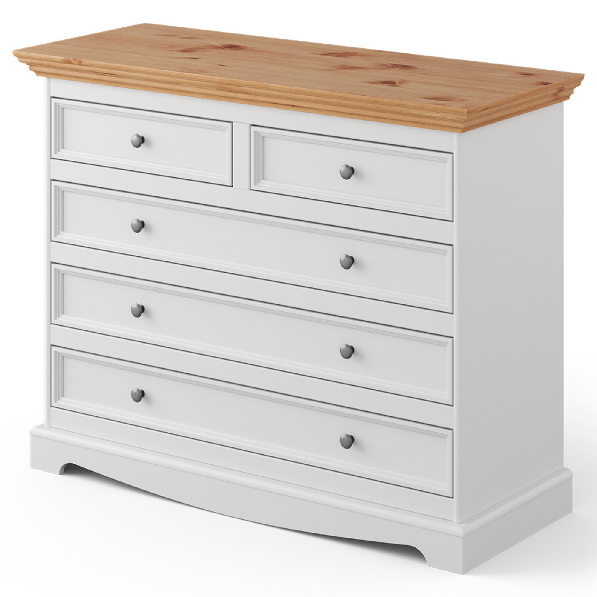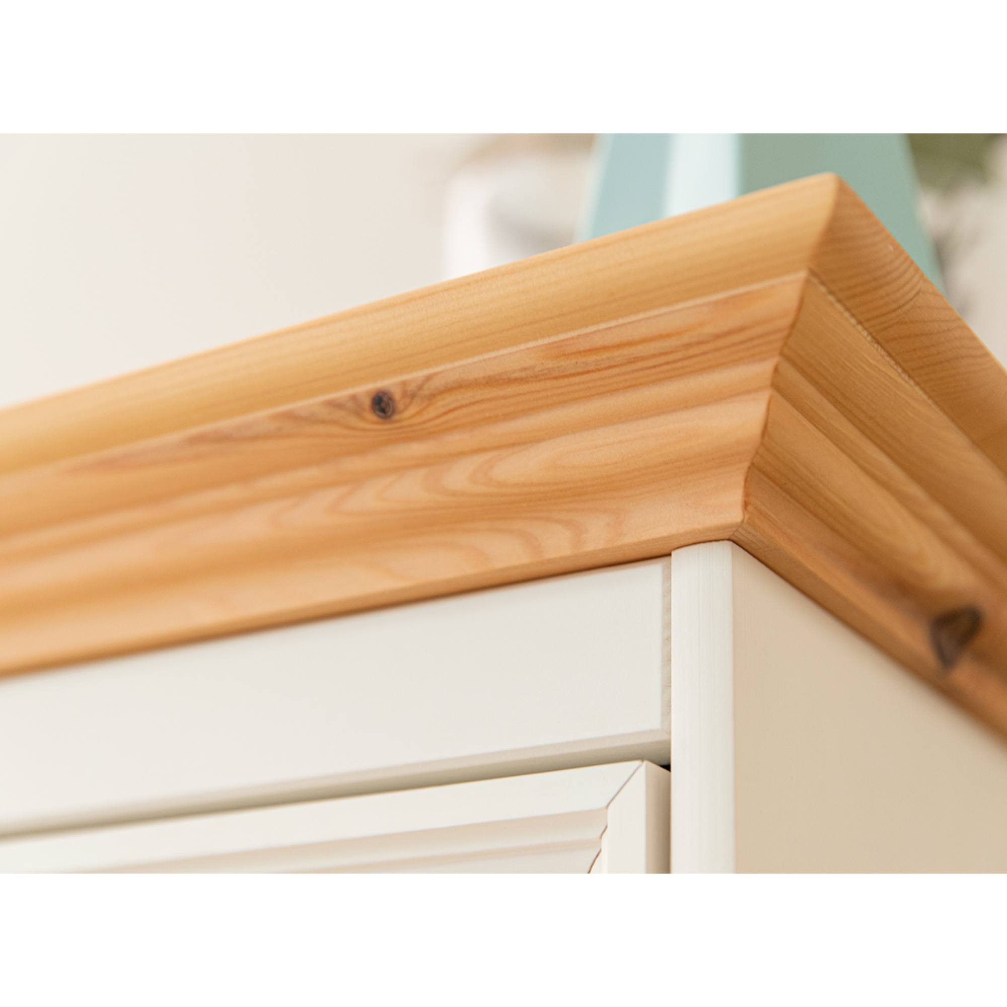 Komoda BELLU 5S sa vyznačuje ozdobnými prvkami zdôrazňujúcimi charakter provensálskeho štýlu. Použité drevo fínskej borovice sa vyznačuje vysokou plasticitou a mäkkosťou. Ekologické drevo borovice je ľahko spracovateľné, a pritom odolné.