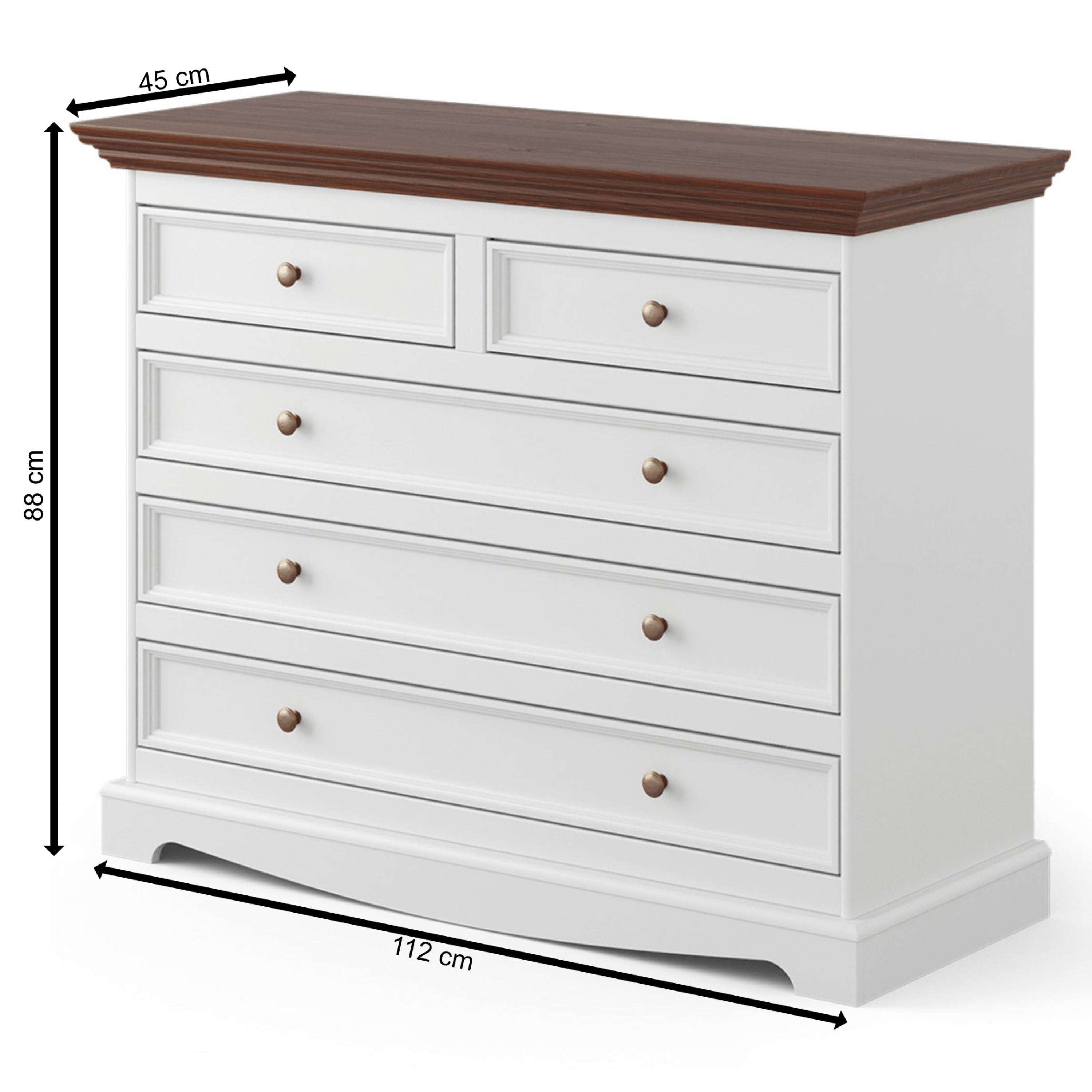 Komoda BELLU 5S sa vyznačuje ozdobnými prvkami zdôrazňujúcimi charakter provensálskeho štýlu. Použité drevo fínskej borovice sa vyznačuje vysokou plasticitou a mäkkosťou. Ekologické drevo borovice je ľahko spracovateľné, a pritom odolné.