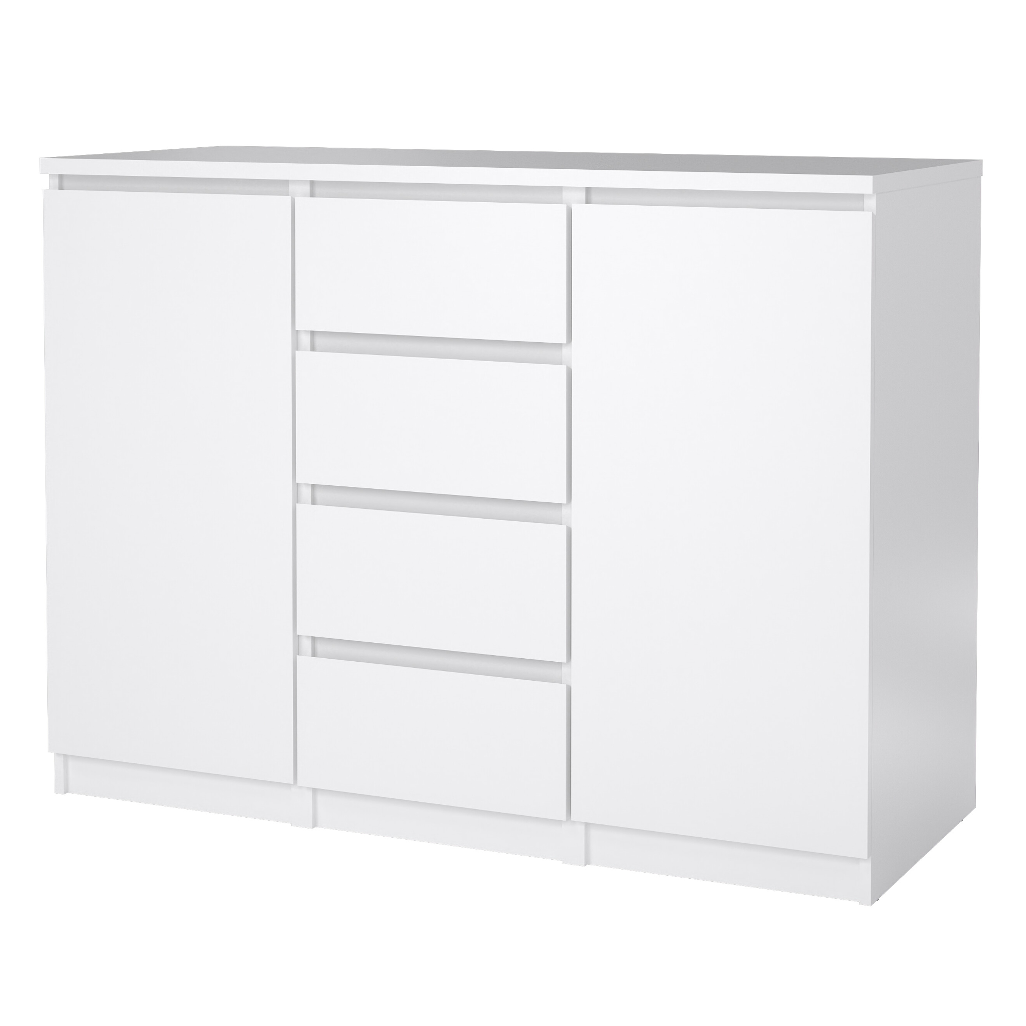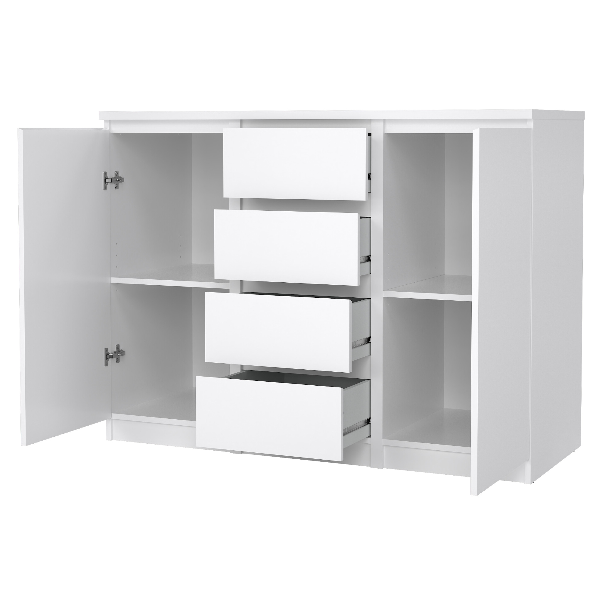 Súčasťou komody sú 2 dvierka. Za každými z nich sa ukrýva 1 vložená polica, na ktorú môžete prehľadne usporiadať všetky veci, ktoré potrebujete mať po ruke. Na uloženie drobností skvele poslúžia 4 praktické zásuvky.