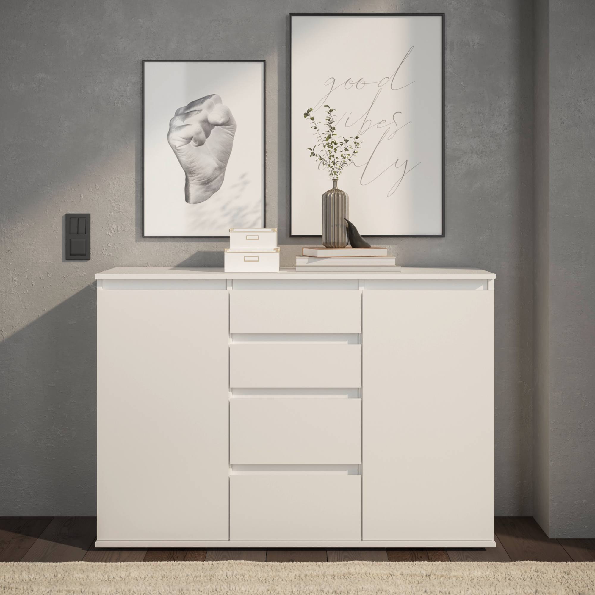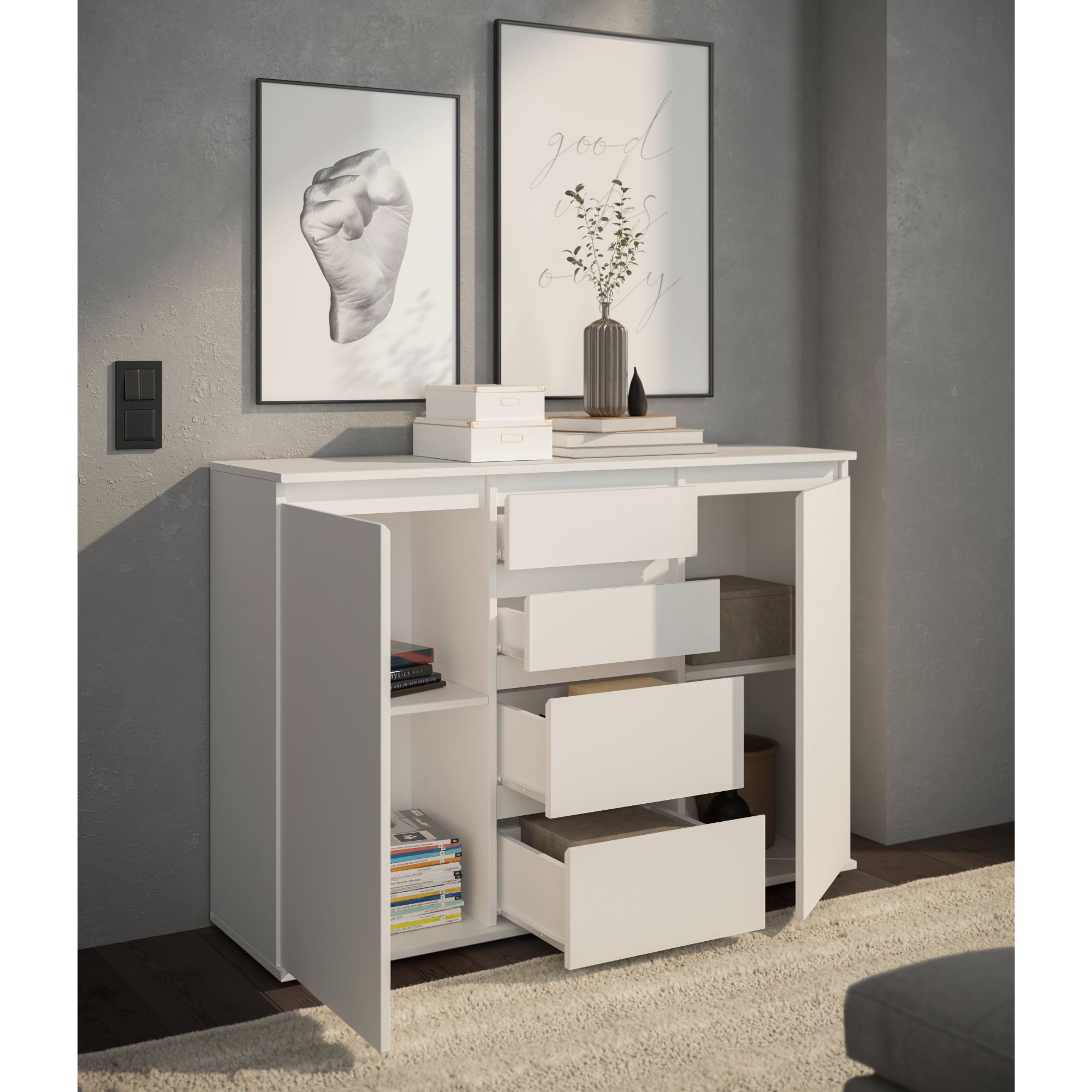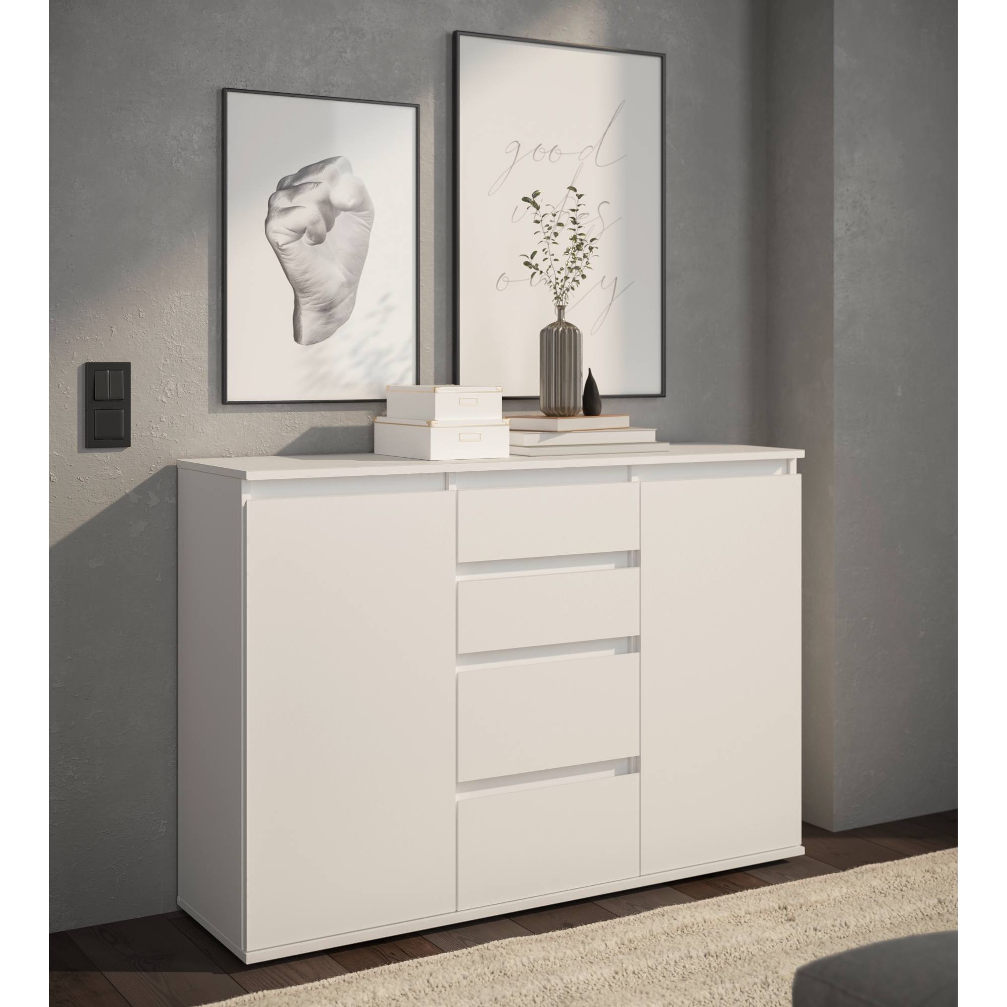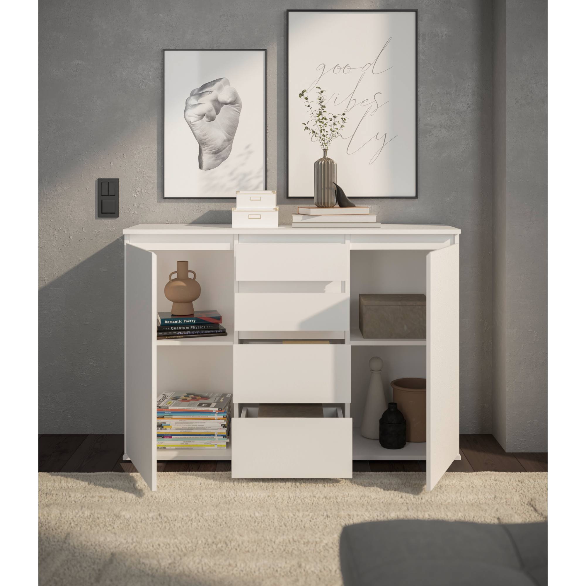 Komoda poskytuje dostatok úložného priestoru. Okrem 2 vložených políc ukrytých za dvierkami disponuje aj 4 zásuvkami, do ktorých si môžete uložiť rôzne drobnosti.