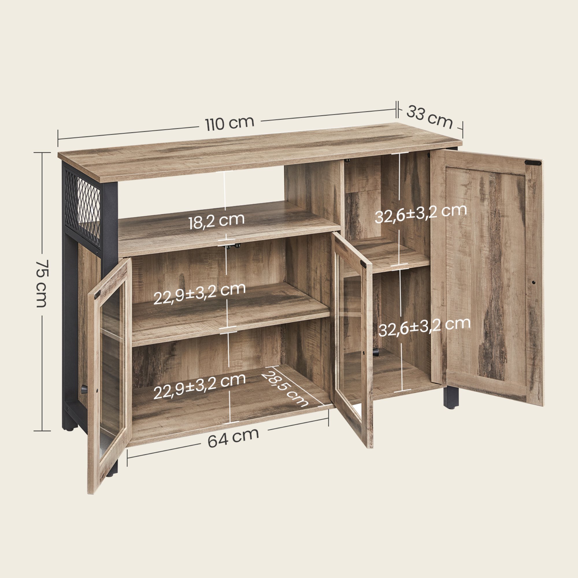 Komoda ponúka dostatok otvoreného aj uzatvárateľného úložného priestoru. Za jej dvierkami nájdete 2 vložené police. Tie sú nastaviteľné, a tak komodu môžete prispôsobiť vašim aktuálnym potrebám. Aby sa s dvierkami komody dobre manipulovalo, sú vybavené rúčkami.