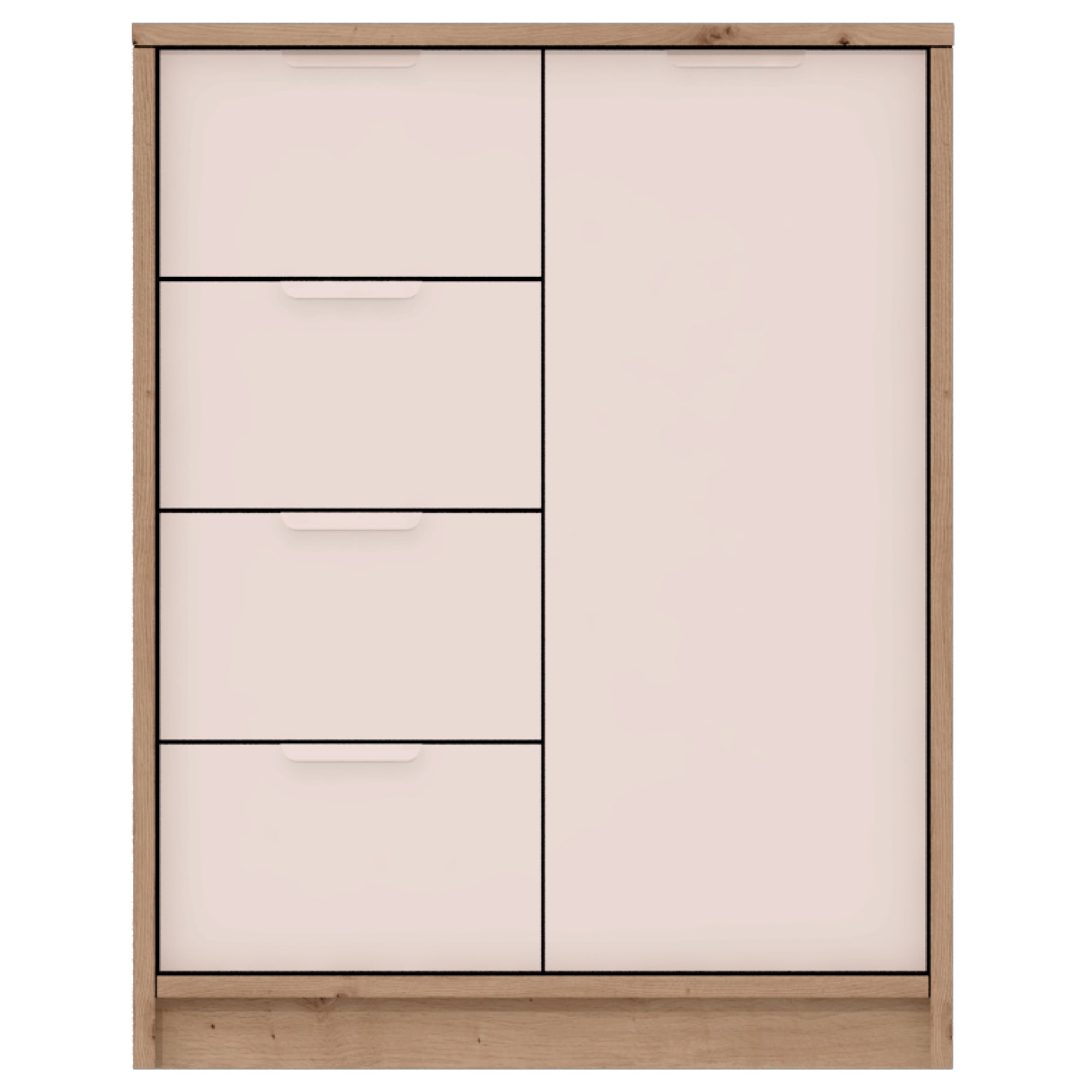 Elegantní komoda CANYON se postará o pořádek ve vaší domácnosti, která do ní zároveň vnese příjemnou atmosférou. Kombinácia prírodného dekoru duba artisan s farebnou prednou časťou pridáva komode na atraktívnosti. Úložný prostor zahrnuje čtyři zásuvky a dvířka s vnitřní policí, které jsou opatřeny praktickými úchytky. Laminovaný dřevěný materiál se vyznačuje snadnou údržbou.