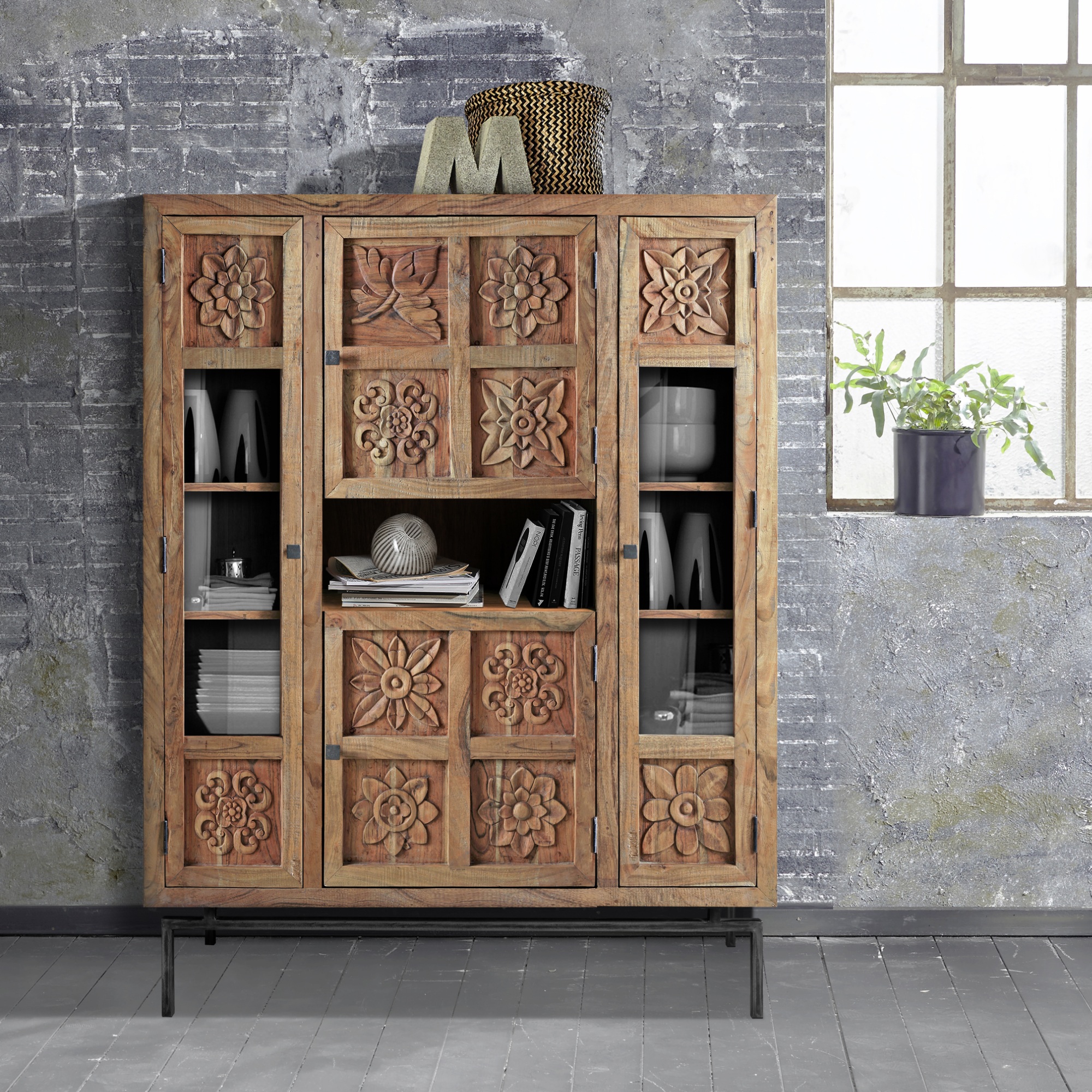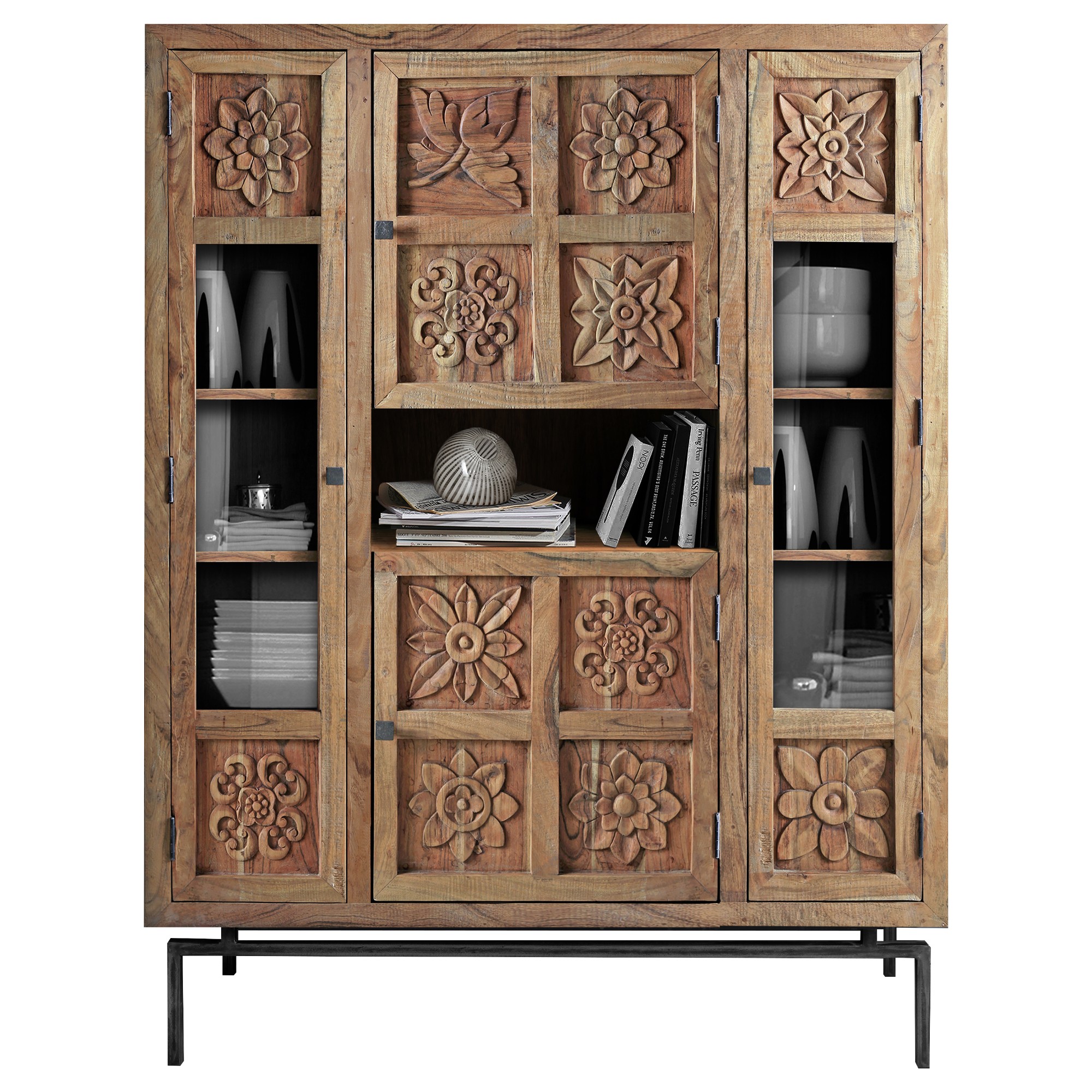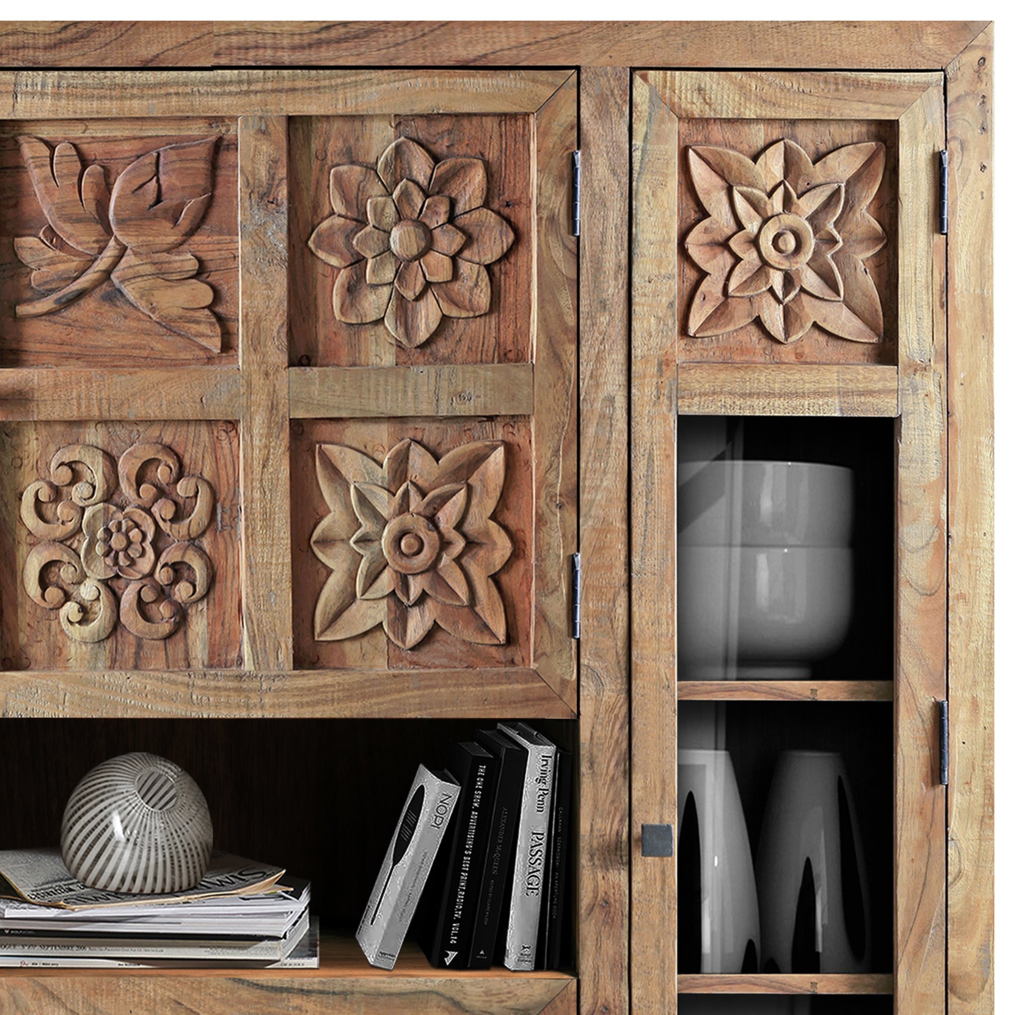 Luxusná komoda CARVING z masívneho dreva s vyrezávanými kvetinovými motívmi, kovovými nohami a kovaním. Komoda je vybavená štyrmi dvierkami, z čoho dve majú drevenú výplň a ďalšie dve majú sklenenú výplň kombinovanú s drevom. Uprostred komody sa nachádza otvorený odkladací priestor na menšie predmety, ktoré chcete mať po ruke. K výrobe je použité najkvalitnejšie agátové drevo. Nábytok z masívneho dreva prinesie kus prírody do vášho interiéru. Táto komoda je ručne vyrábaná a vďaka tomu je každý kus jedinečným originálom. Dodávané v zmontovanom stave.