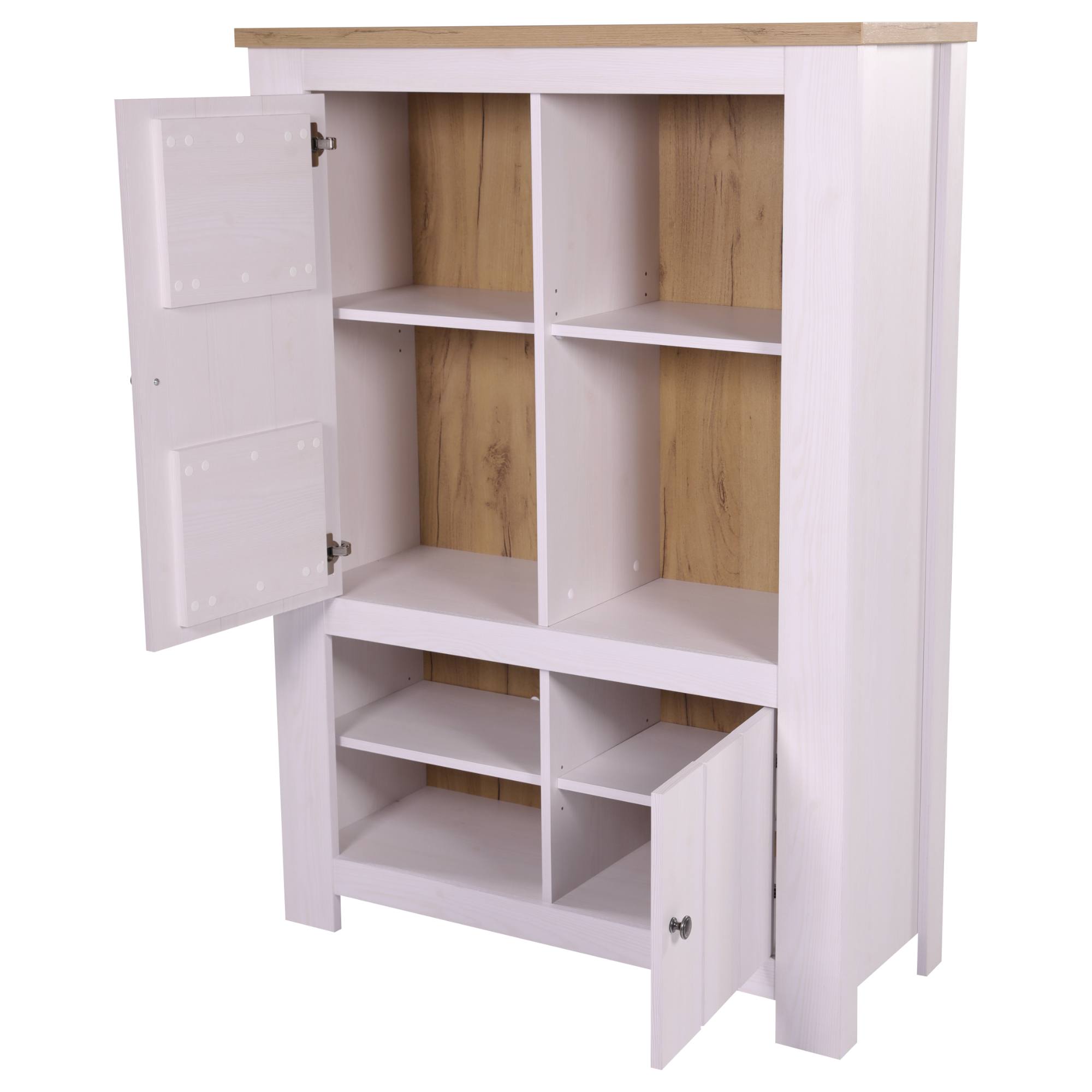 Vyrobená je v kombinácii laminovaného dreveného materiálu a drevovláknitých dosiek MDF, tieto materiály vynikajú ľahkou udržiavateľnosťou aj dlhou životnosťou. Ladená je do kontrastnej súhry smrekovca sibiu vo svetlom odtieni a duba evoke v prírodnom. Bohatý kombinovaný úložný priestor je členený do dvoch otvorených sekcií s policou, ďalšie dve sekcie delené policou kryjú dvierka s dekoratívnym frézovaním. Manipuláciu uľahčujú starožitne vyzerajúce kovové rúčky a tiché dovieranie softclose. Hrany nábytku sú navyše vybavené ABS hranami, ktoré znižujú riziko mechanického poškodenia.