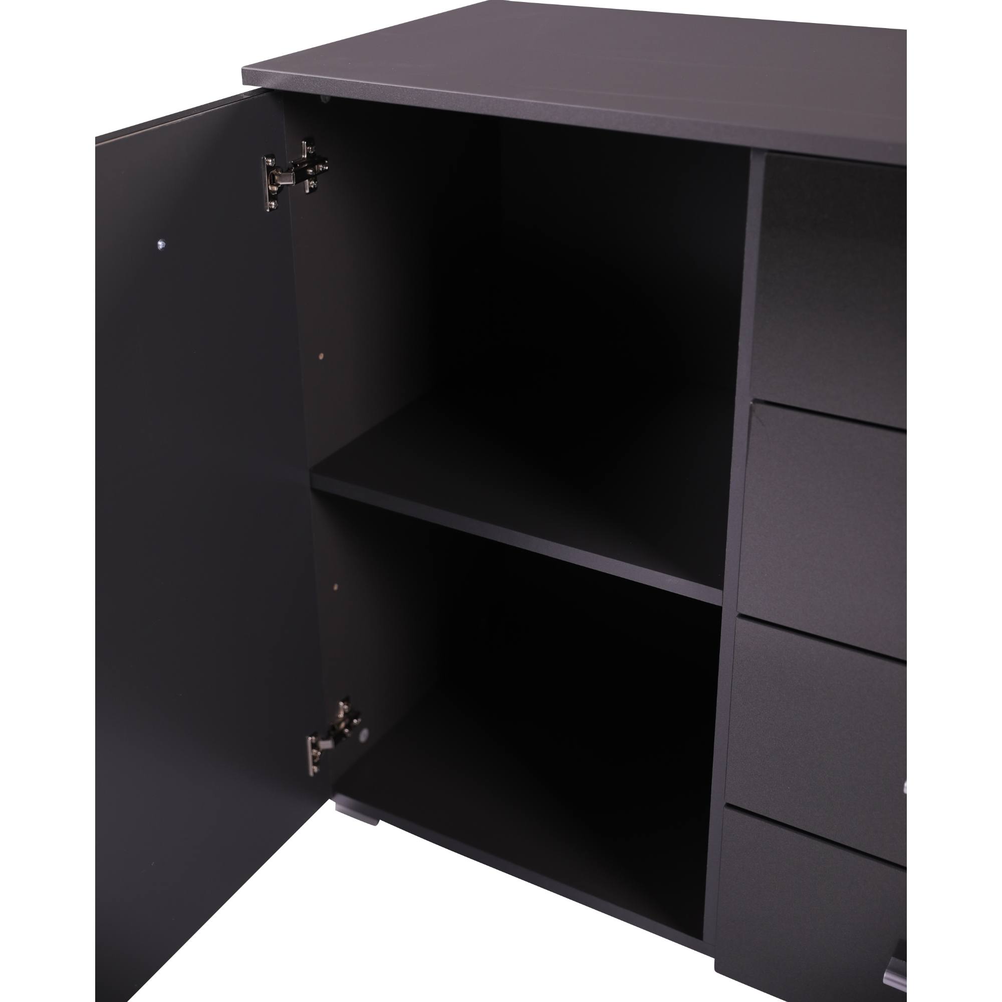 Disponuje dostatočným úložným priestorom v podobe štyroch zásuviek a dvoch dvierok s dvoma vnútornými policami. Tento obsiahly priestor využijete na širokú škálu predmetov, ktoré nechcete mať na očiach, ale vždy po ruke. Komoda sa vyznačuje ľahko udržiavateľným povrchom.