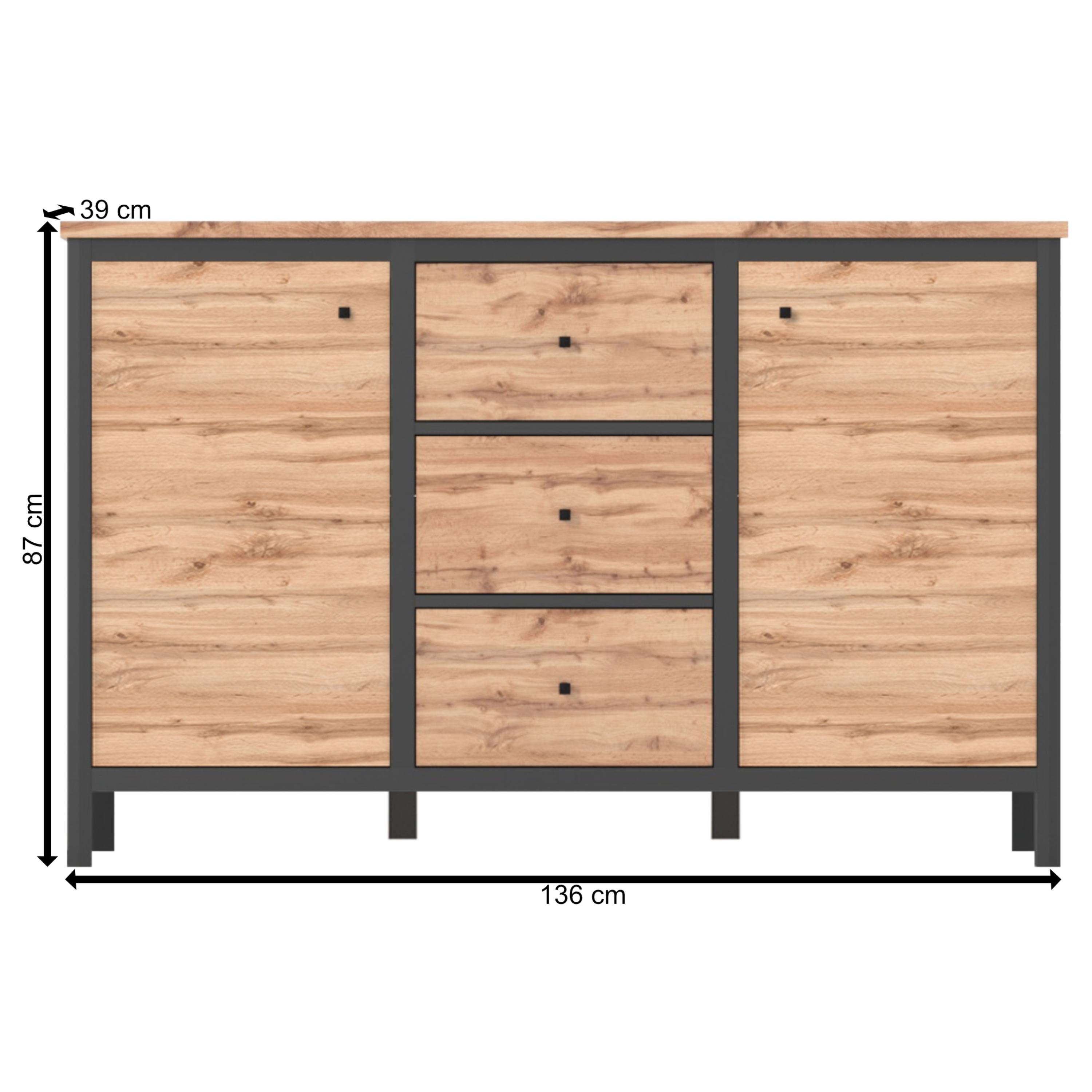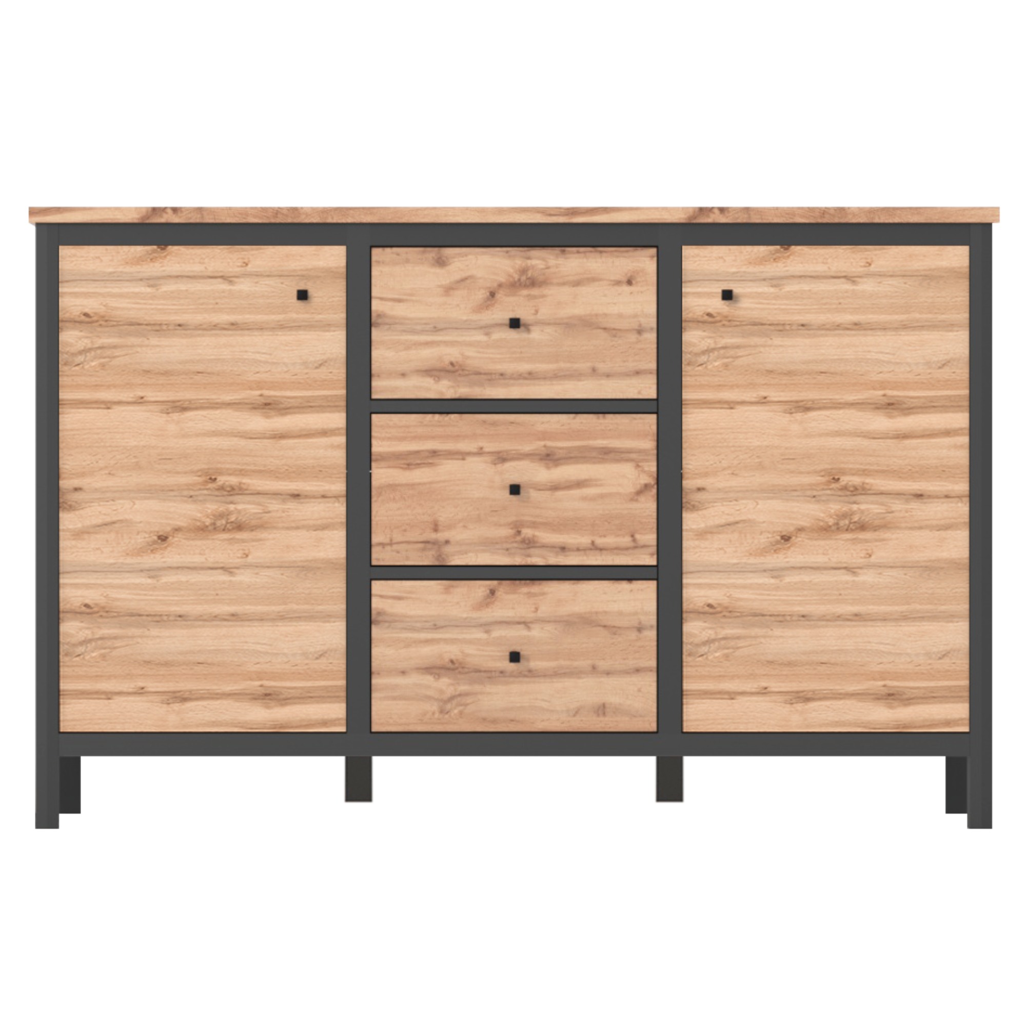 Komoda je vybavená 3 zásuvkami a 4 vloženými policami, a tak do nej môžete bezpečne uložiť všetko, čo potrebujete mať po ruke. Na jej výrobu bol použitý laminovaný drevený materiál, ktorý sa vyznačuje nielen jednoduchou udržiavateľnosťou, ale v prípade správnej starostlivosti aj dlhou životnosťou.