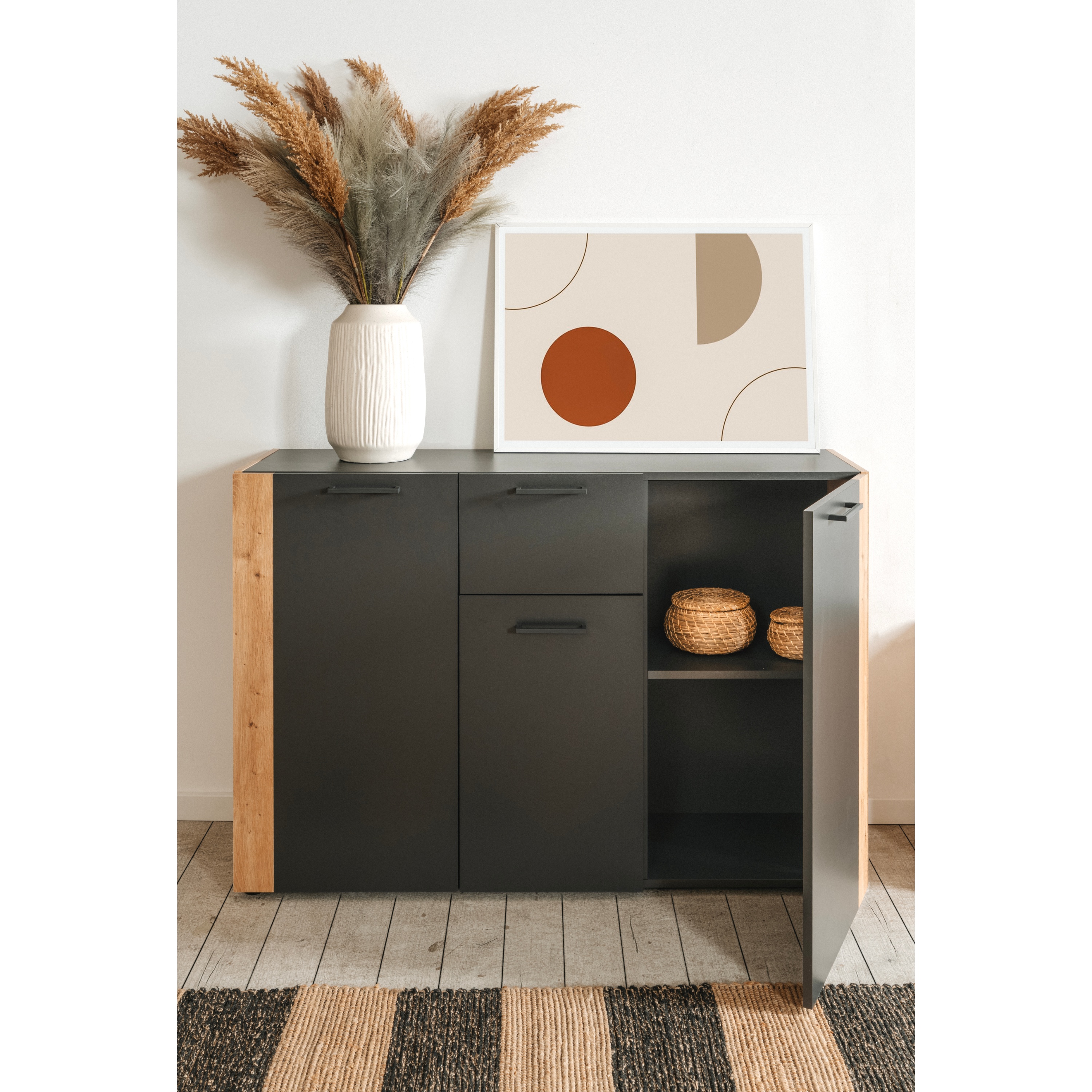 Komoda disponuje 1 zásuvkou a 3 policami, ktoré sa nachádzajú za otočnými dvierkami. Má teda bohatý úložný priestor, vďaka ktorému budete mať poruke všetko potrebné. Hlavným materiálom je tu drevotriesková doska v kombinácii s plastovými detailmi. Je doplnená dekorom duba artisan, ktorý dodáva do interiéru nádych prírody pomocou jeho vernej imitácie dreva. Svetlý dekor je kombinovaný s kontrastnou antracitovou farbou, ktorá dokonale vytvára dizajn tejto komody.