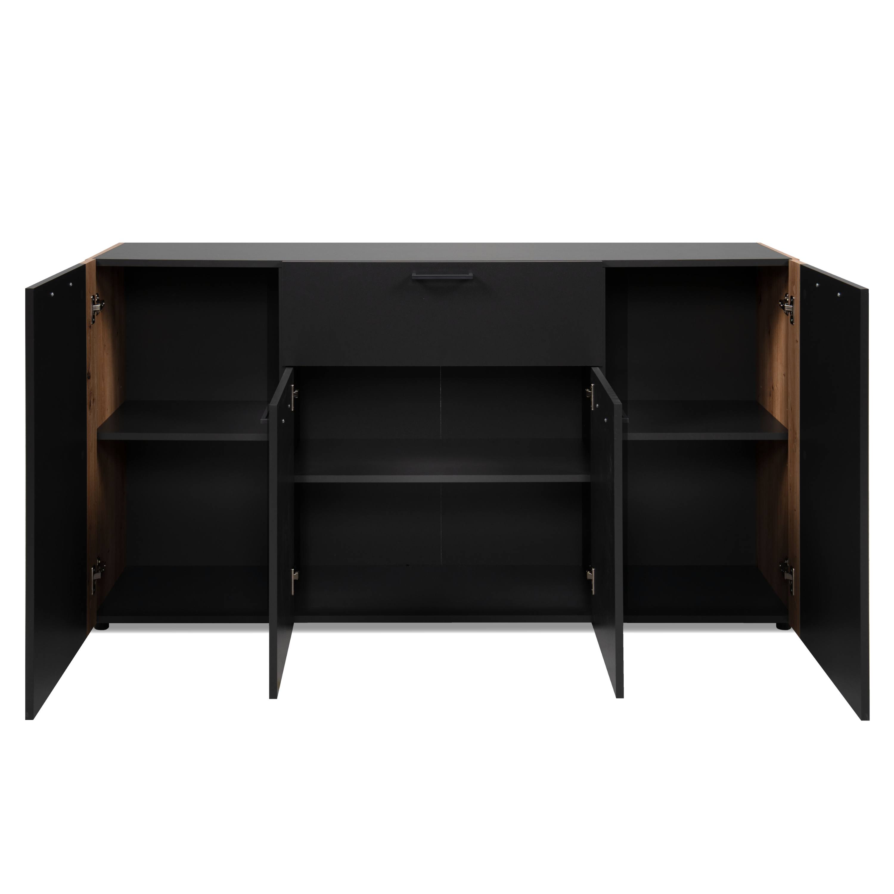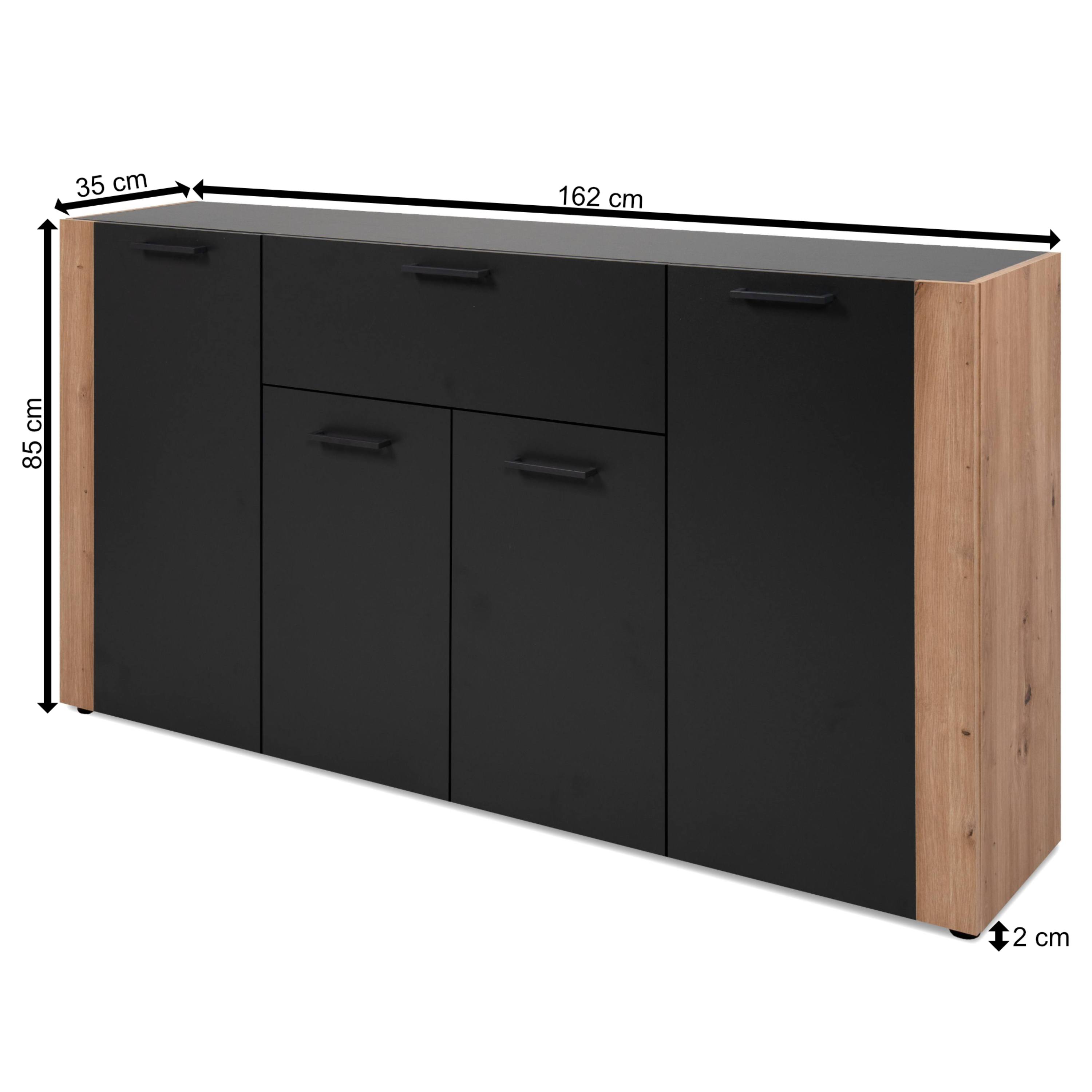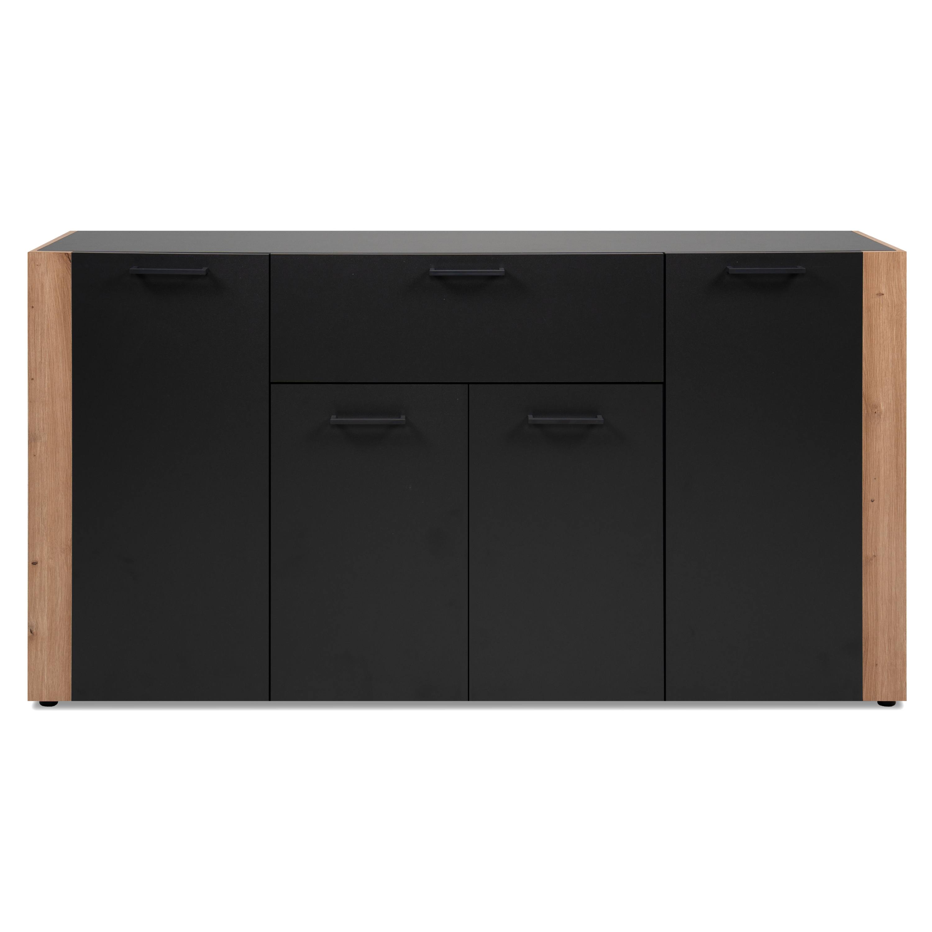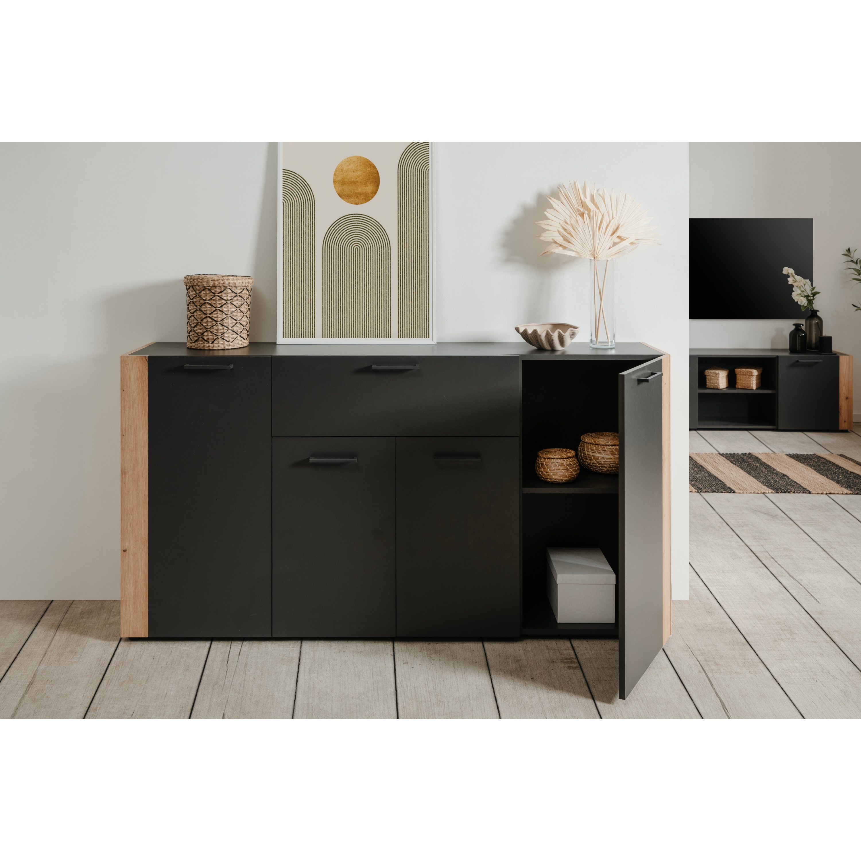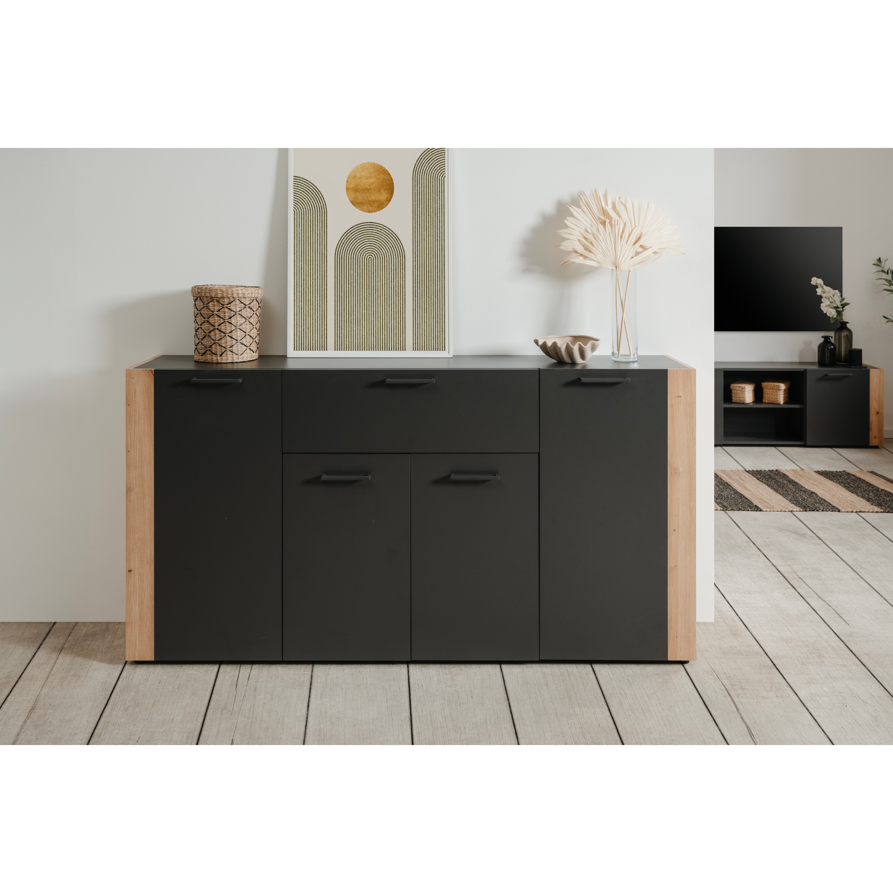 Komoda disponuje 1 zásuvkou a 3 policami, ktoré sa nachádzajú za otočnými dvierkami. Má teda bohatý úložný priestor, vďaka ktorému budete mať poruke všetko potrebné. Hlavným materiálom je tu drevotriesková doska v kombinácii s plastovými detailmi. Je doplnená dekorom duba artisan, ktorý dodáva do interiéru nádych prírody pomocou jeho vernej imitácie dreva. Svetlý dekor je kombinovaný s kontrastnou antracitovou farbou, ktorá dokonale vytvára dizajn tejto komody.