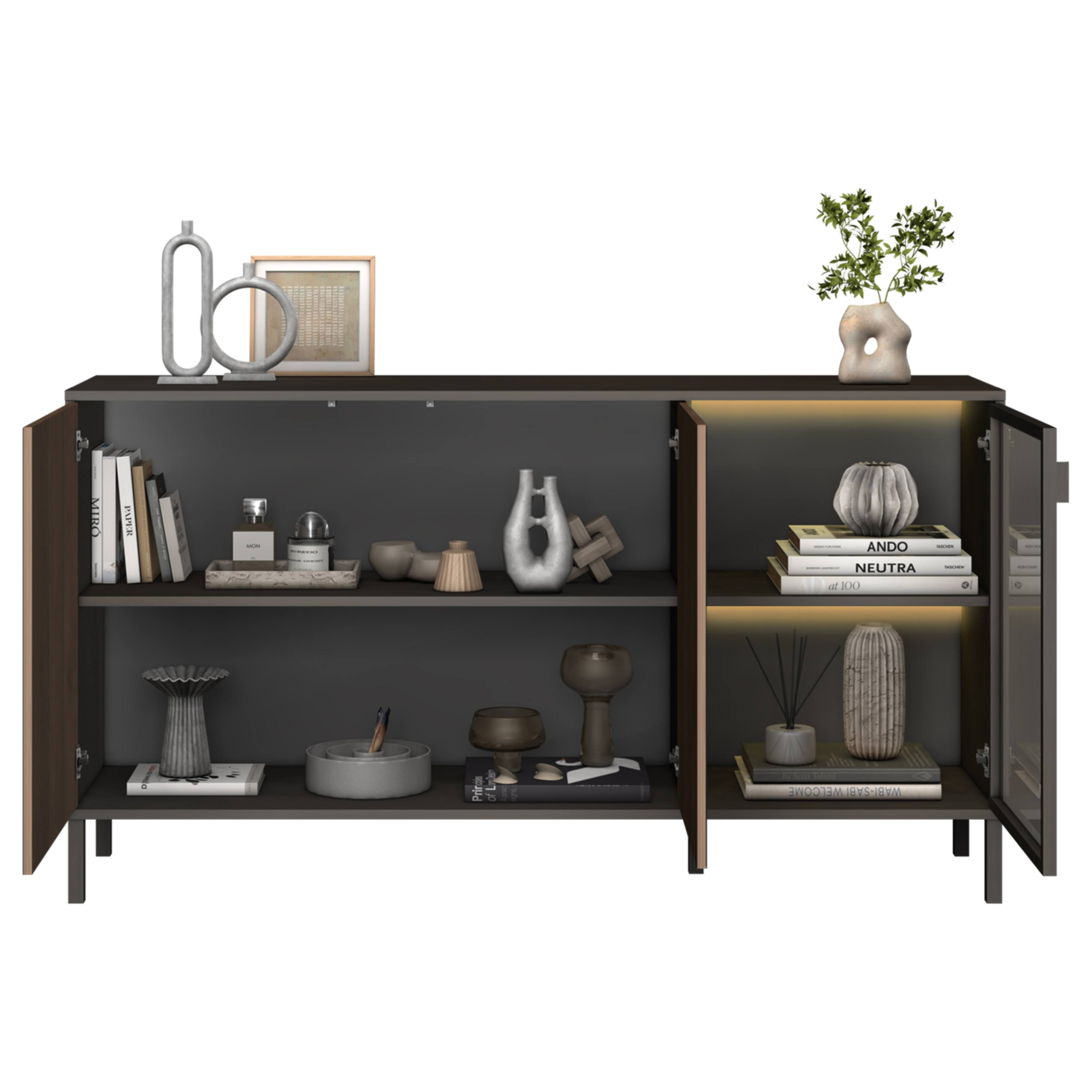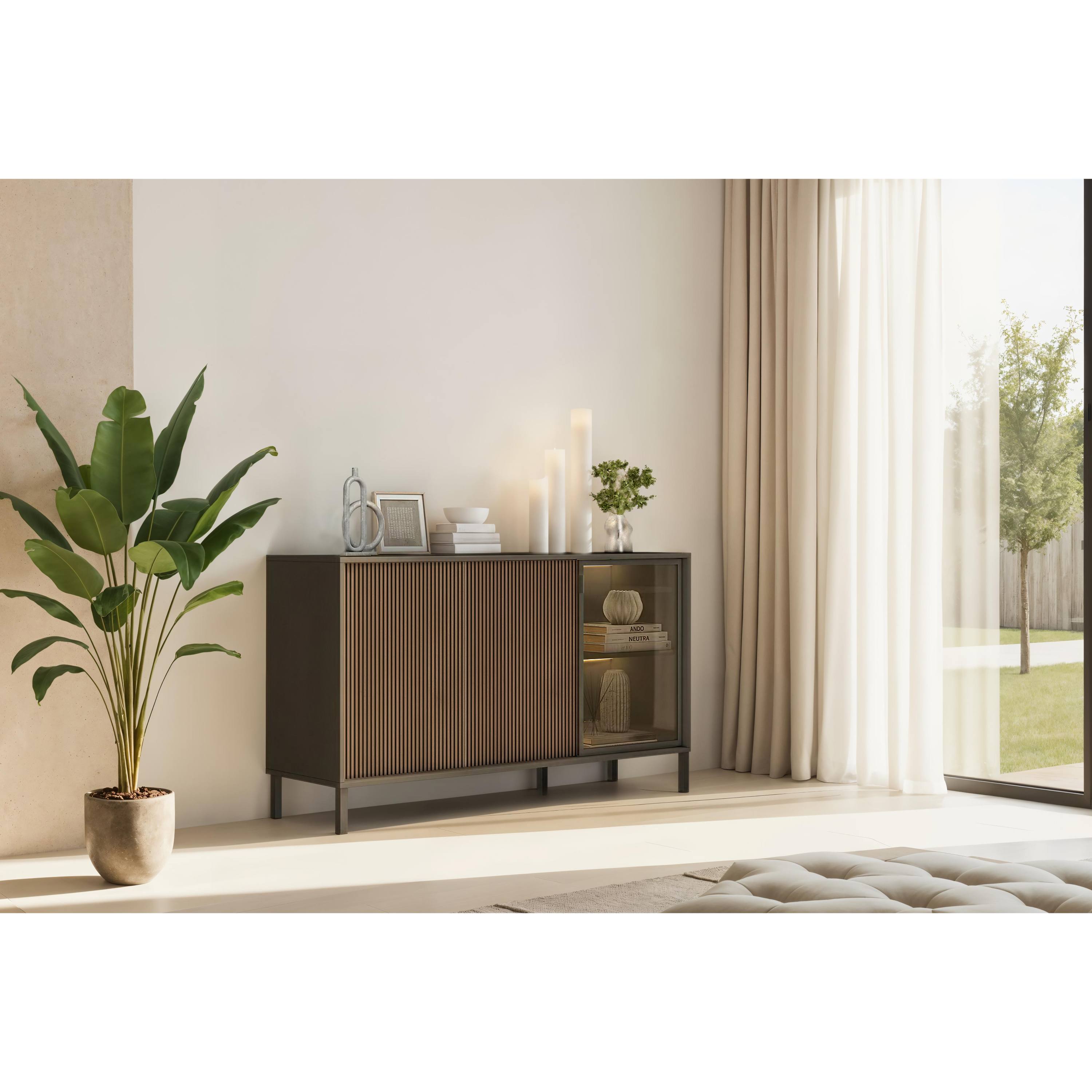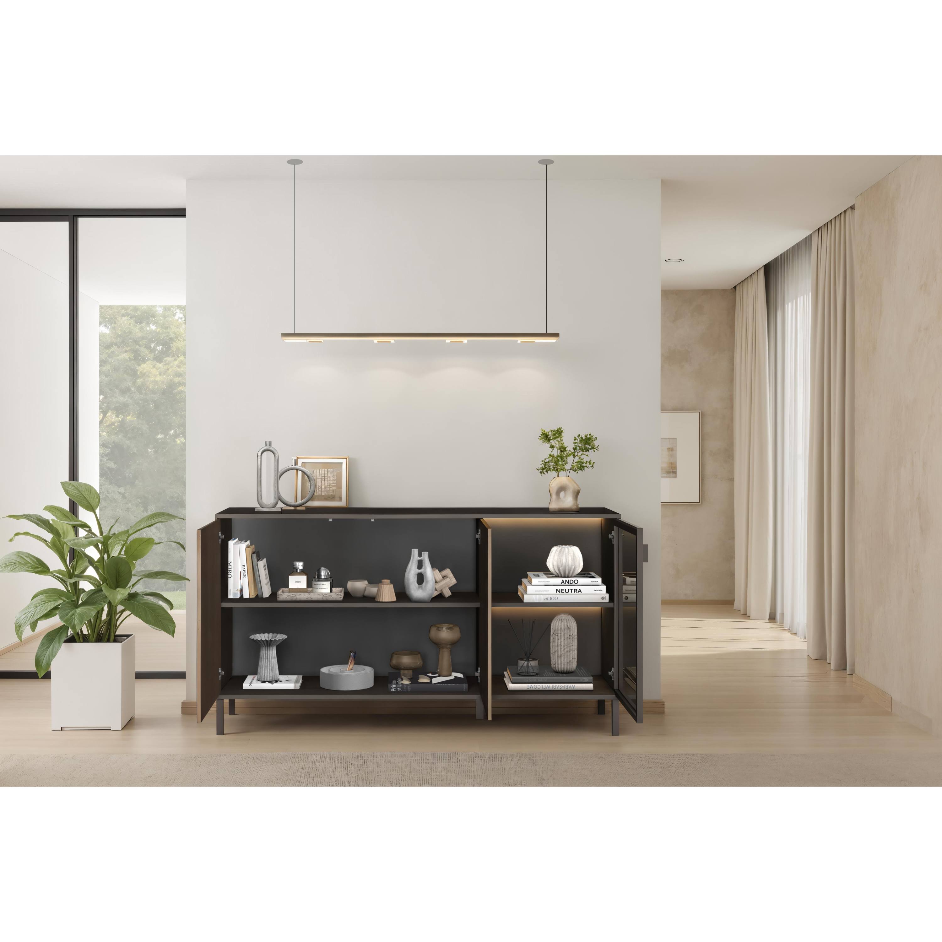 Za štandardnými a presklenými dvierkami komody CORTINA 3DS sa nachádzajú 2 vložené police, ktoré napomôžu k prehľadnému uloženiu vašich vecí. LED osvetlenie je súčasťou balenia.