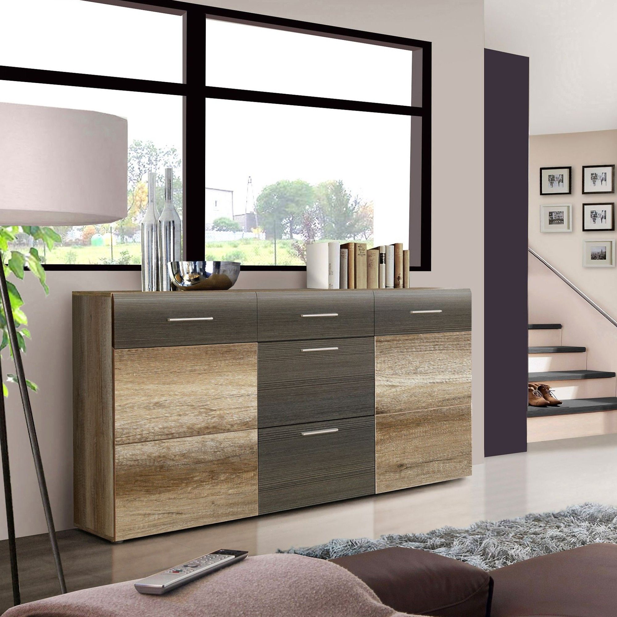 Viacúčelová komoda DANTE kombinuje moderný vzhľad a praktickosť. Na využitie ponúka 3 zásuvky, dve uzatvárateľné skrinky a dve vnútorné police. Dizajn dopĺňajú rúčky vo farbe chrómu.