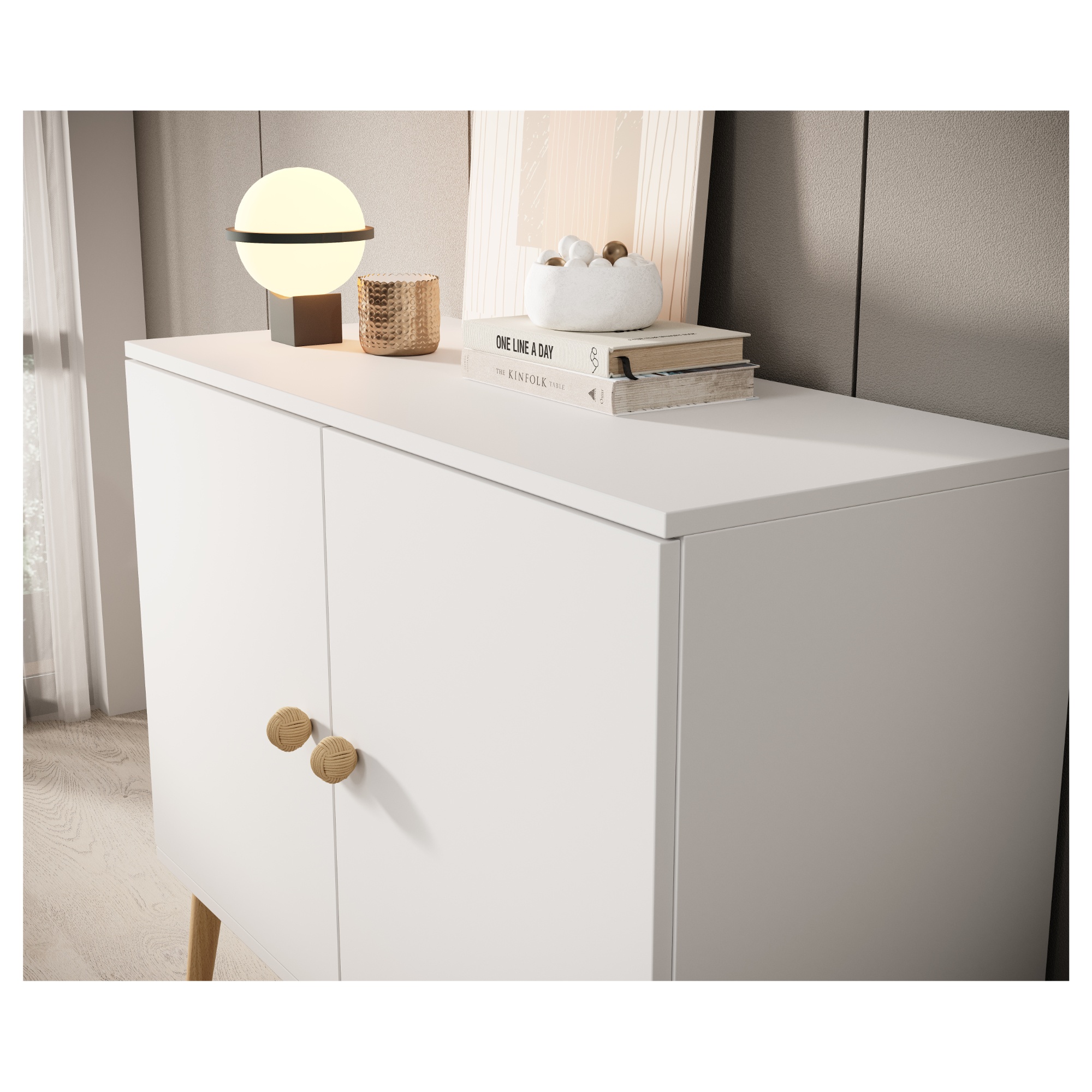 Vďaka 2 vloženým policam ponúka komoda dostatok úložného priestoru. Aby sa s jej dvierkami dobre manipulovalo, sú vybavené originálnymi povrázkovými rúčkami.
