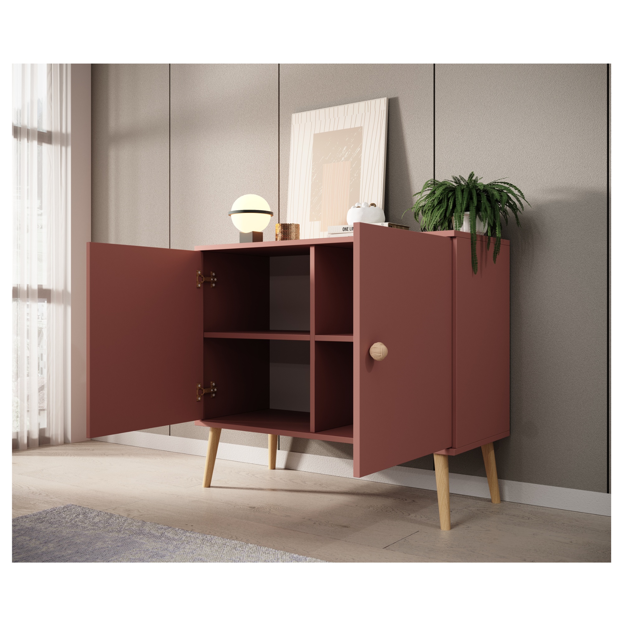 Vďaka 2 vloženým policam ponúka komoda dostatok úložného priestoru. Aby sa s jej dvierkami dobre manipulovalo, sú vybavené originálnymi povrázkovými jutovými rúčkami.