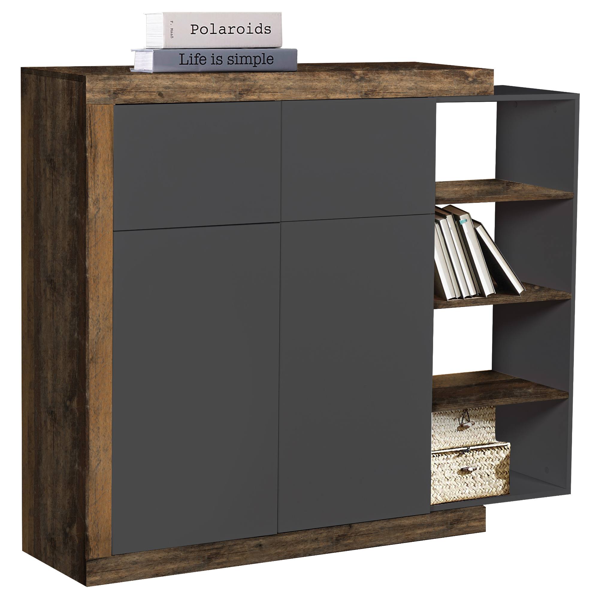 Otvorené priehradky s hornou doskou ideálne poslúžia na všetko, čo chcete mať vždy na očiach, ale priestor môžete vyplniť aj dekoráciami. Ostatné predmety zase uložíte do uzatvárateľného priestoru, ktorý je chránený dvierkami. Laminovaný drevený materiál sa ľahko udržuje.