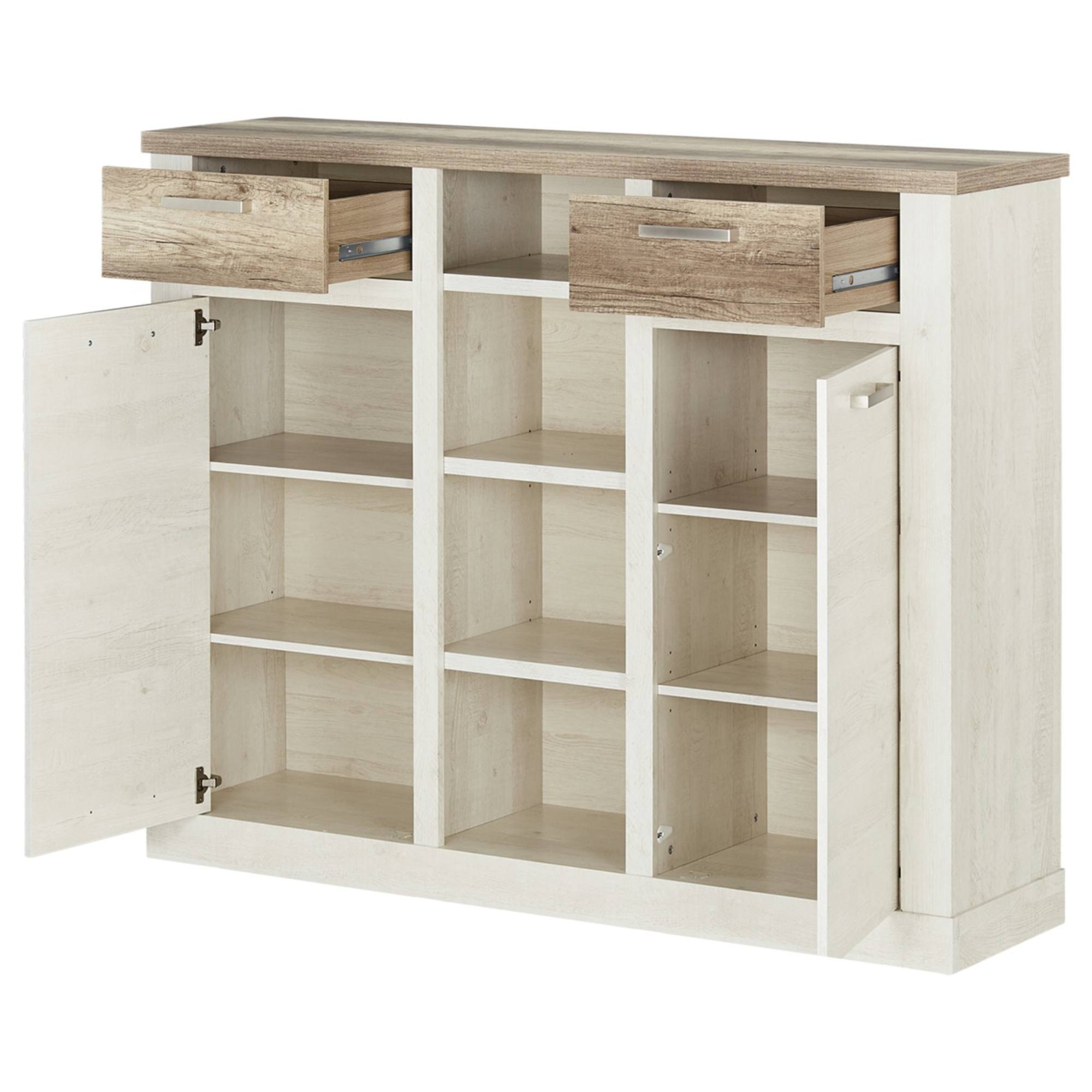 Laminovaná konštrukcia, ktorú zvýrazňuje elegantný vintage dizajn, ponúka dostatok priestoru na vaše dekorácie, knihy či iné drobnosti. 2 skrinky s policami a dvierkami, 2 zásuvky aj otvorené police zaisťujú vysokú úžitkovú hodnotu zabalenú do elegantného interiérového solitéru. Materiál ľahko udržiavateľné lamino. Vďaka svojmu dizajnu skvele zapadne do interiéru vo svetlých a pastelových tónoch.