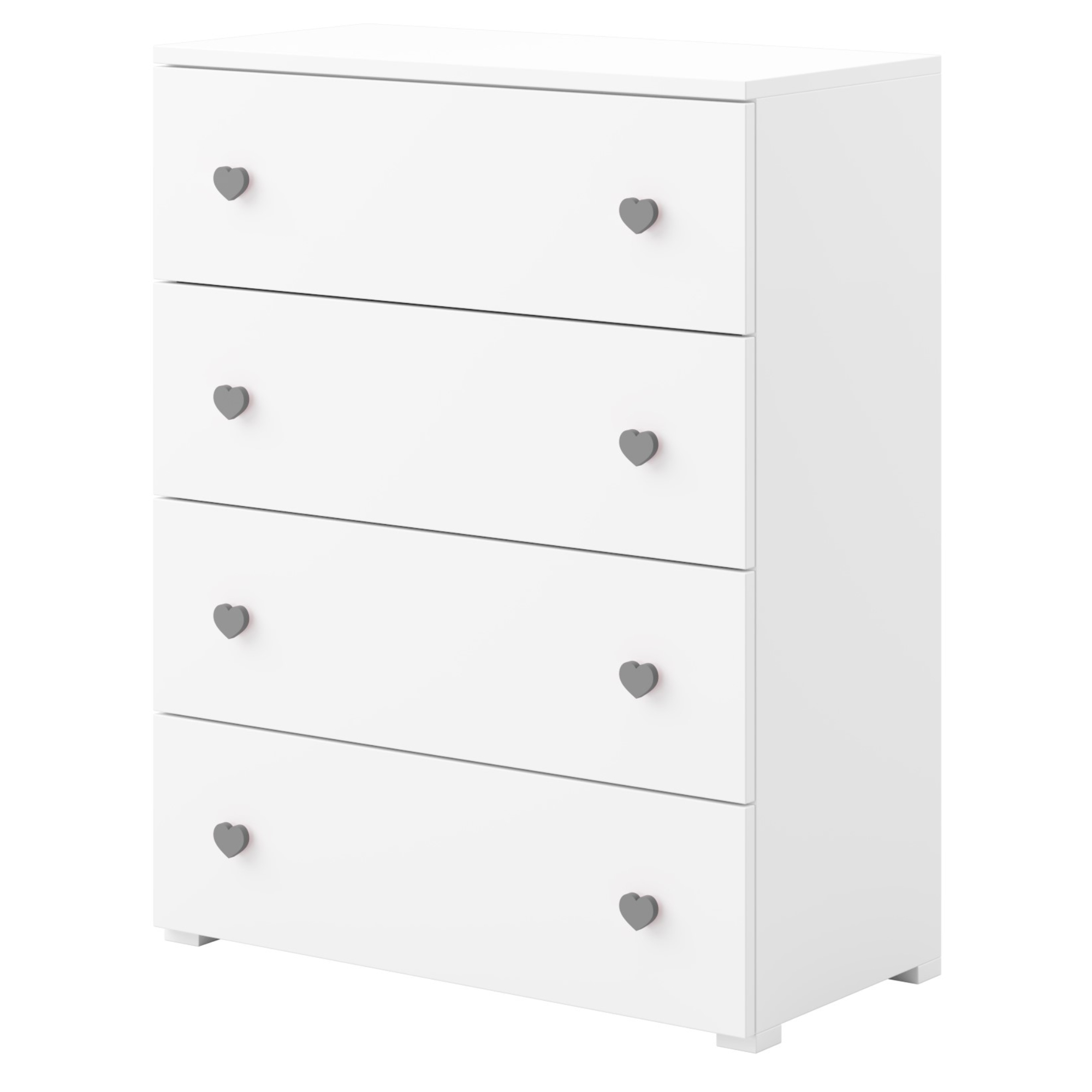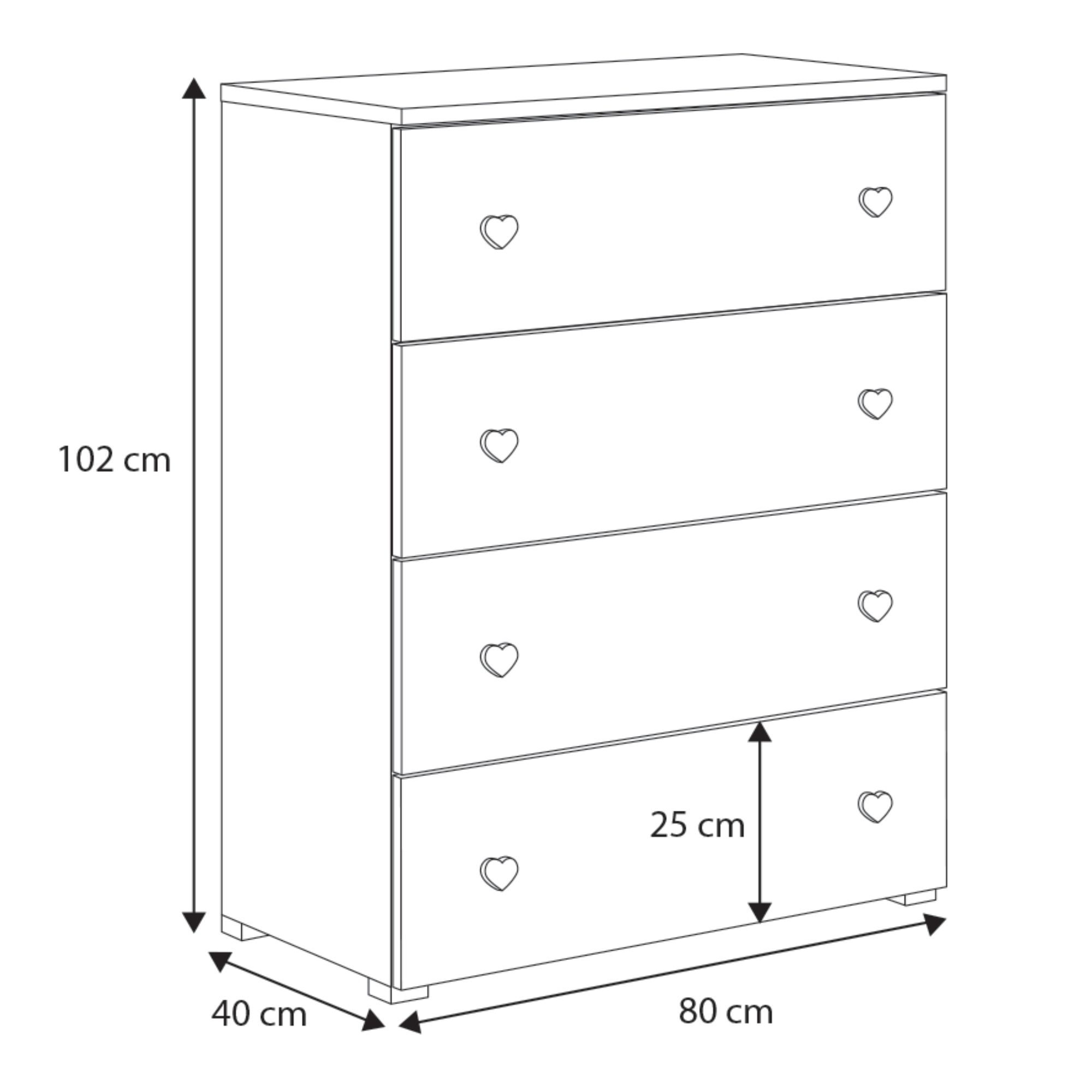 Vďaka 4 zásuvkám ponúka komoda dostatok úložného priestoru. Aby sa so zásuvkami dobre manipulovalo, sú vybavené originálnymi rúčkami v tvare srdiečok.
