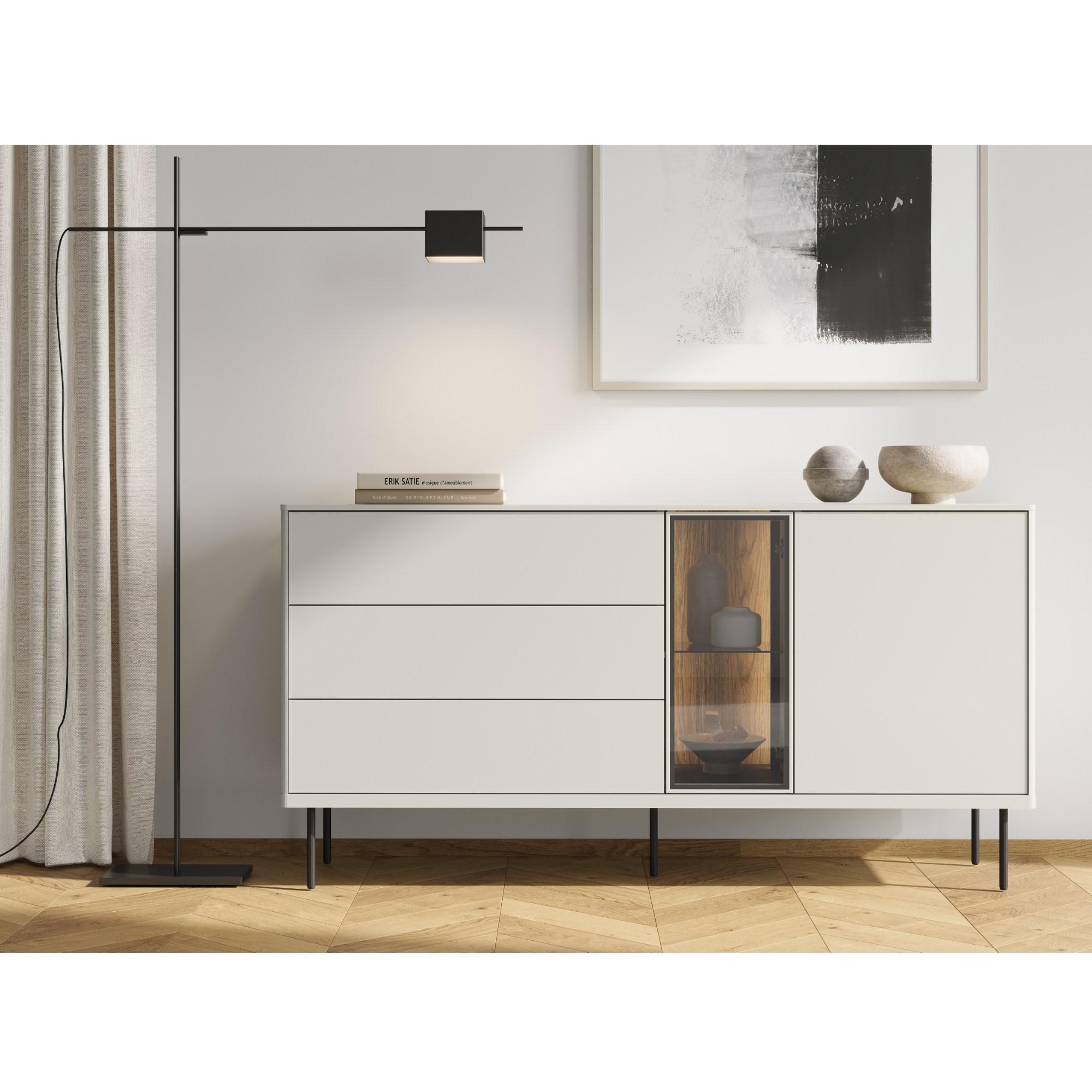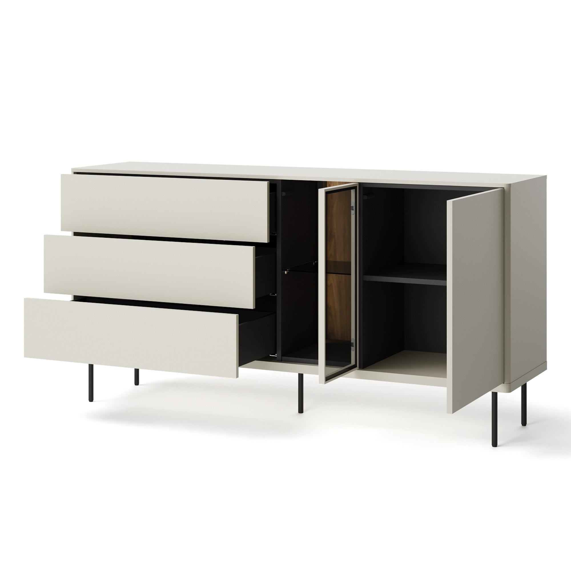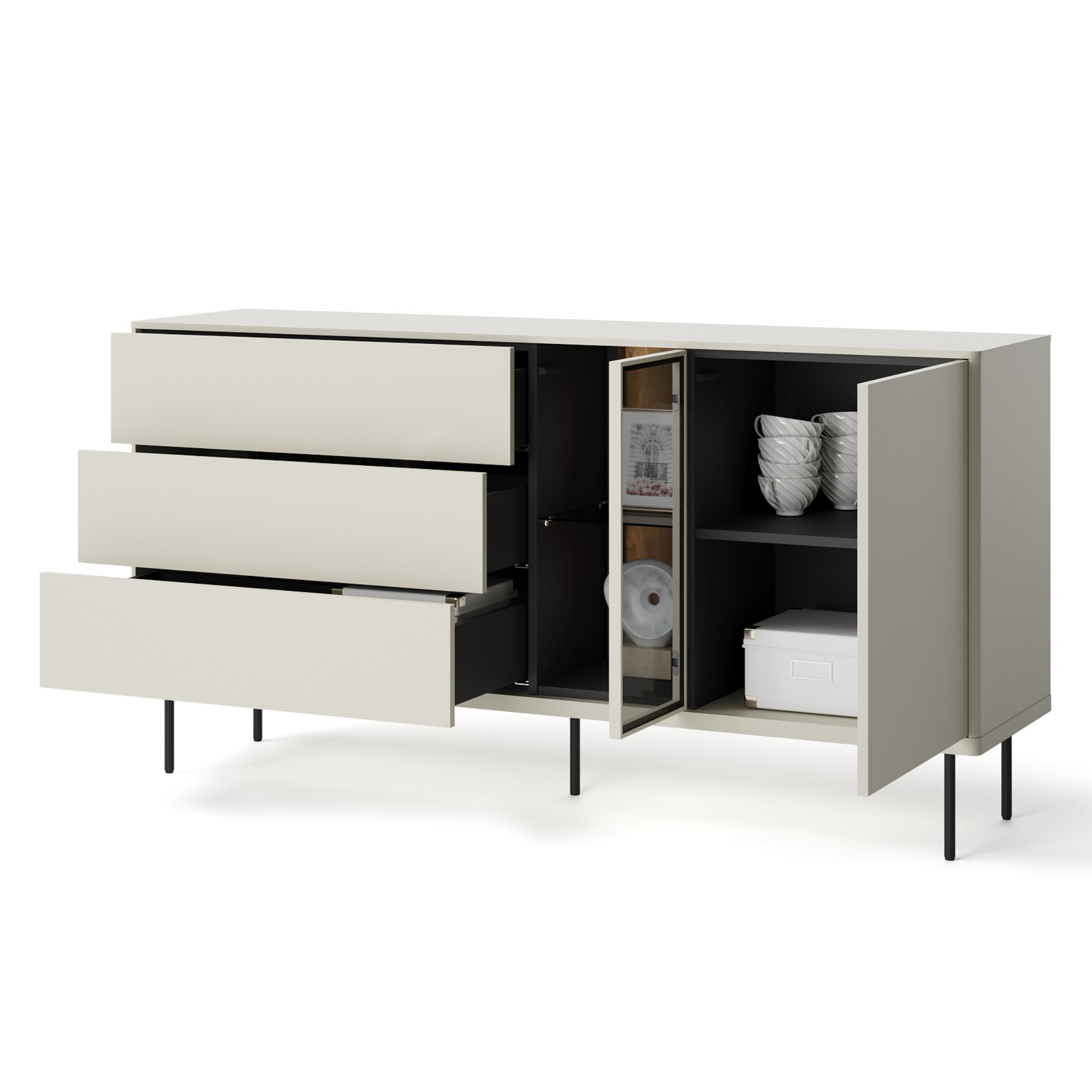 Komoda ponúka dostatok úložného priestoru. Okrem 3 zásuviek disponuje aj 2 vloženými policami, z ktorých 1 je zo skla. Nechýba ani LED osvetlenie, ktoré umožní predmetom vystaveným za presklenými dvierkami vyniknúť naplno.