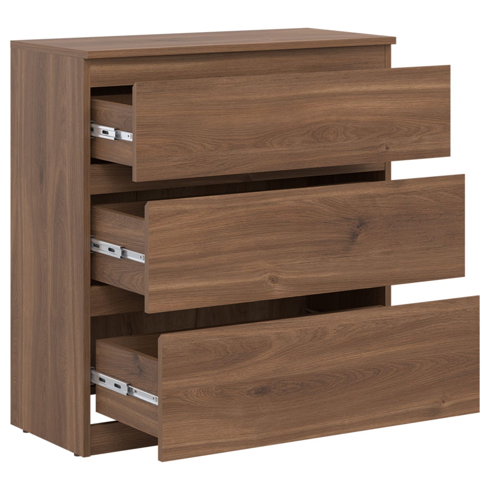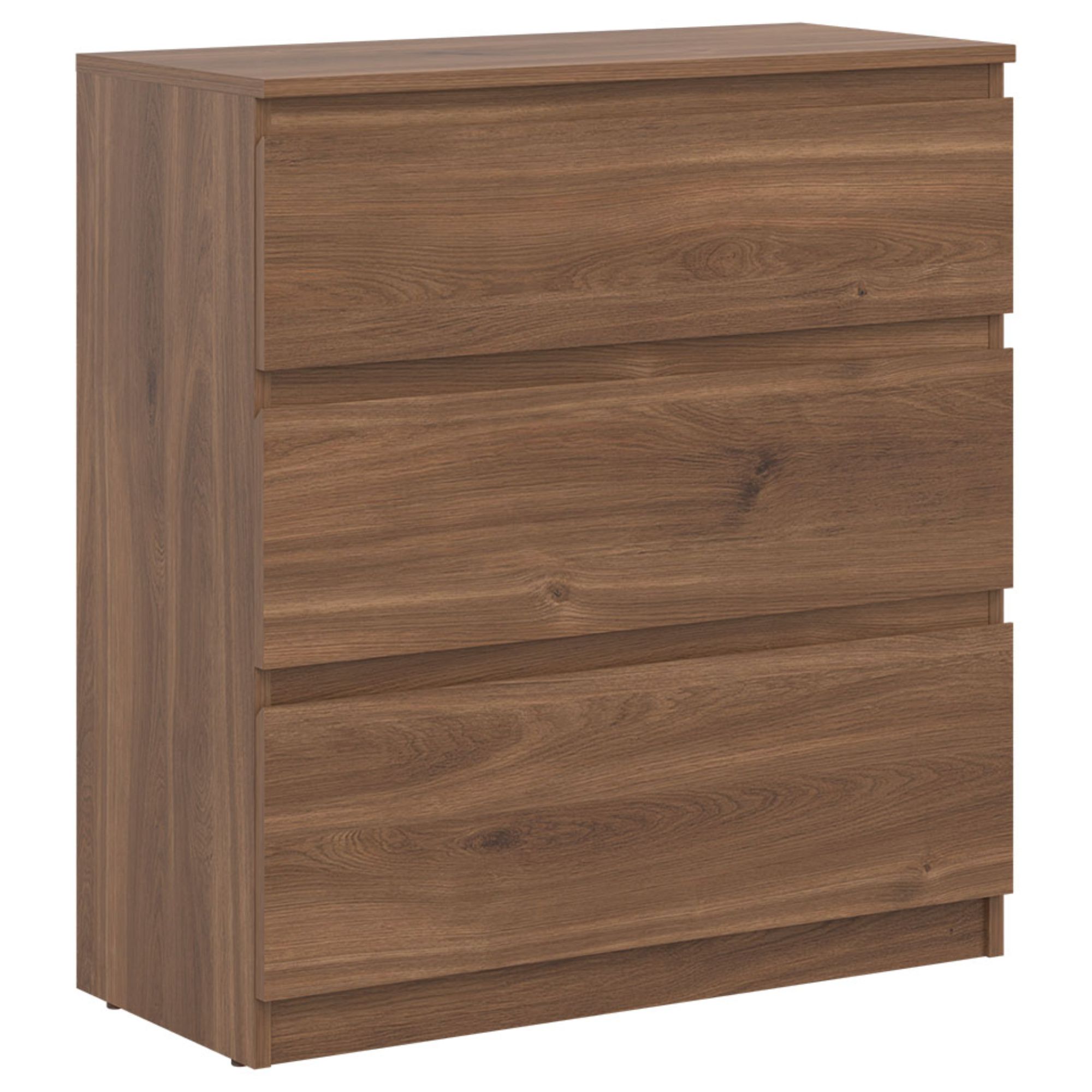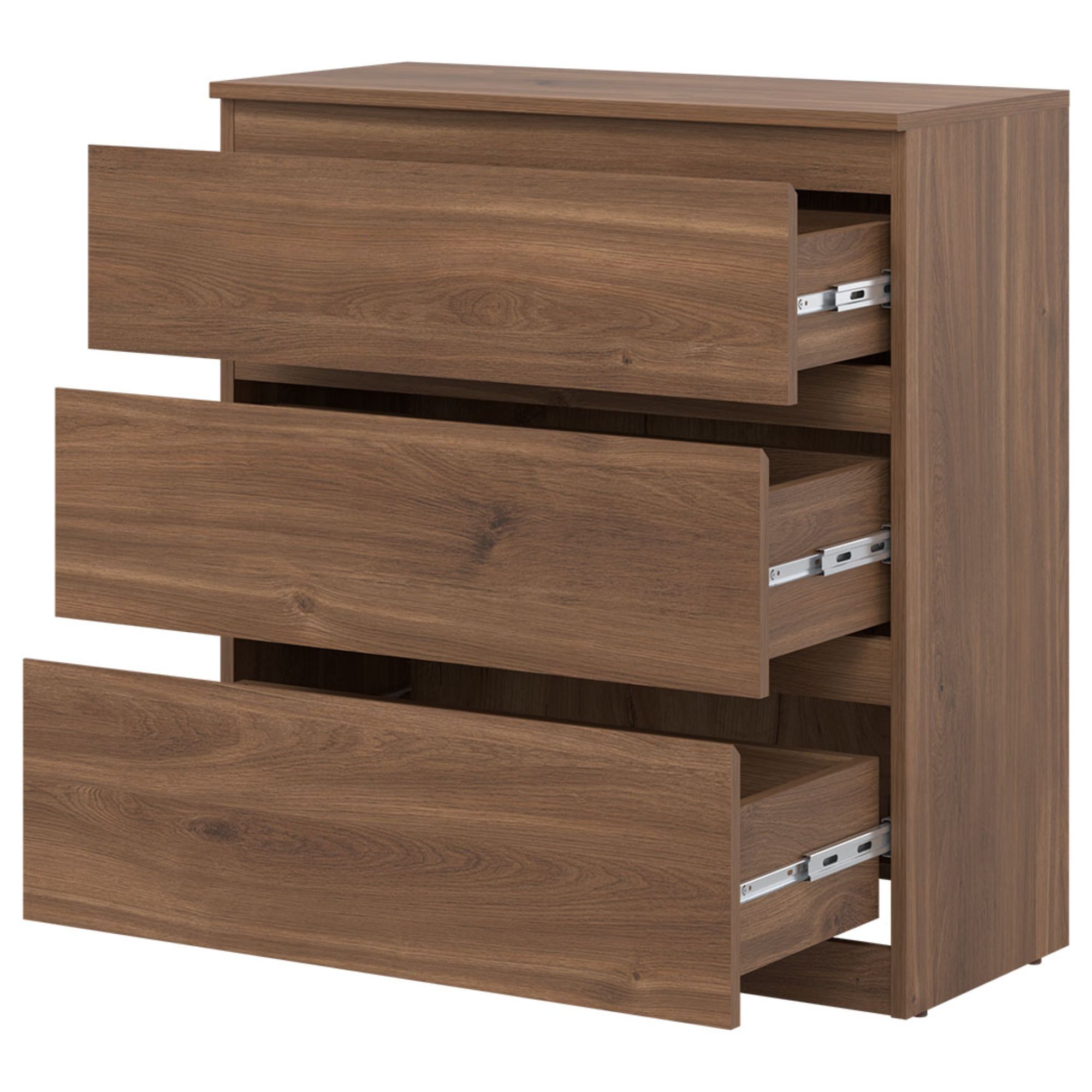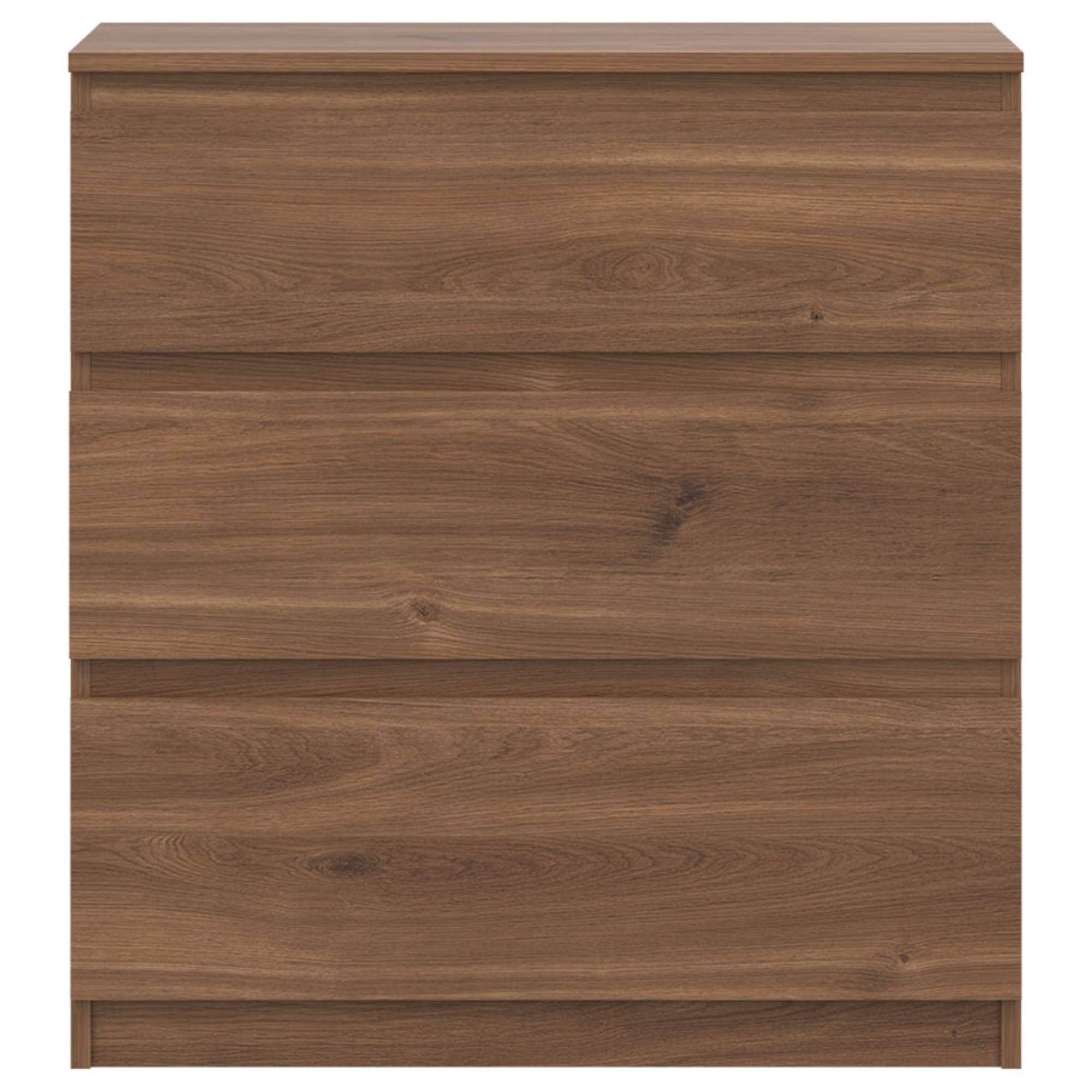 Vyrobená je z laminovaného dreveného materiálu, pre ktorý je typická ľahká udržiavateľnosť a dlhá životnosť. Dostatočný úložný priestor zaisťujú okrem hornej dosky aj tri zásuvky. Bezrúčkové vyhotovenie pridáva na čistom vzhľade. Podporte štýl domácnosti s komodou ERNIE RM02.