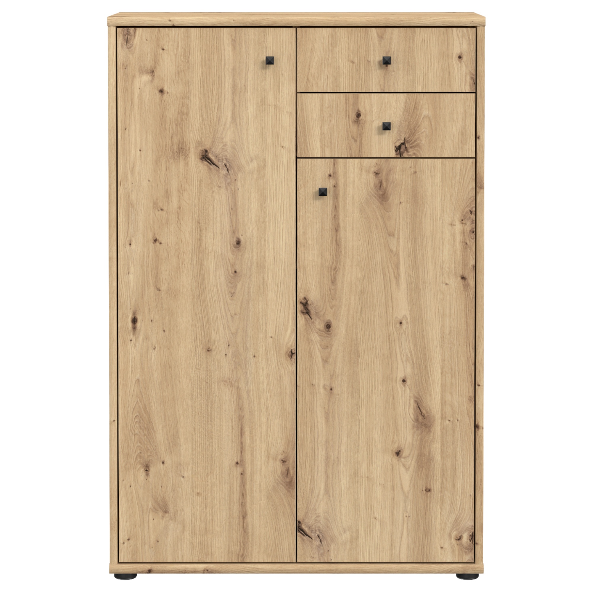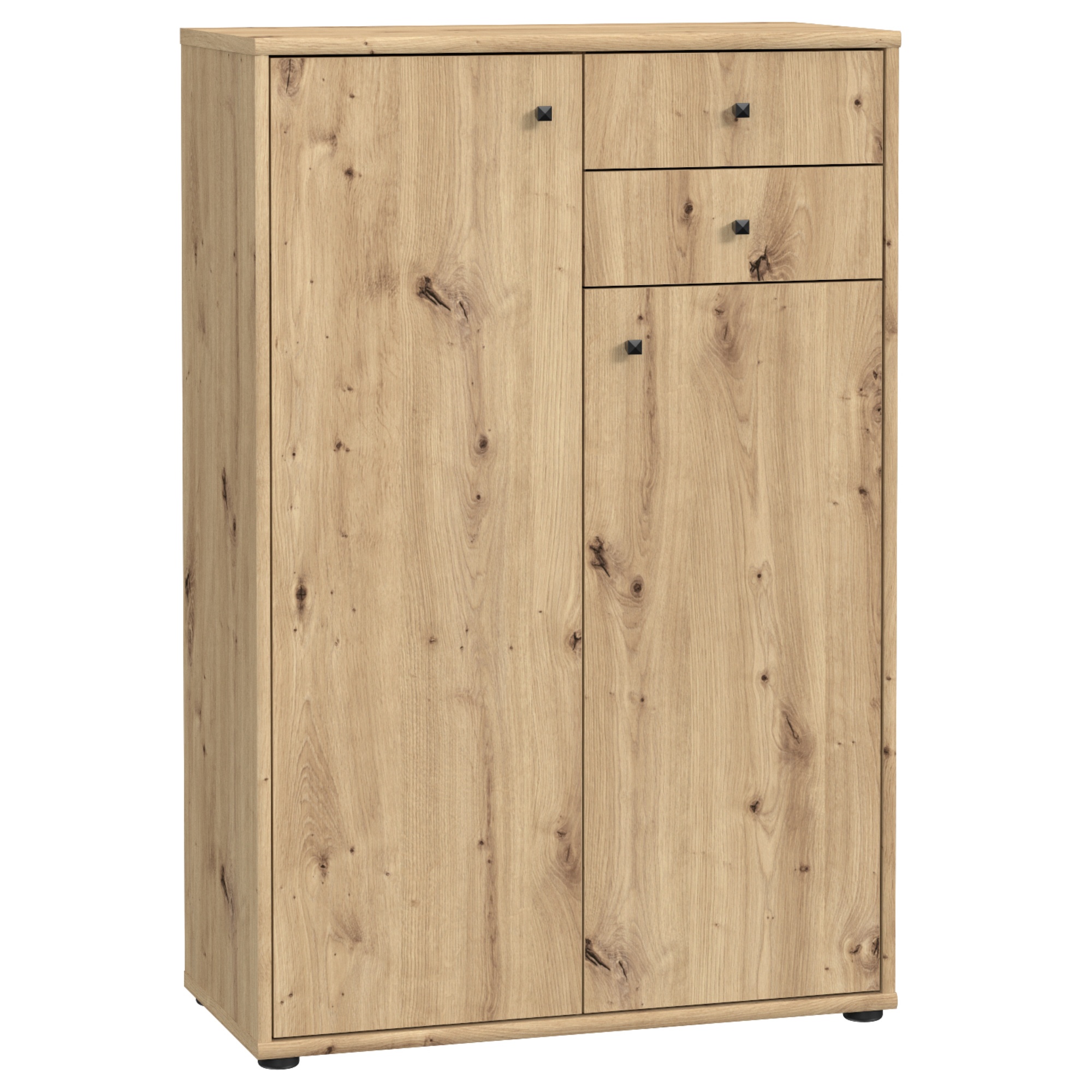 Vďaka priestoru v policiach a zásuvkách budete mať vždy prehľad o vašich uložených veciach. Decentné rúčky plnia praktickú funkciu na ľahšie otváranie. Horná doska navyše poslúži na umiestnenie vašich sezónnych dekorácií, fotografií či izbových rastlín. Komoda je vyrobená z materiálu, ktorý je ľahký na údržbu.