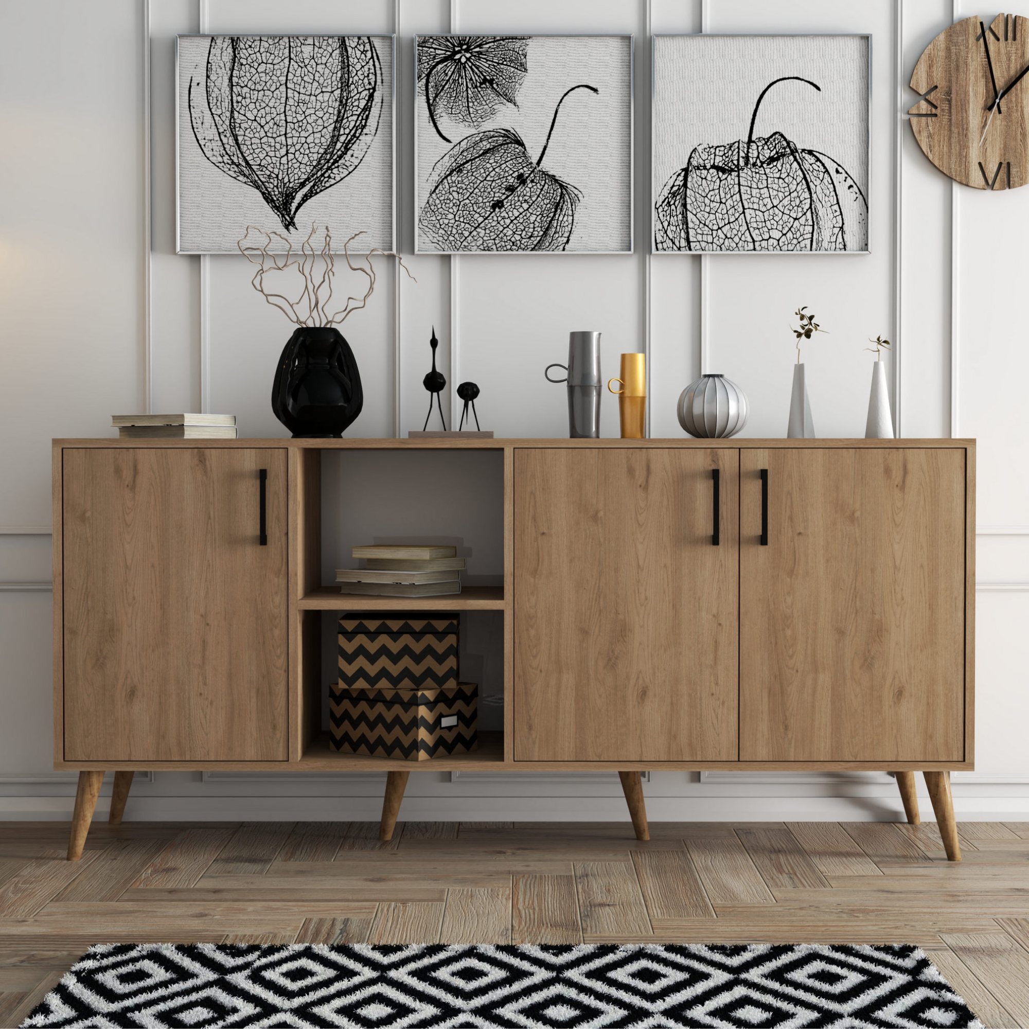 Je vyrobená z laminovanej drevotrieskovej dosky v dekore duba a jej nohy sú z masívneho dreva. Komoda disponuje veľkým úložným priestorom, ktorý je tvorený dvoma uzavretými skrinkami (jedna je jednodverová a druhá dvojdverová) a otvoreného priestoru, ktorý je predelený vloženou policou, toto miesto je ideálne na vystavenie dekorácií.