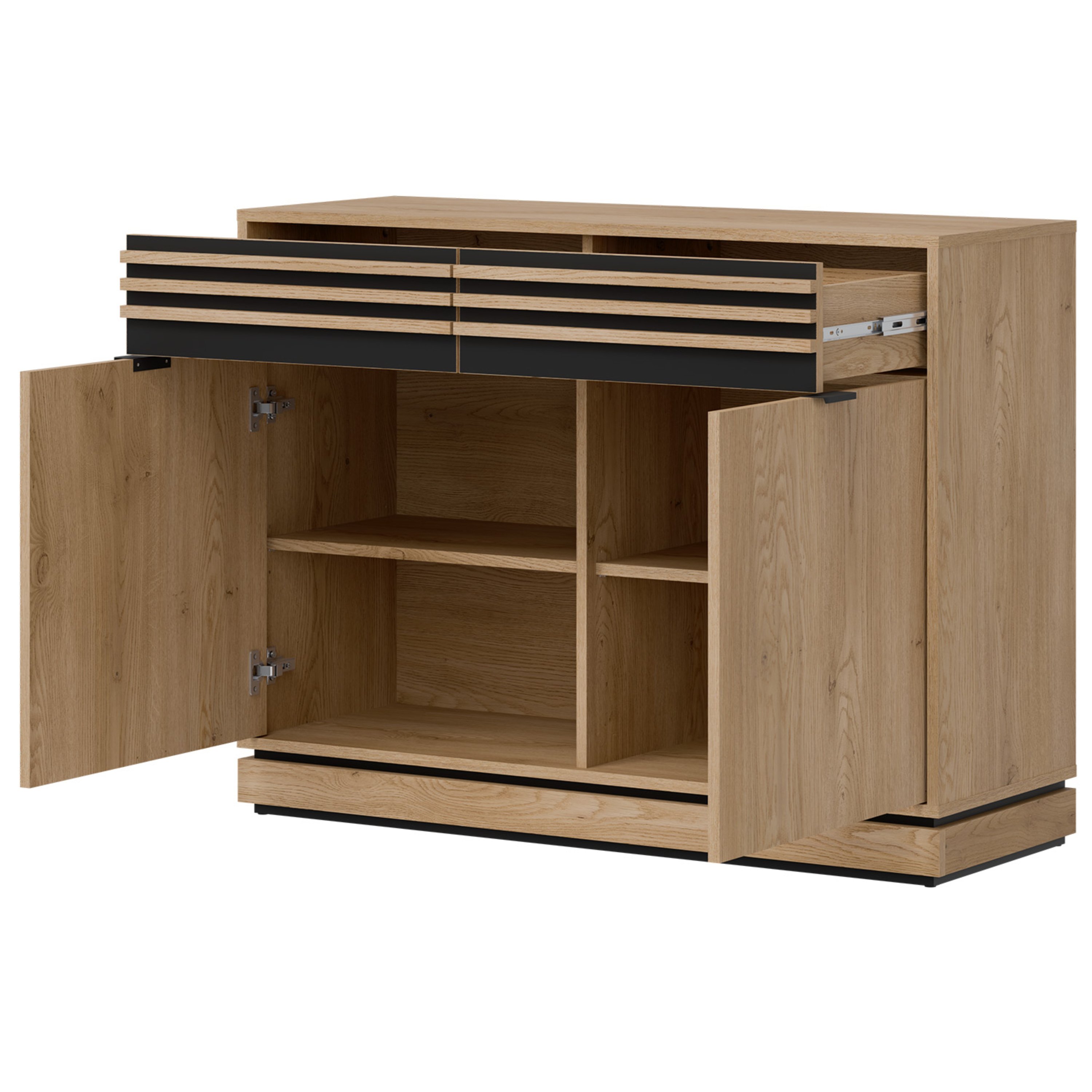Vybavená je párom otočných dvierok, ktoré sú pre jednoduchšiu manipuláciu osadené praktickými kovovými úchytkami. Jednoducho riešené vnútorné vybavenie pozostáva z 2 vložených políc a 2 zásuviek na prehľadné skladovanie. Na vystavenie dekorácií alebo odloženie vecí dennej potreby môžete využiť vrchnú dosku. Komoda je vyrobená z laminovanej drevotriesky a doplnená o plastové klzáky, ktoré chránia vašu podlahu.