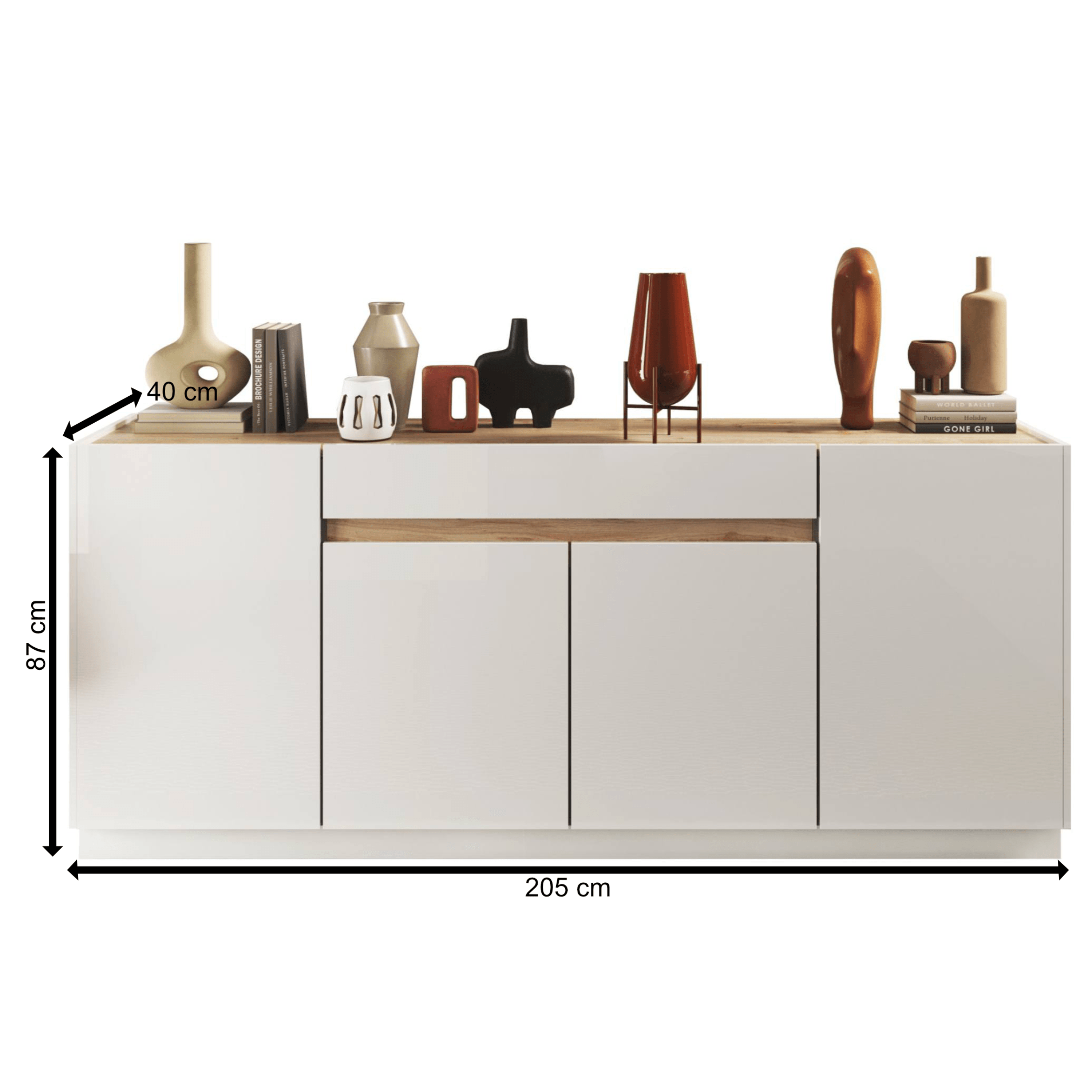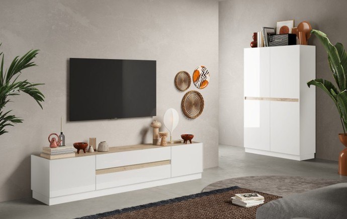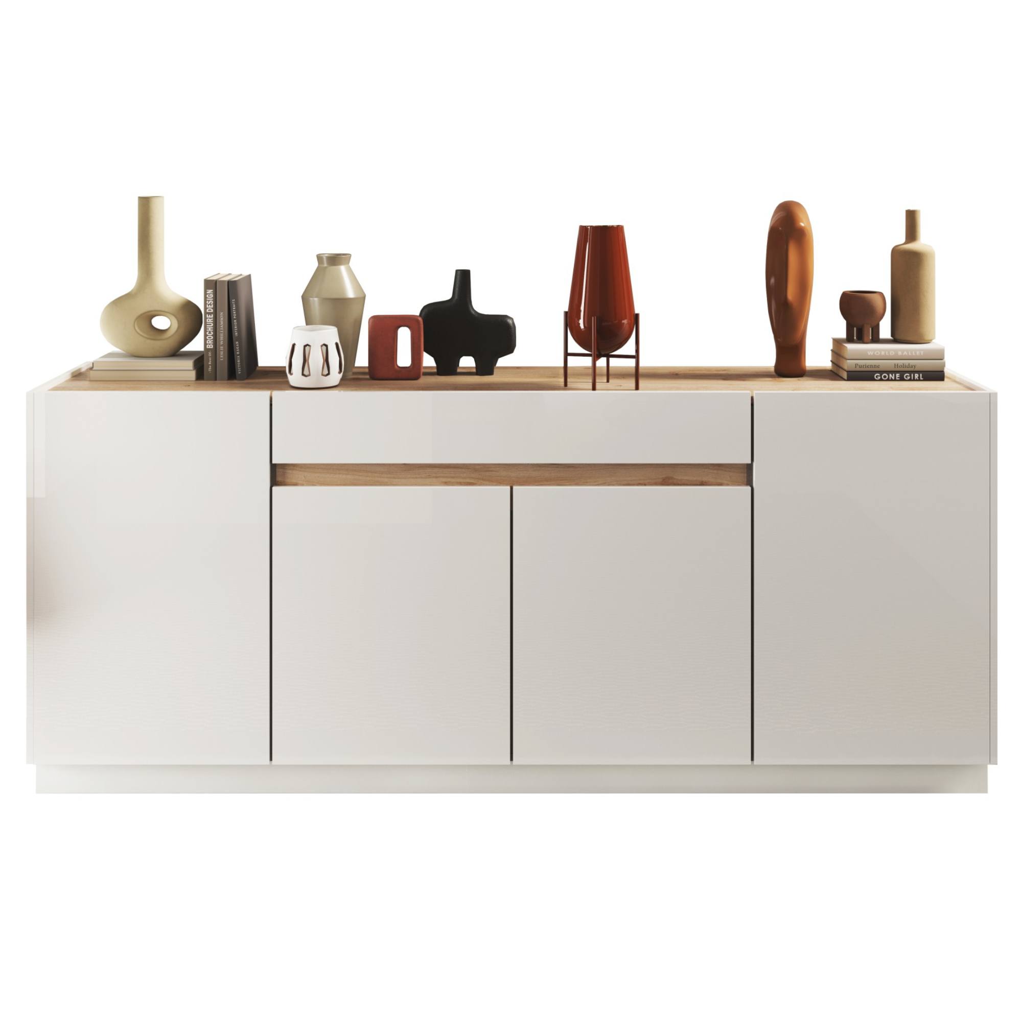 Komoda je uzatvárateľná 4 otočnými dverami. ktoré za sebou ukrývajú vložené police. Tieto police prakticky rozdeľujú vnútorný, úložný priestor a umožňujú uloženie všetkého, čo chcete mať po ruke, ale nie priamo na očiach. Komoda ďalej obsahuje 1 priestrannú zásuvku. Všetky dvere sú bezrúčkovom vyhotovení, ktoré zvýrazňuje minimalistický vzhľad komody. Vyrobená je z ľahko udržiavateľnej laminovanej drevotriesky.