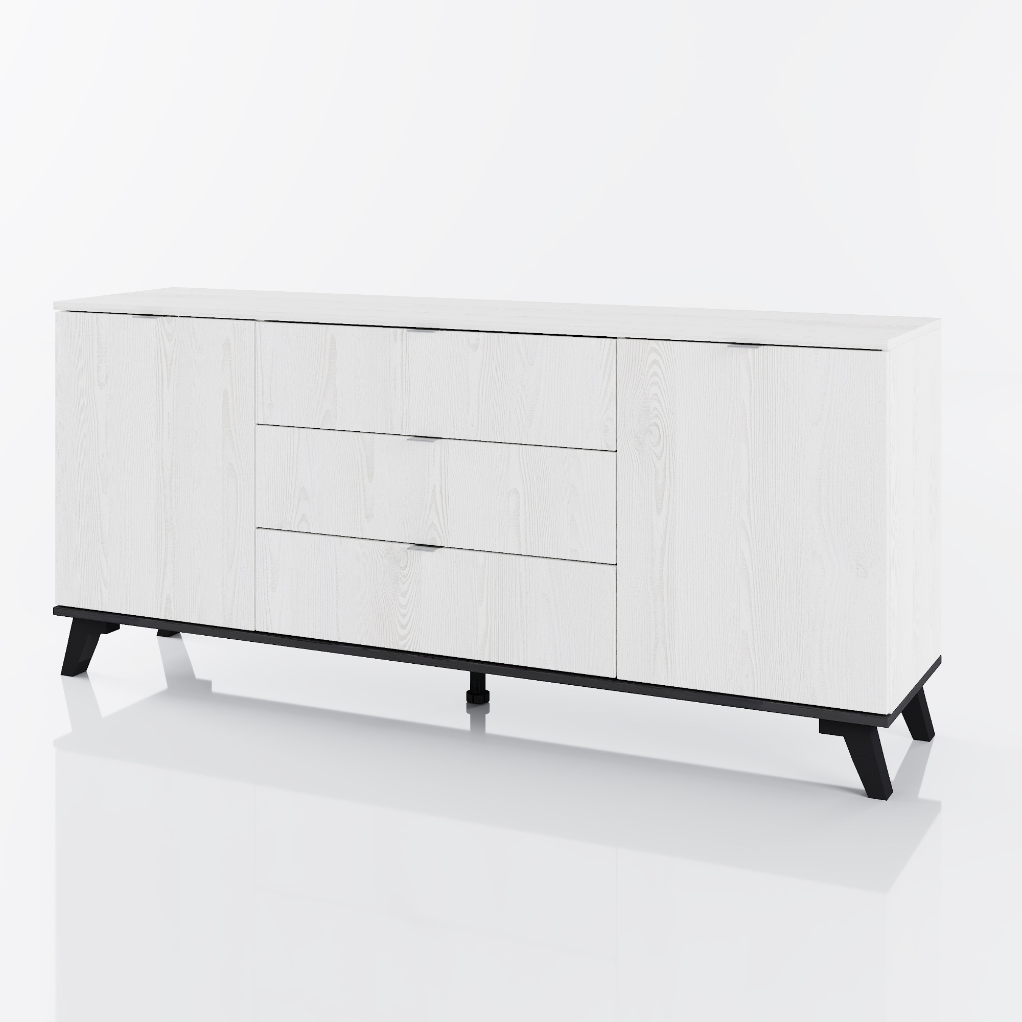 Je vyrobená z kvalitnej laminovanej drevotrieskovej dosky, ktorá je známa jednoduchou údržbou. Decentné kovové rúčky a plastové nožičky dodávajú komode minimalistický vzhľad a stabilitu. Disponuje na každej strane jednými otočnými dvierkami, za ktorými sa skrýva jedna vložená polica. Uprostred sa nachádzajú tri zásuvky.