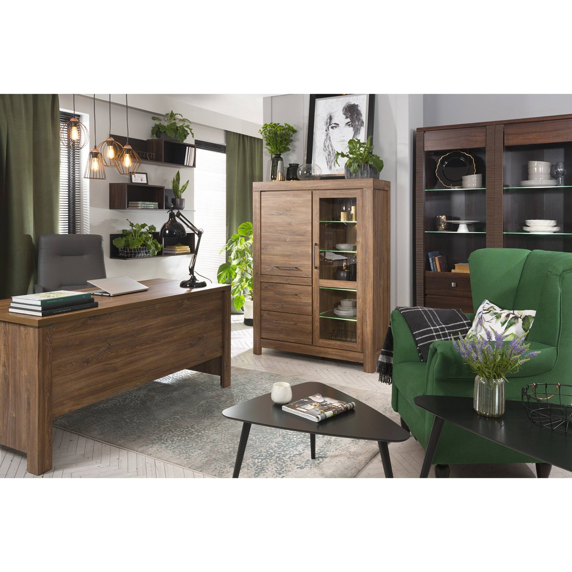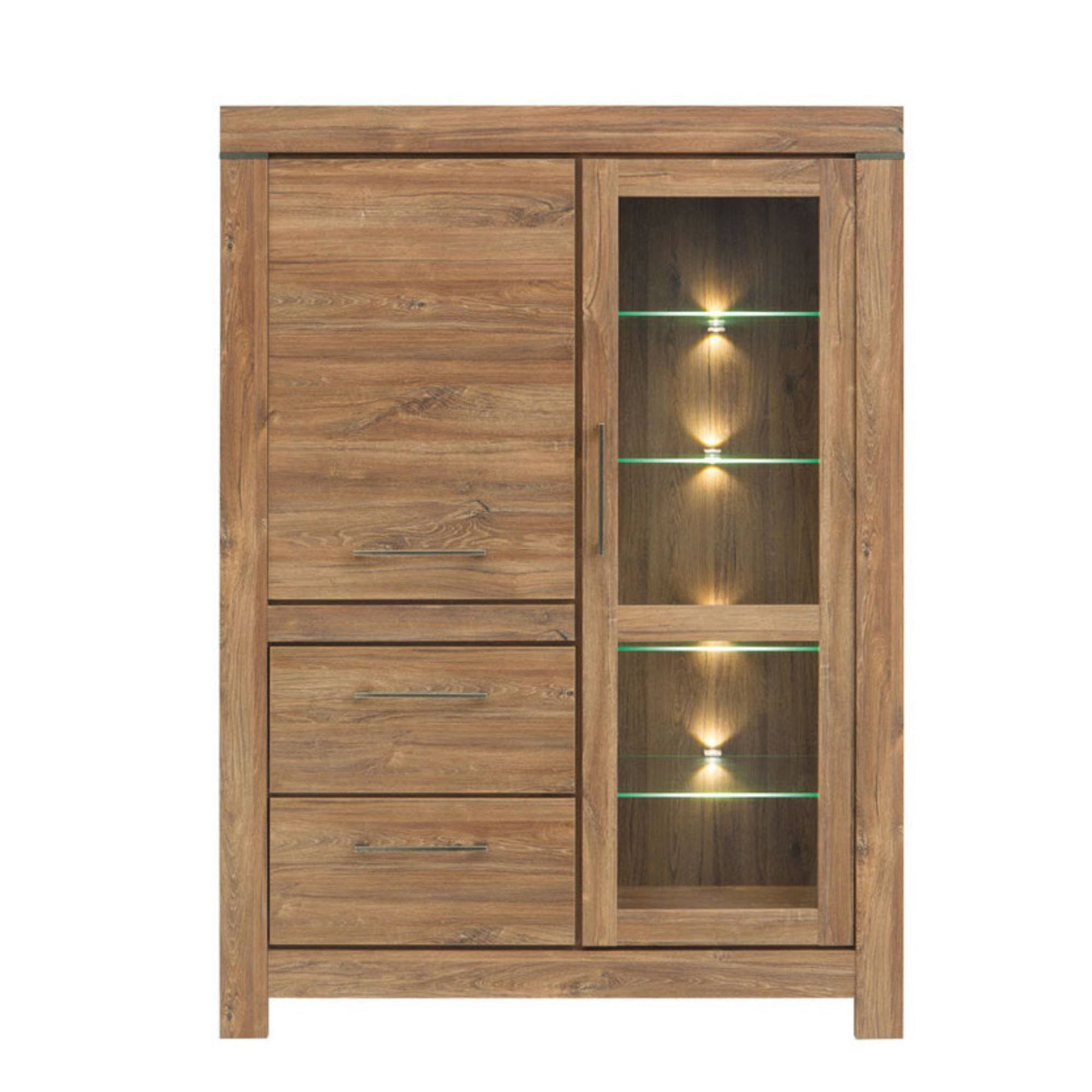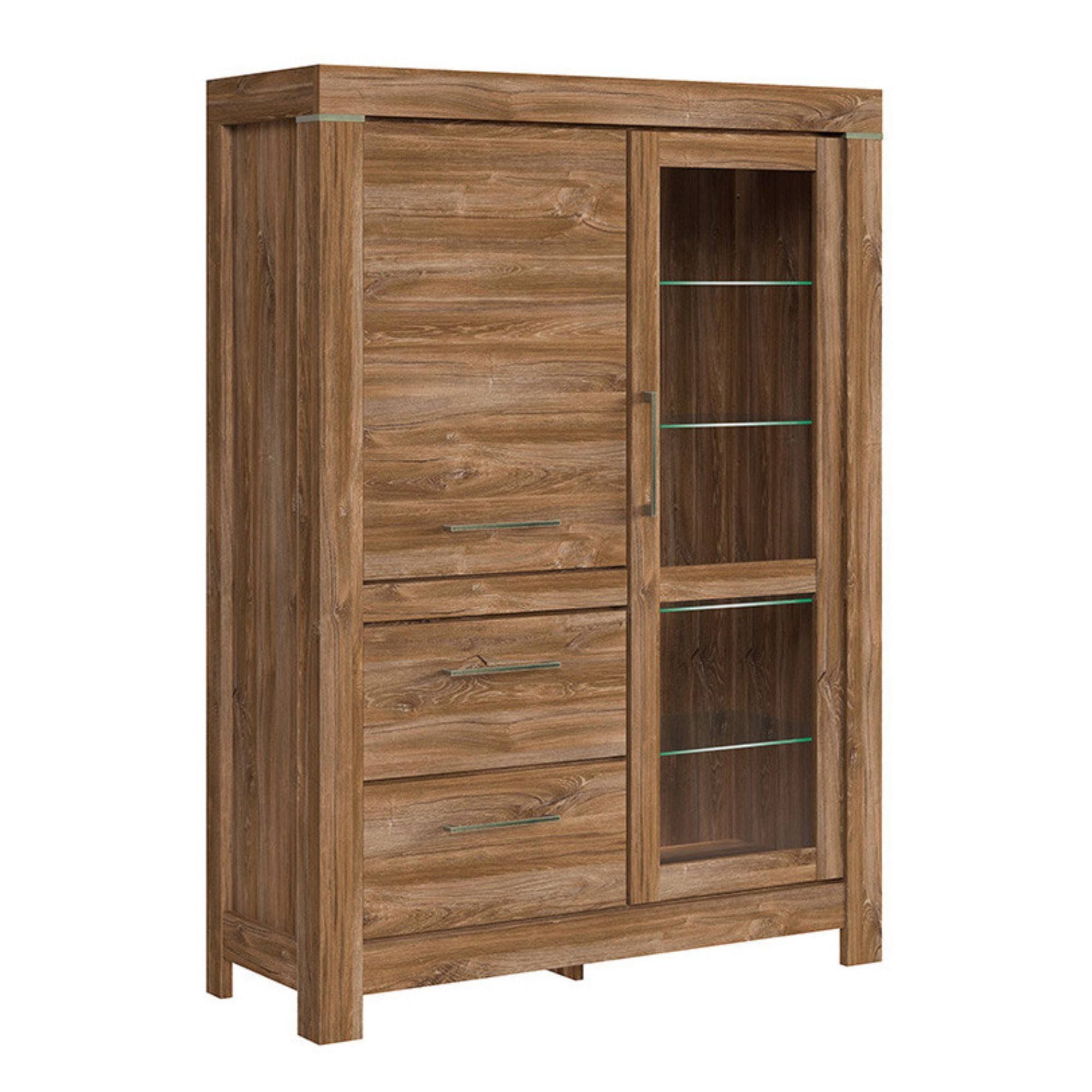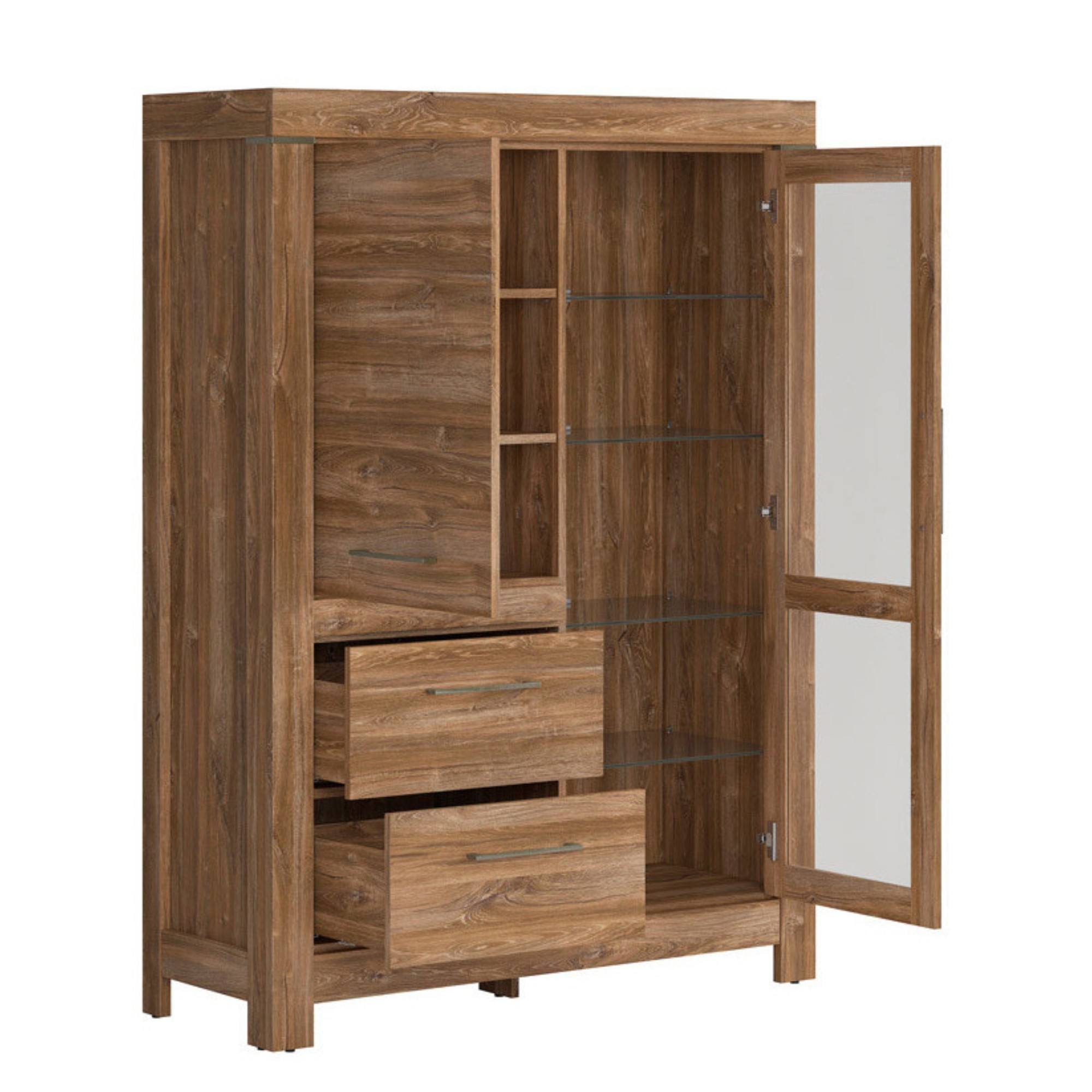 Vysoká komoda GERMAN 1 poskytne veľkorysý odkladací a úložný priestor a podčiarkne výraz celej miestnosti. Vďaka orámovaniu pripomína klasický drevený nábytok. Pôsobí masívnym dojmom a očarí vás výraznou kresbou dreva. Presklená časť vám dá priestor na vystavenie sviatočného riadu, pohárov alebo dekorácií, priestor za plnými dvierkami poskytne kryté miesto na všetko, čo potrebujete mať po ruke, ale nechcete vystavovať na očiach. Či už komodu GERMAN 1 umiestnite kamkoľvek, budete sa vďaka nej cítiť naozaj doma.