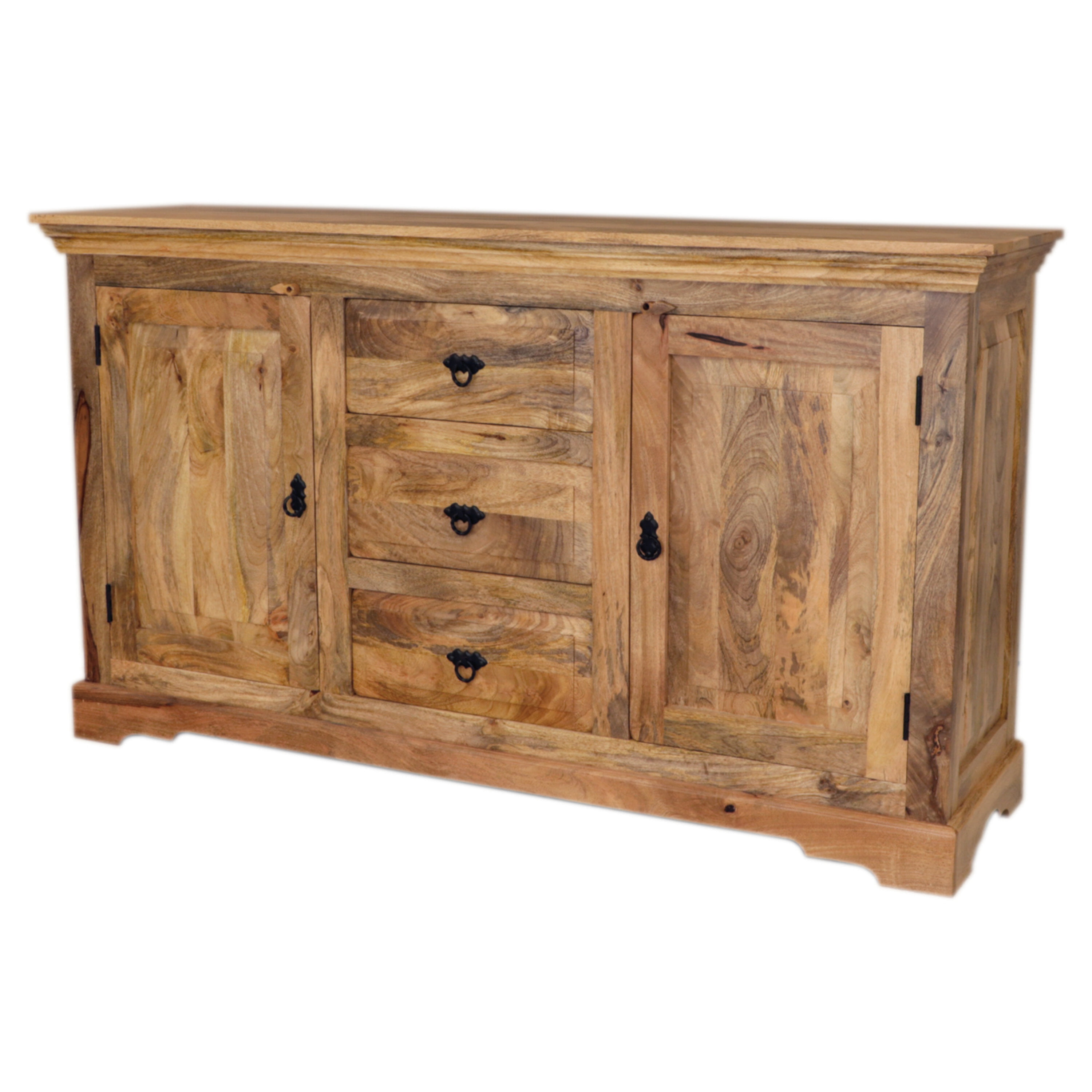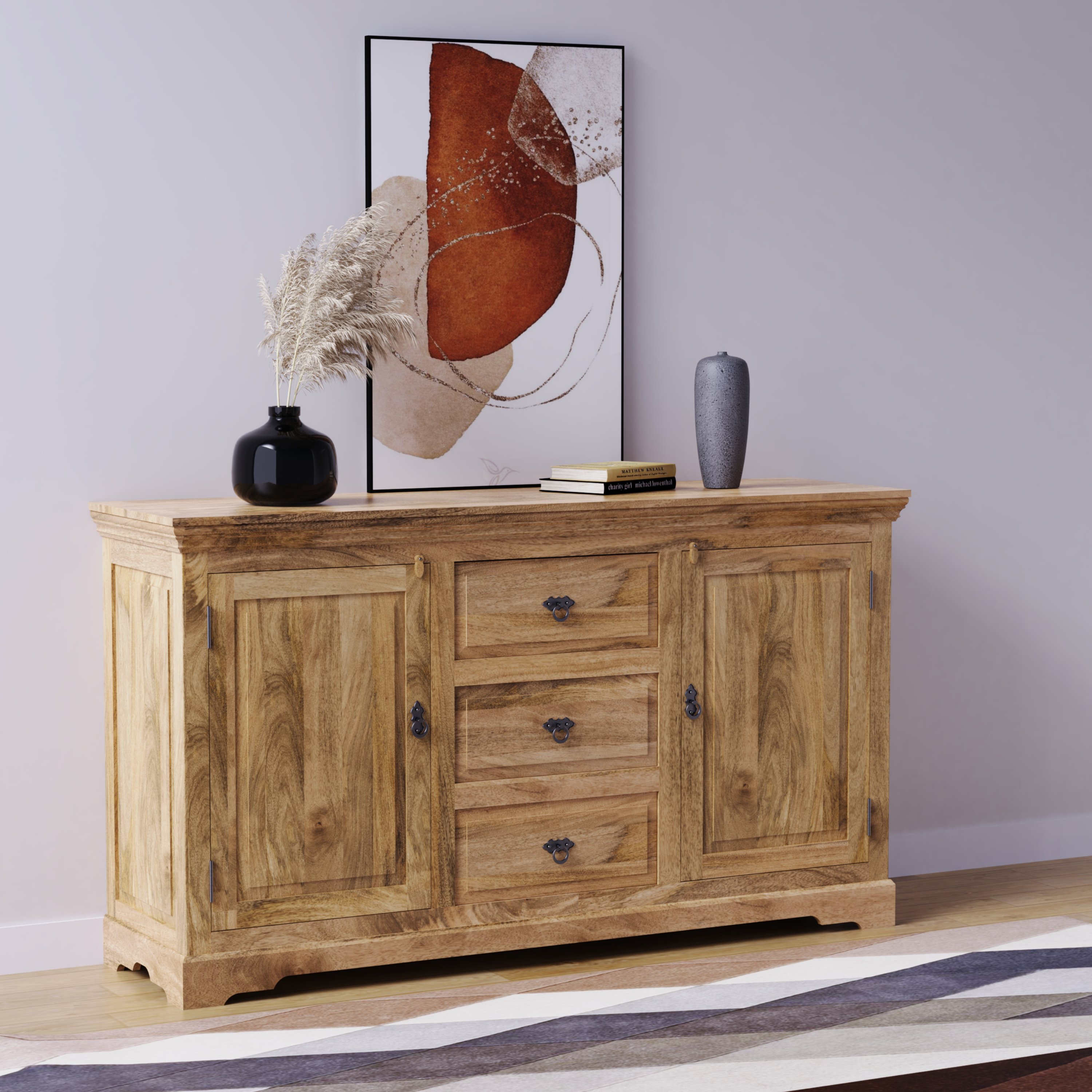 Úložný priestor je rozdelený na 3 zásuvky a dvierka s policami na otváranie ktorých slúžia kovové rúčky. Konštrukcia komody je vyrobená z masívneho mangového dreva v prírodnom spracovaní bez povrchovej úpravy. Vďaka použitému materiálu je komoda nielen pevná, ale tiež disponuje dlhou životnosťou. Prirodzená kresba dreva, sfarbenie a priznané nedokonalosti dodávajú na jedinečnosti každého kusa.