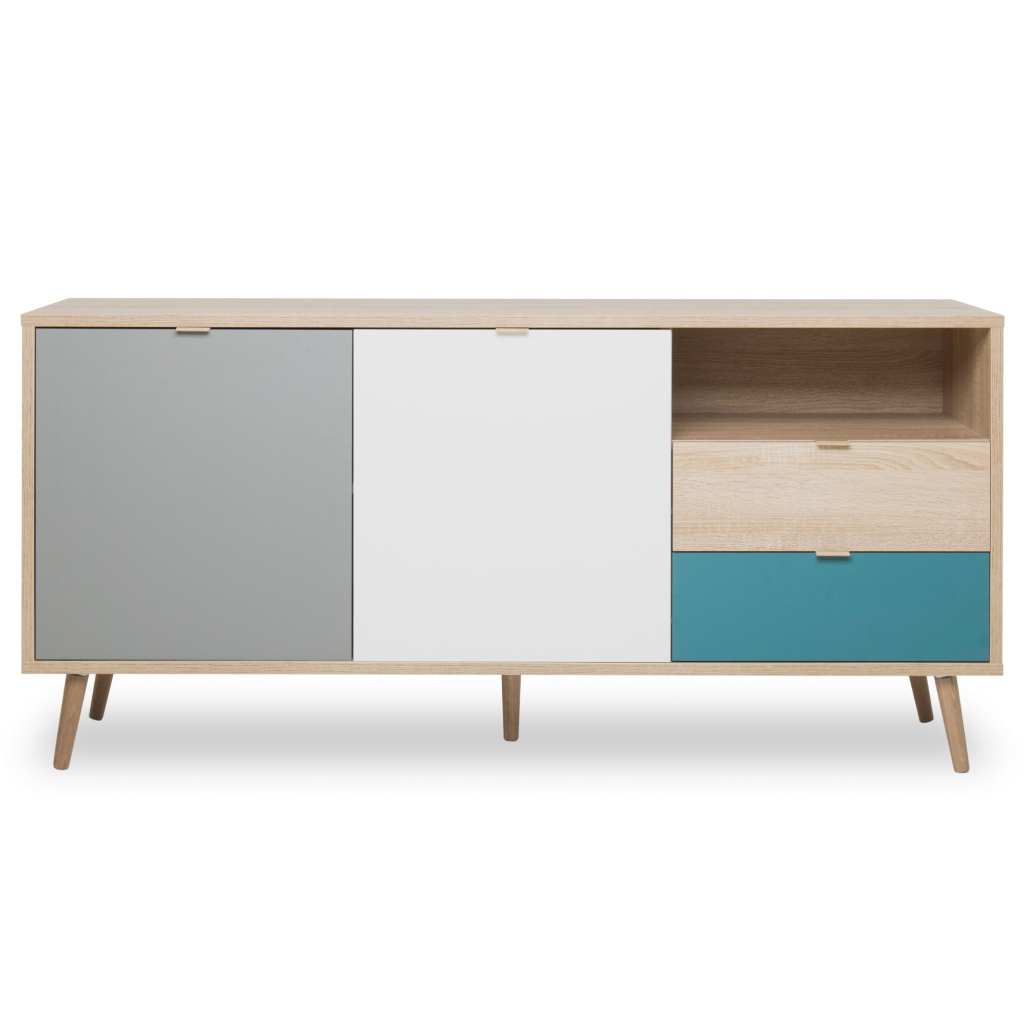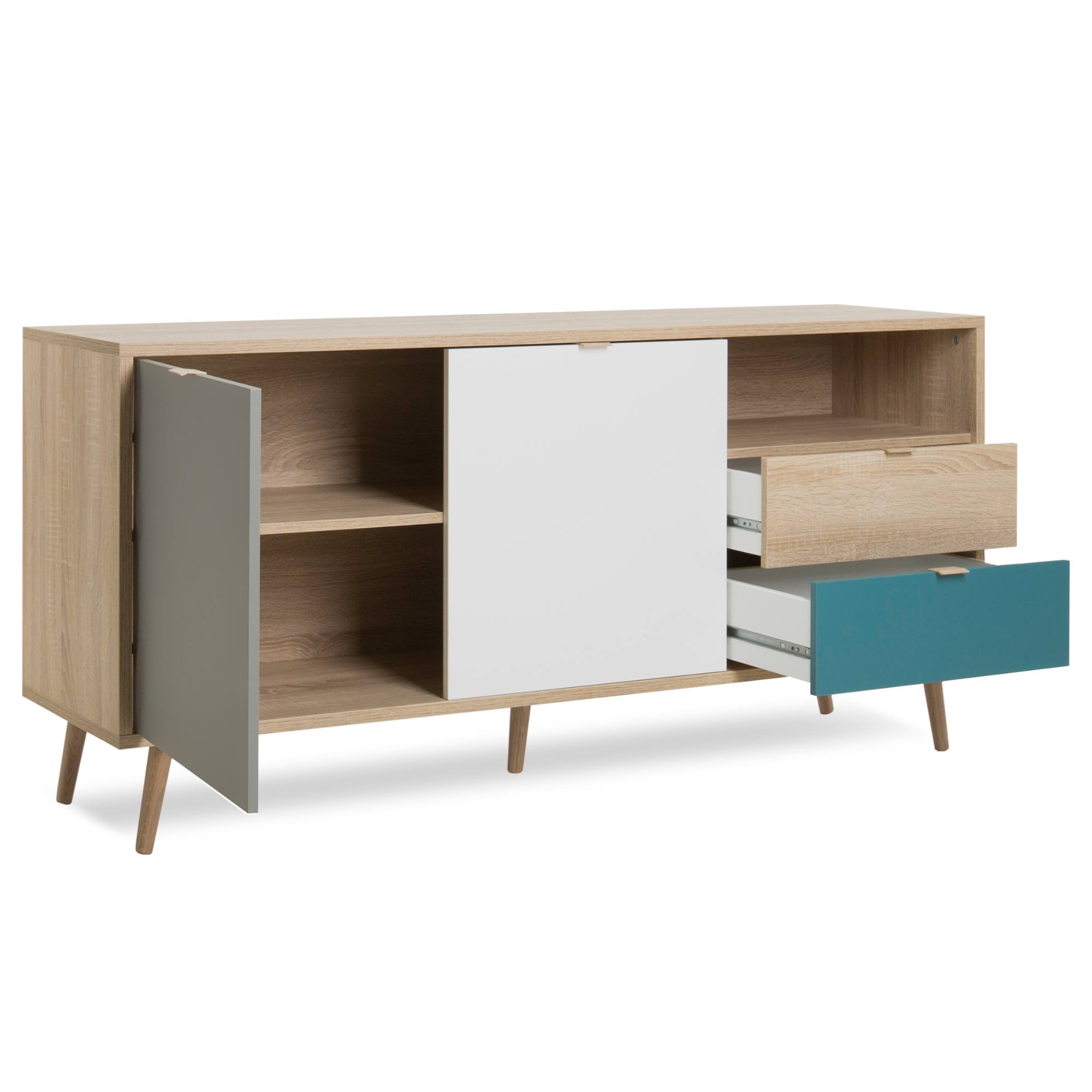 Štýlová komoda HENDRICK 51 v škandinávskom štýle spoľahlivo dodá vášmu domovu luxusný vzhľad. S dekorom duba sonoma v kombinácii bielej a sivej farby a diagonálne postavenými nohami pôsobí čistým dojmom, čo pristane modernému interiéru.