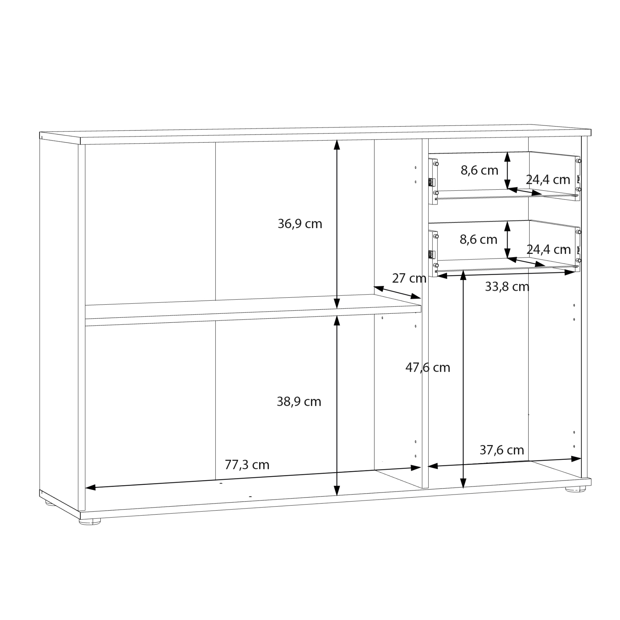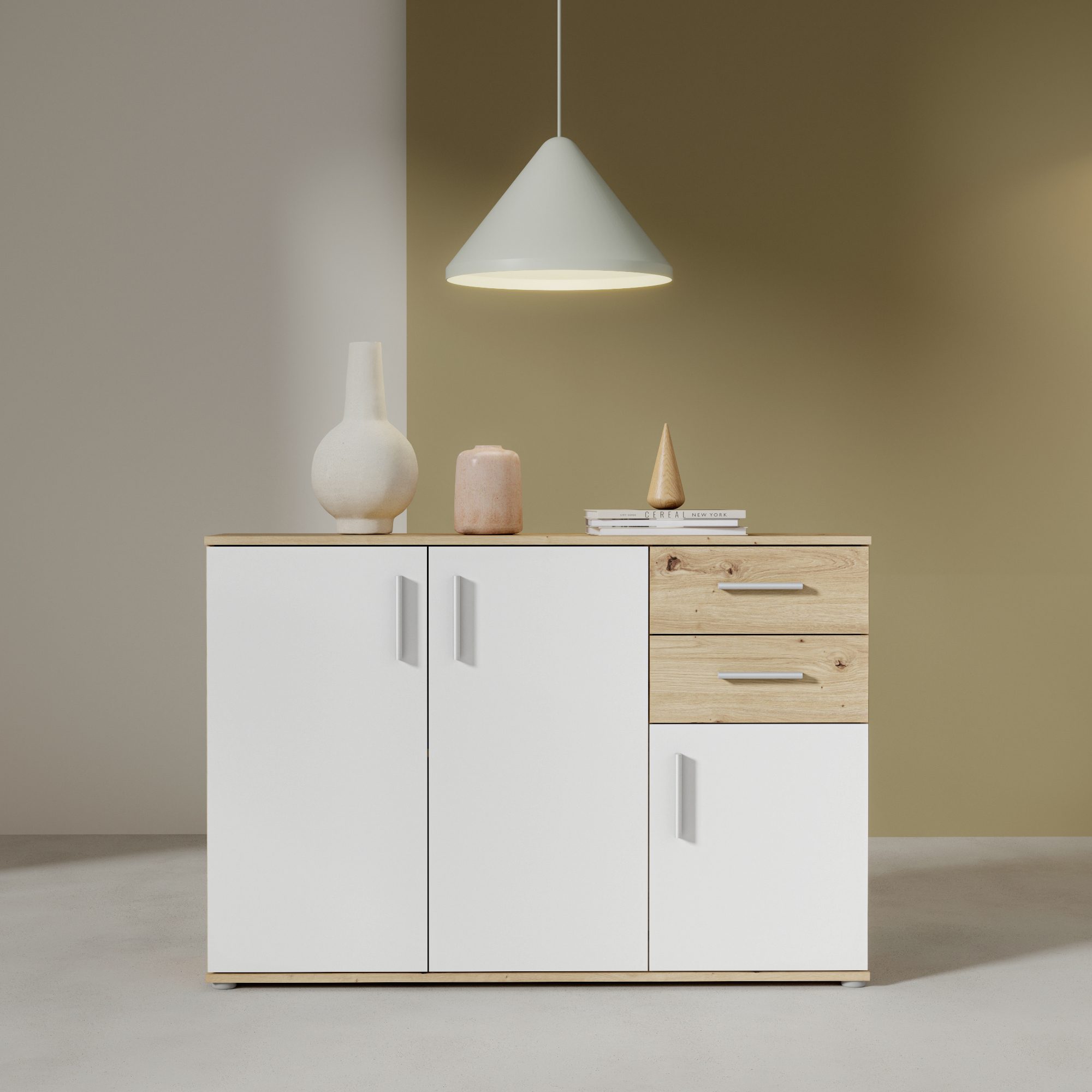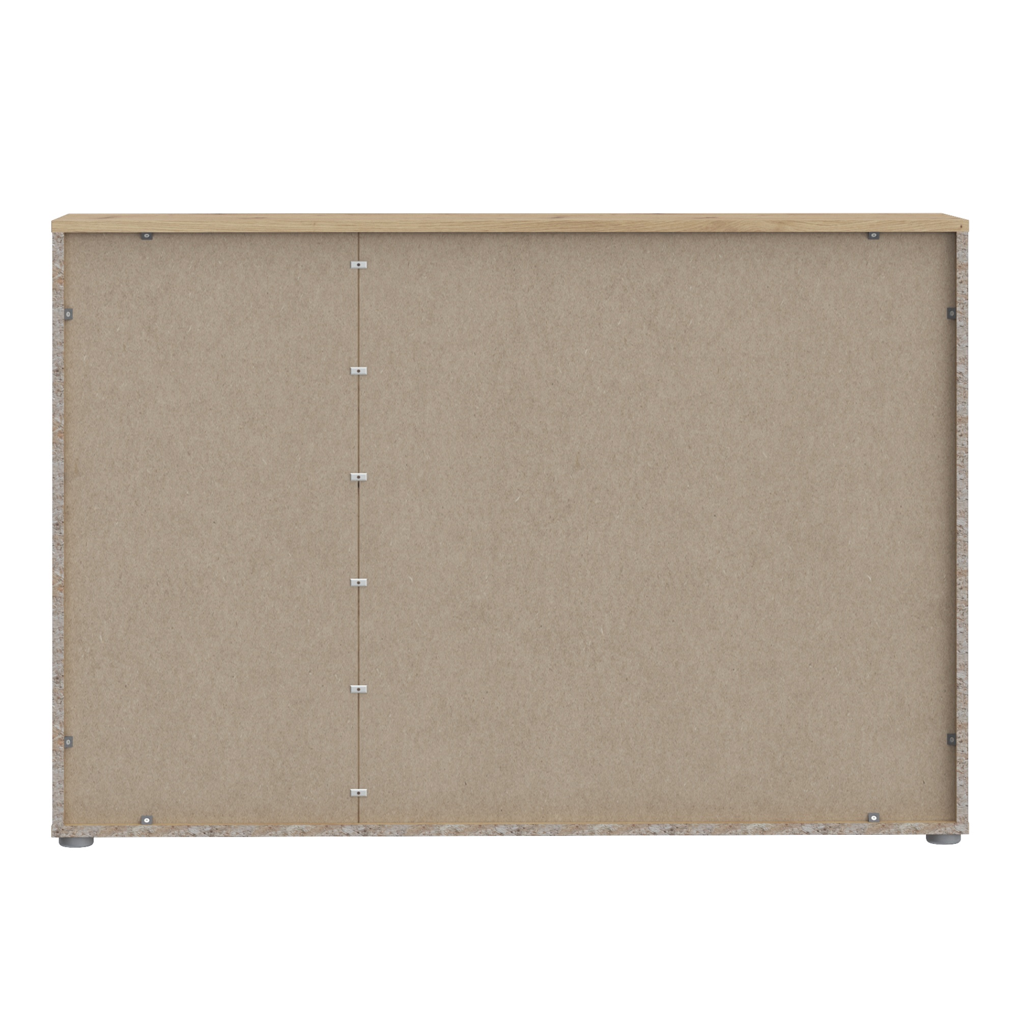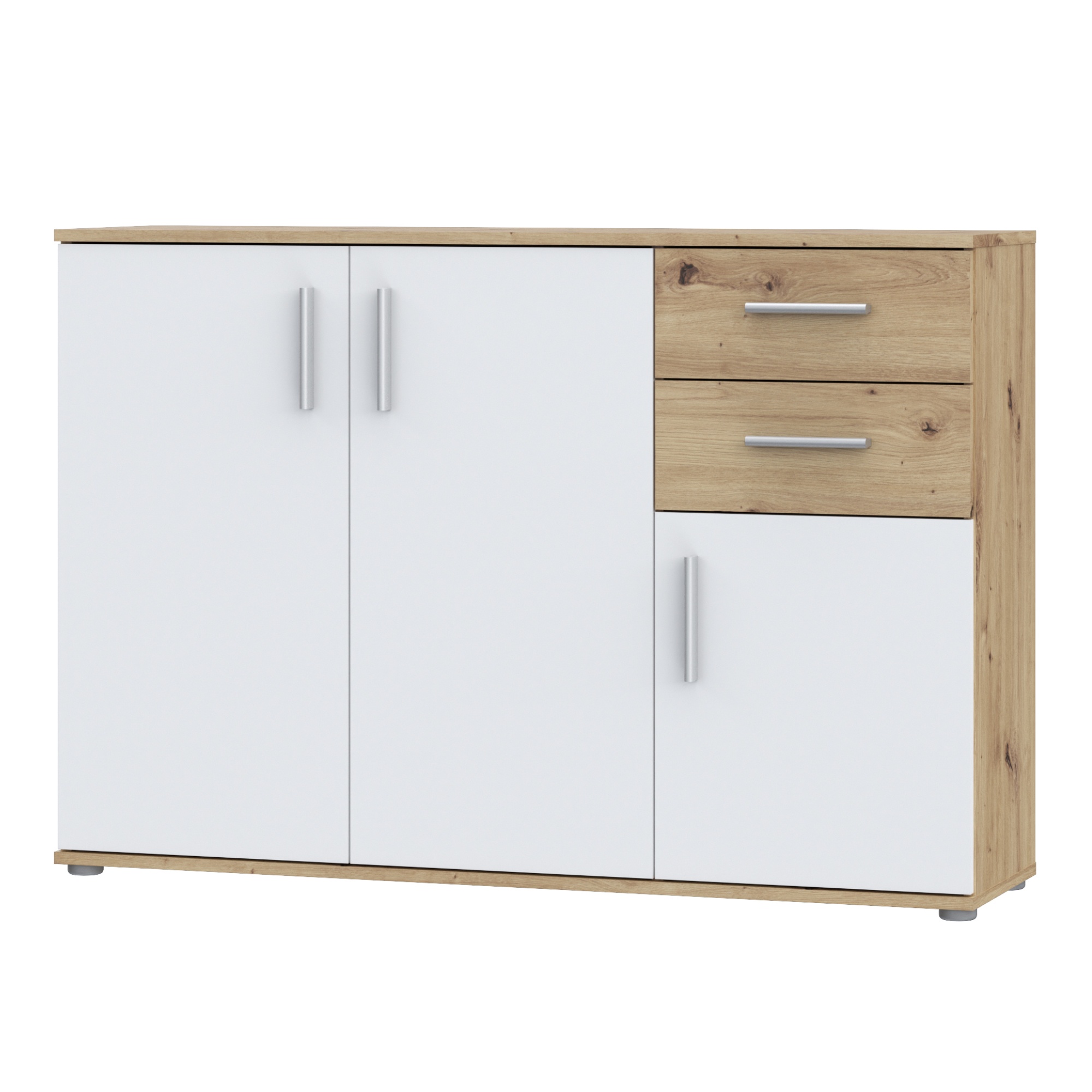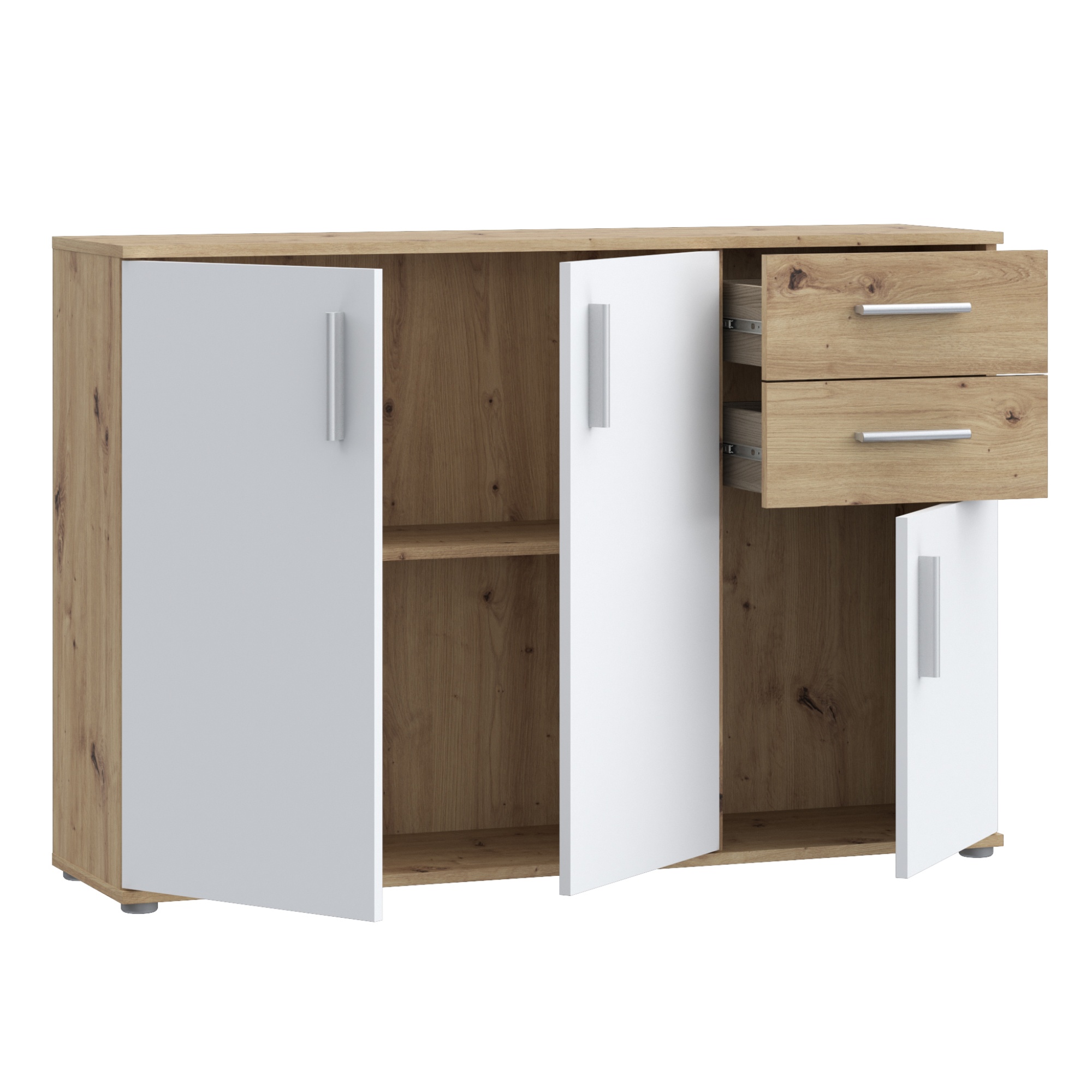 Komodu uzatvára dvojica zásuviek a trojica klasických dvierok, ktoré umožňujú naplno využiť vnútorný priestor. Za nimi sa ukrýva prepojený priestor s 1 vloženou policou a druhý oddelený priestor. Vďaka prakticky rozdelenému vnútornému priestoru uložíte všetko, čo nechcete mať priamo na očiach. Celkový dojem dotvárajú decentné plastové rúčky, ktoré uľahčujú manipuláciu s dvierkami a zásuvkami. K celkovej stabilite komody prispievajú nenápadné nôžky.