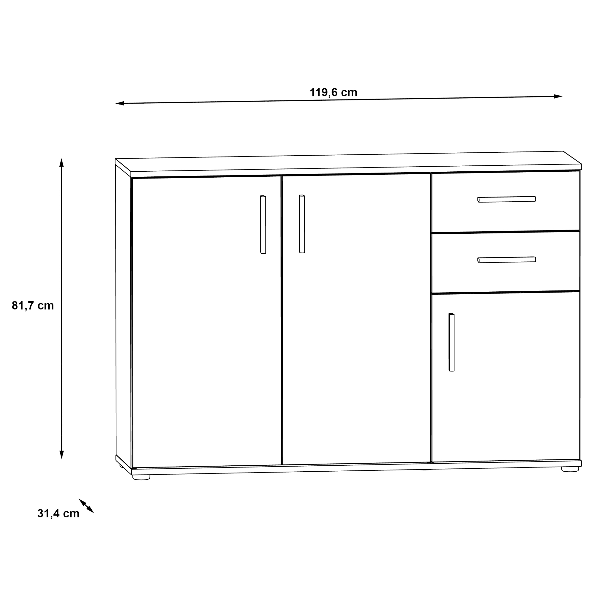 Komodu uzatvára dvojica zásuviek a trojica klasických dvierok, ktoré umožňujú naplno využiť vnútorný priestor. Za nimi sa ukrýva prepojený priestor s 1 vloženou policou a druhý oddelený priestor. Vďaka prakticky rozdelenému vnútornému priestoru uložíte všetko, čo nechcete mať priamo na očiach. Celkový dojem dotvárajú decentné plastové rúčky, ktoré uľahčujú manipuláciu s dvierkami a zásuvkami. K celkovej stabilite komody prispievajú nenápadné nôžky.