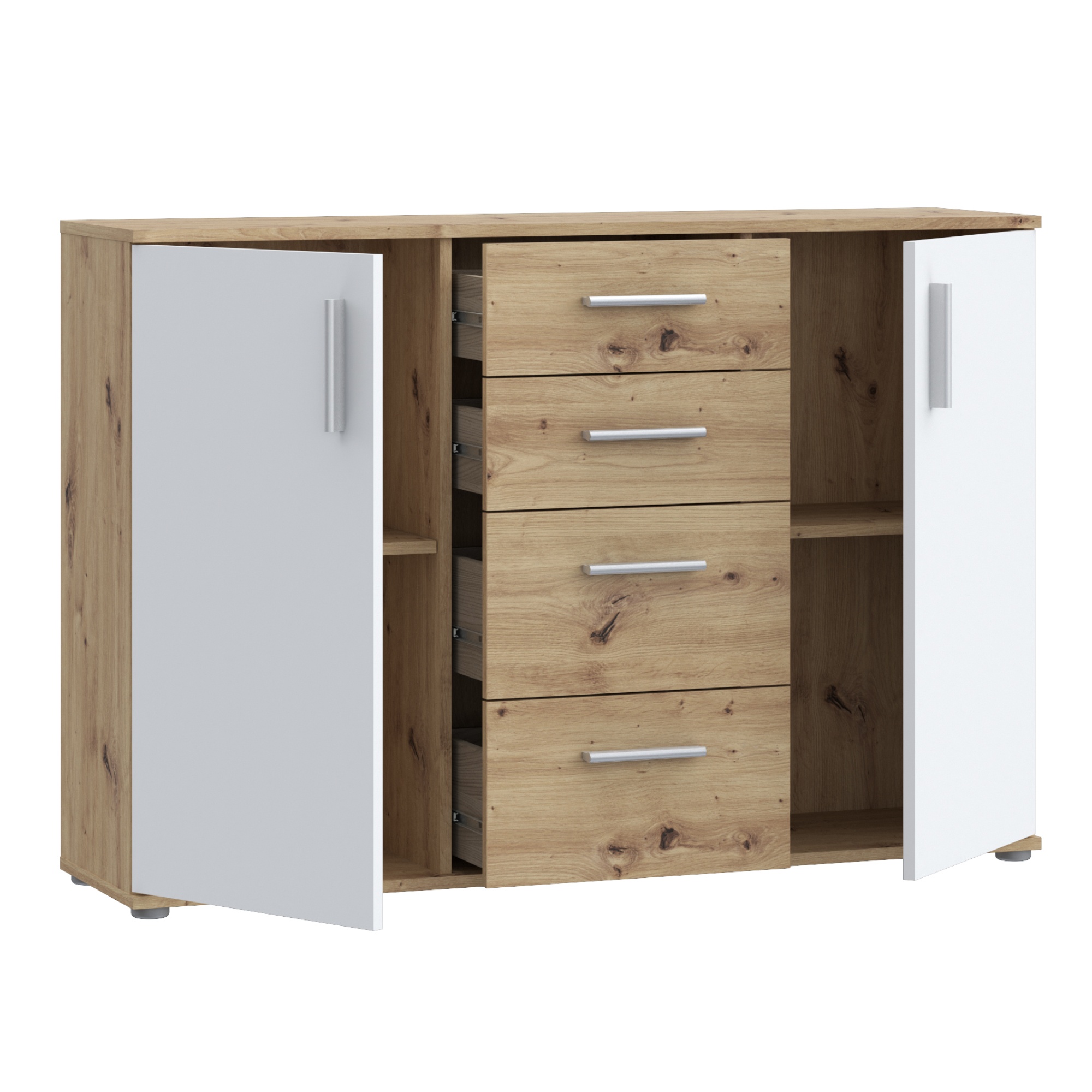 Komodu uzatvárajú 4 zásuvky a 2 klasické dvierka, ktoré umožňujú naplno využiť vnútorný priestor. Za dvierkami sa ukrývajú 2 vložené police. Vďaka prakticky rozdelenému vnútornému priestoru uložíte všetko, čo nechcete mať priamo na očiach. Celkový dojem dotvárajú decentné plastové rúčky, ktoré uľahčujú manipuláciu s dvierkami a zásuvkami. K celkovej stabilite komody prispievajú nenápadné nôžky.