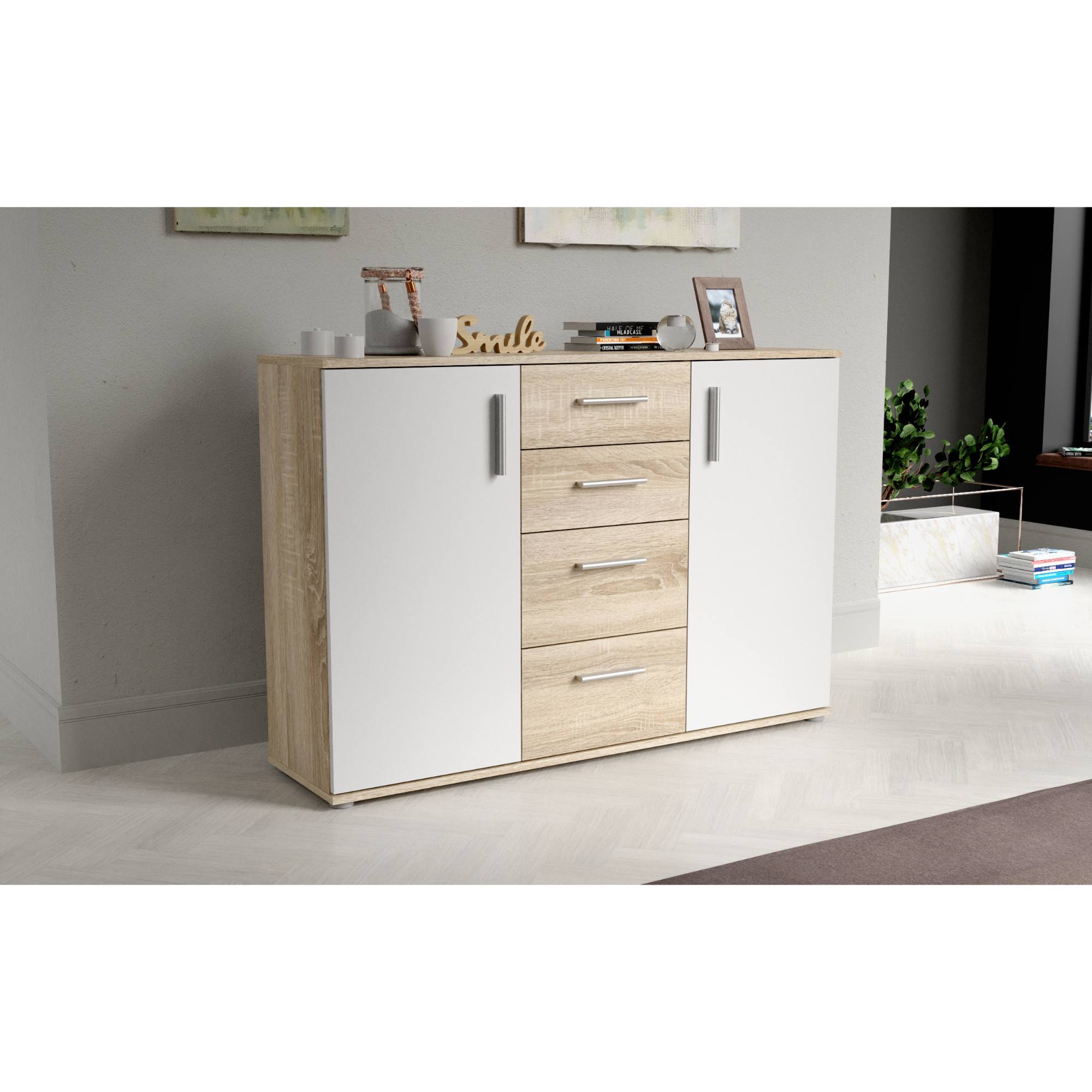 Komodu uzatvárajú 4 zásuvky a 2 klasické dvierka, ktoré umožňujú naplno využiť vnútorný priestor. Za dvierkami sa ukrývajú 2 vložené police. Vďaka prakticky rozdelenému vnútornému priestoru uložíte všetko, čo nechcete mať priamo na očiach. Celkový dojem dotvárajú decentné plastové rúčky, ktoré uľahčujú manipuláciu s dvierkami a zásuvkami. K celkovej stabilite komody prispievajú nenápadné nôžky.